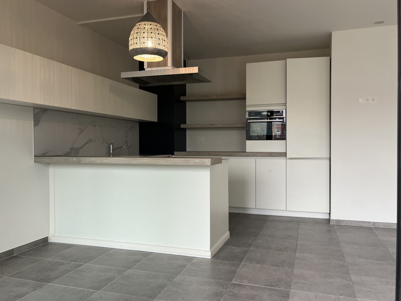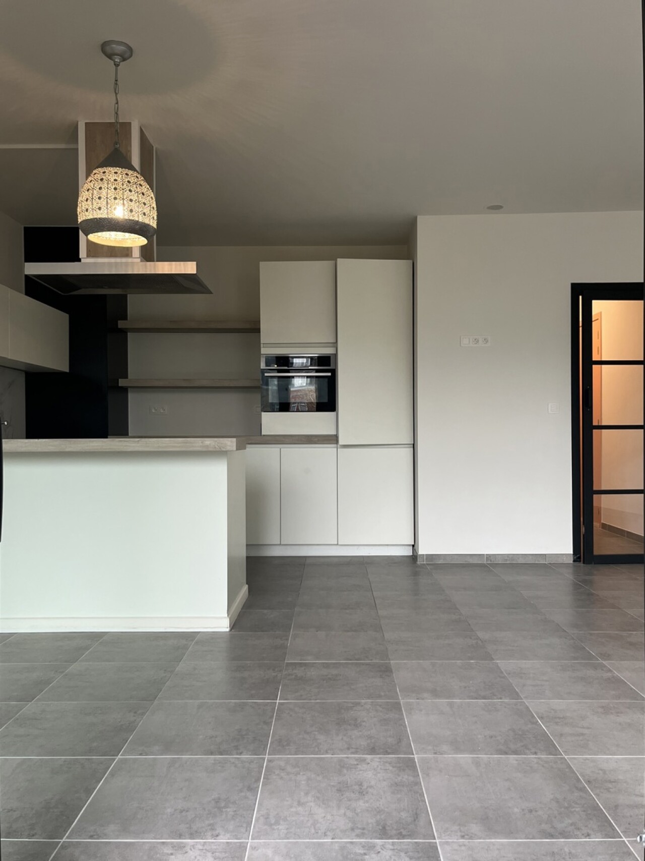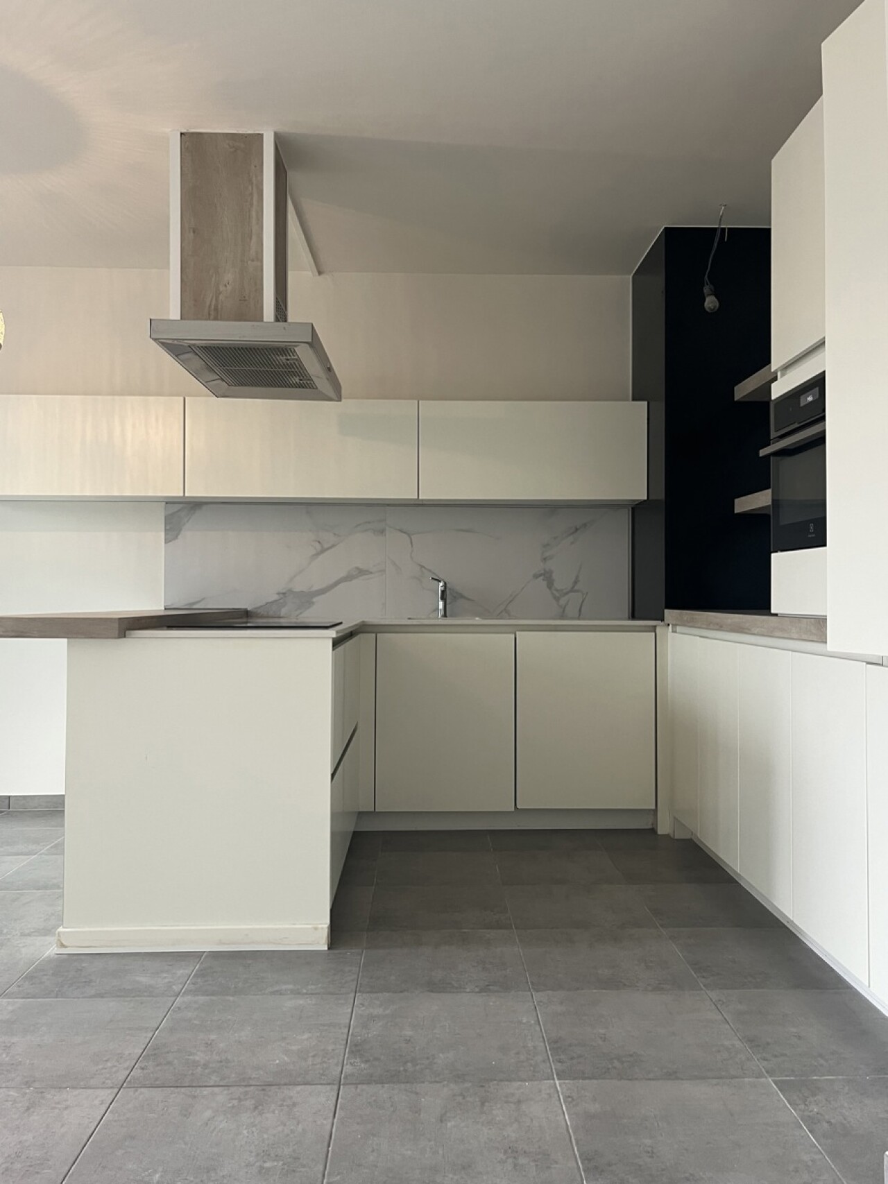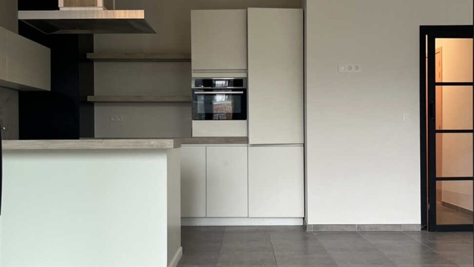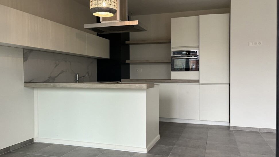 De open keuken is voorzien van composiet werkblad en toestellen: kookplaat, dampkap, oven, koelkast, vaatwas en spoelzone.