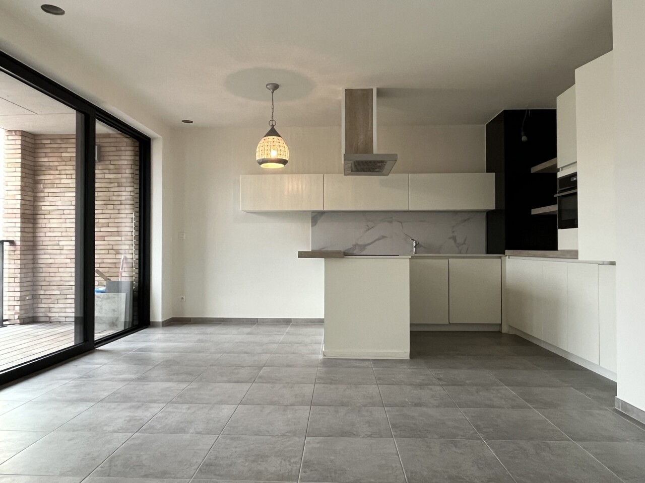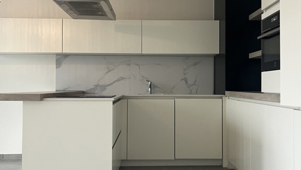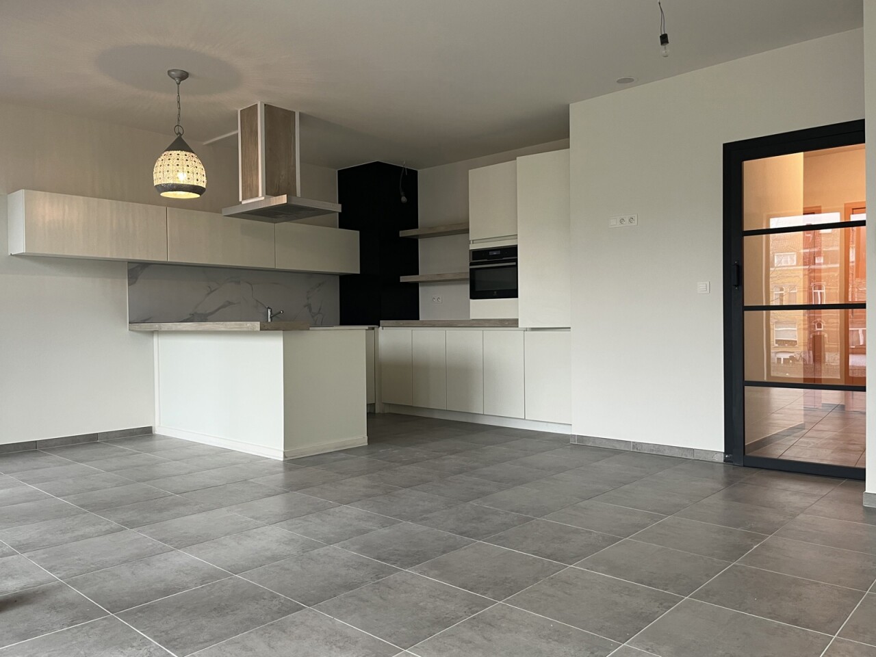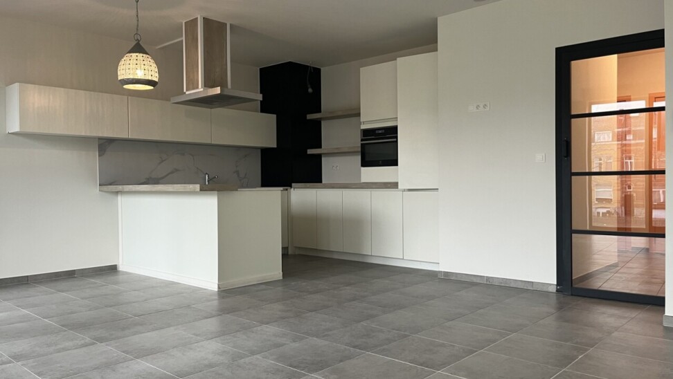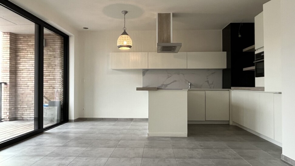 De open keuken is voorzien van composiet werkblad en toestellen: kookplaat, dampkap, oven, koelkast, vaatwas en spoelzone.