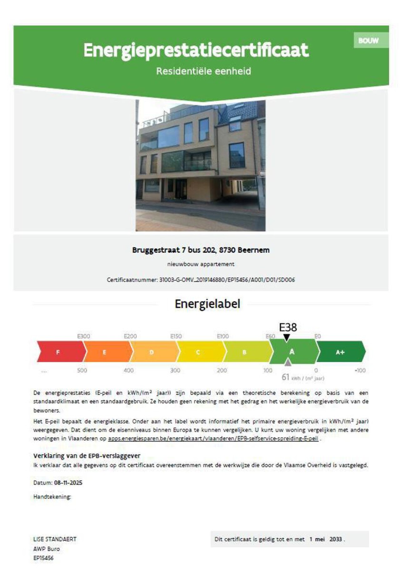Het appartement scoort goed qua energiezuinigheid dankzij z’n eigen energie met ZONNEPANELEN, vloer- muur en plafondisolatie, ventilatie,.. dit resulteert voor de huidige eigenaar in een verbruik van €46/maand voor gas en elektriciteit samen.