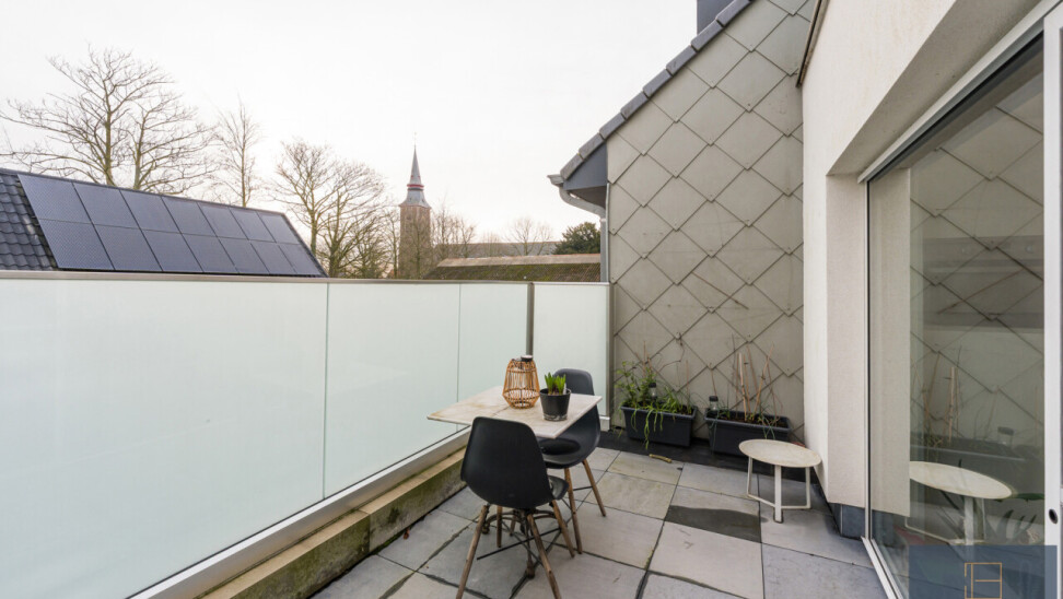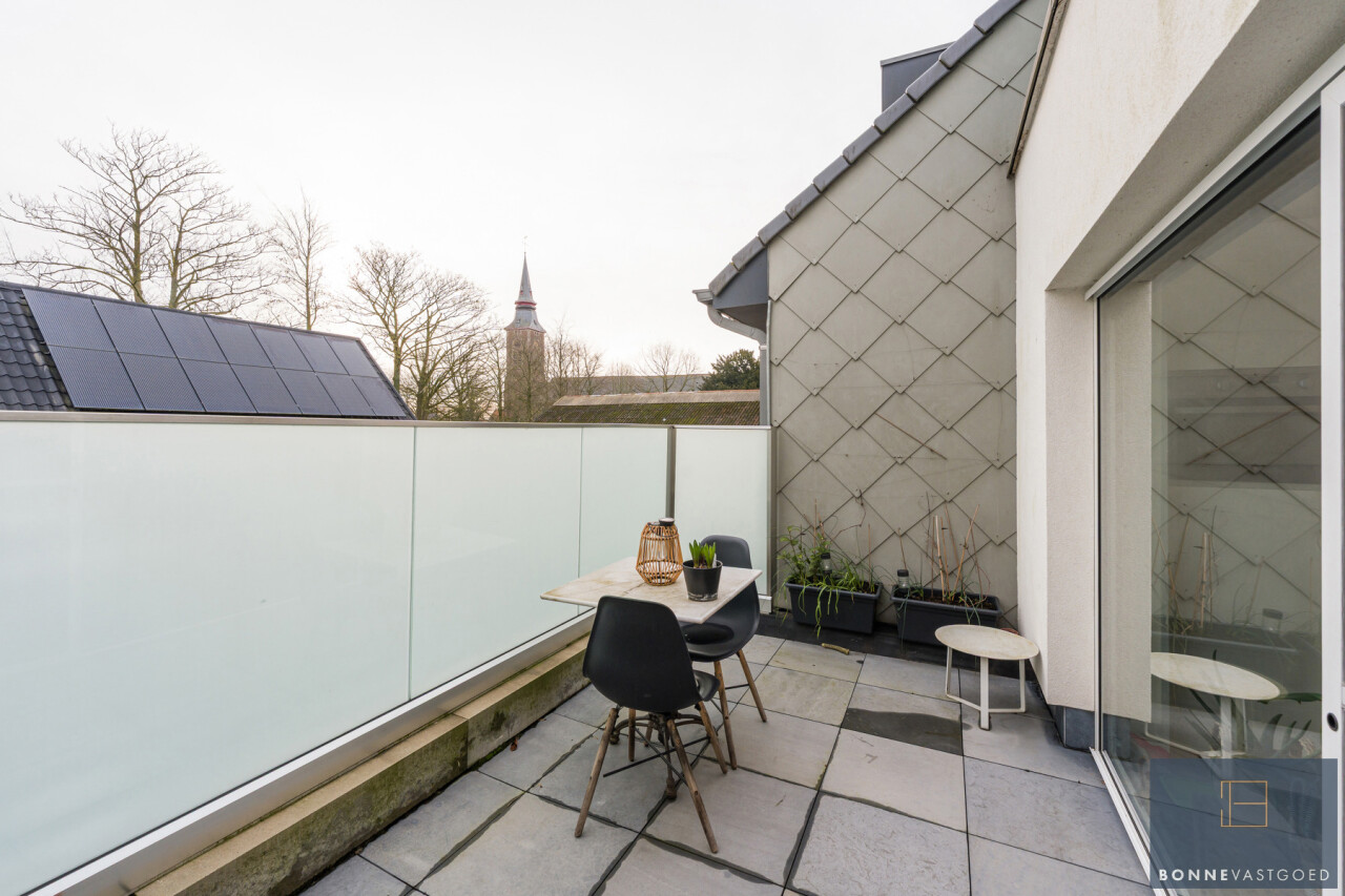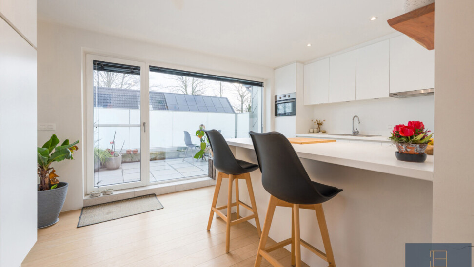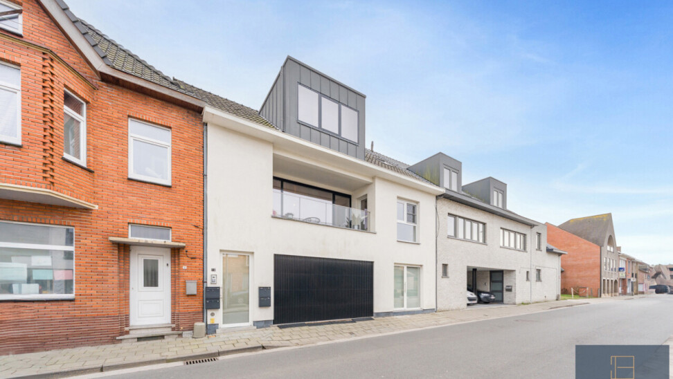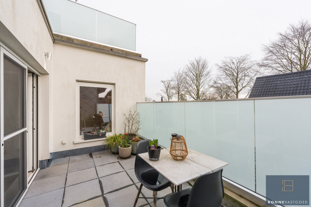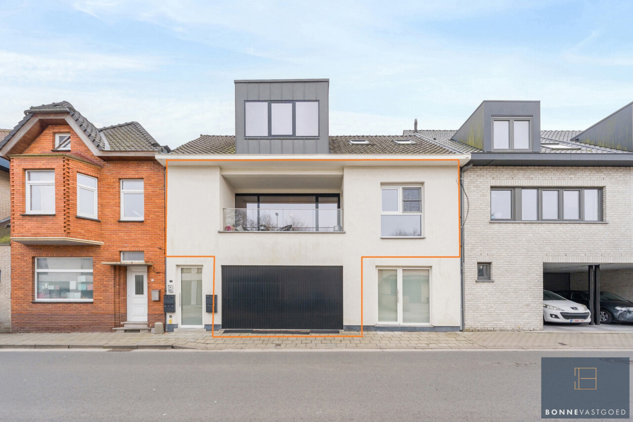 Leefruimte, keuken (met kwaliteitstoestellen: kookplaat, dampkap, combi-oven, koelkast, vaatwas en spoelzone), wasberging, dressing, 3 slaapkamers, badkamer (met ligbad, douche, toilet en dubbele lavabo), 3 terrassen én een garagebox met extra brede automatische poort en plaats voor 2 wagens.