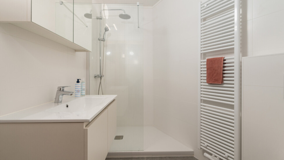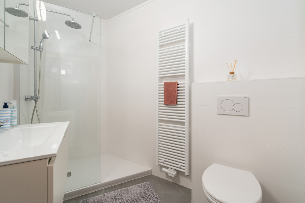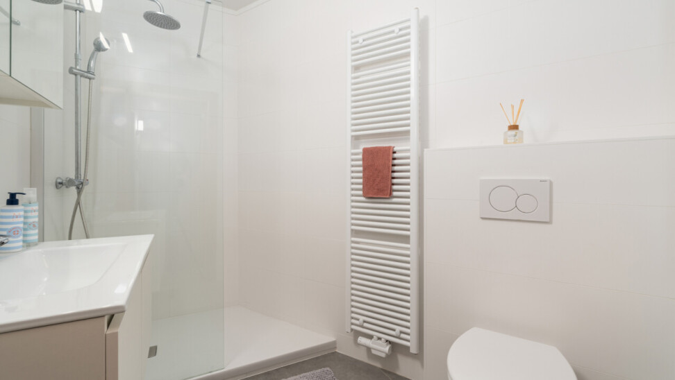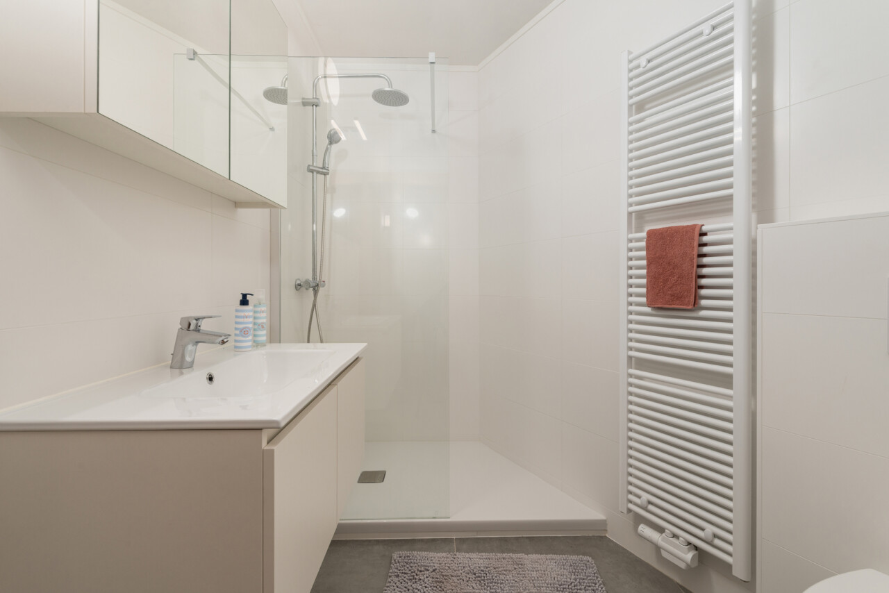 Uitgerust met een lavabo, douche, toilet en een handdoekradiator.