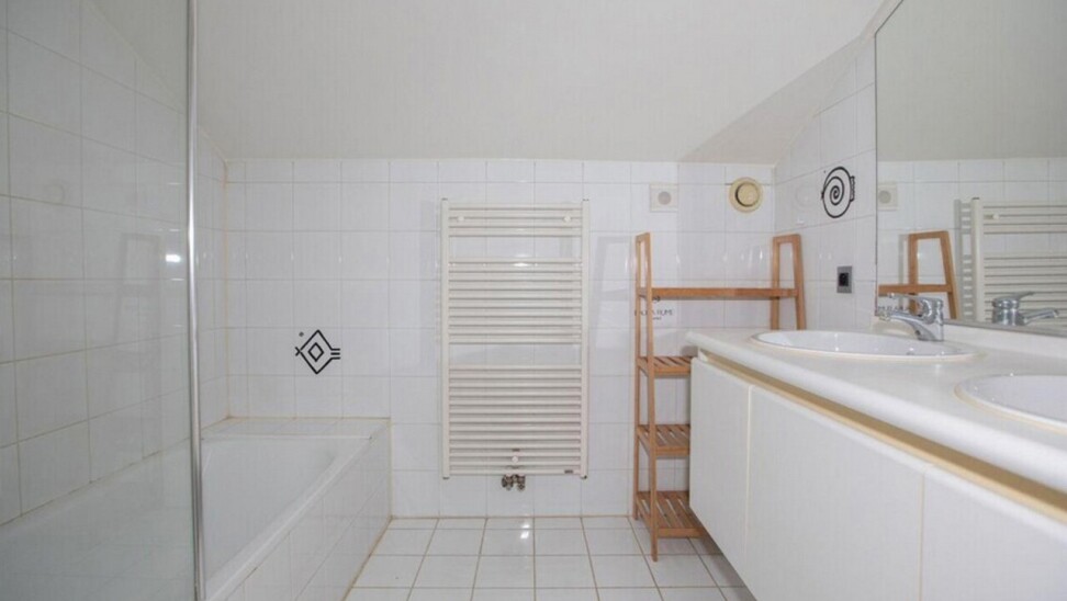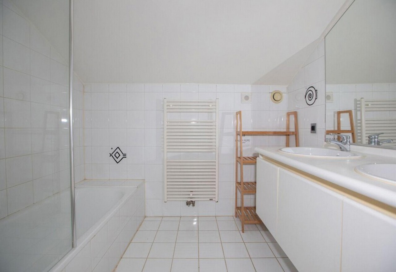 Vierde verdieping: 2 slaapkamers (21 en 13m²), badkamer met dubbele wastafel, bad met douchewand en apart toilet.