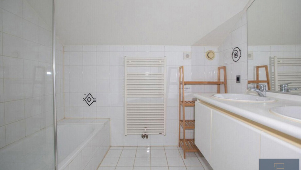 Vierde verdieping: 2 slaapkamers (21 en 13m²), badkamer met dubbele wastafel, bad met douchewand en apart toilet.