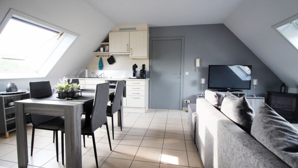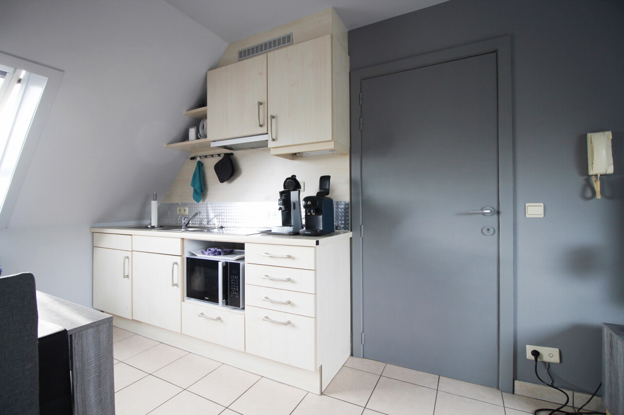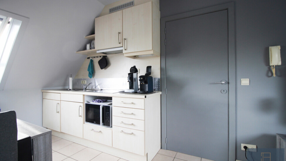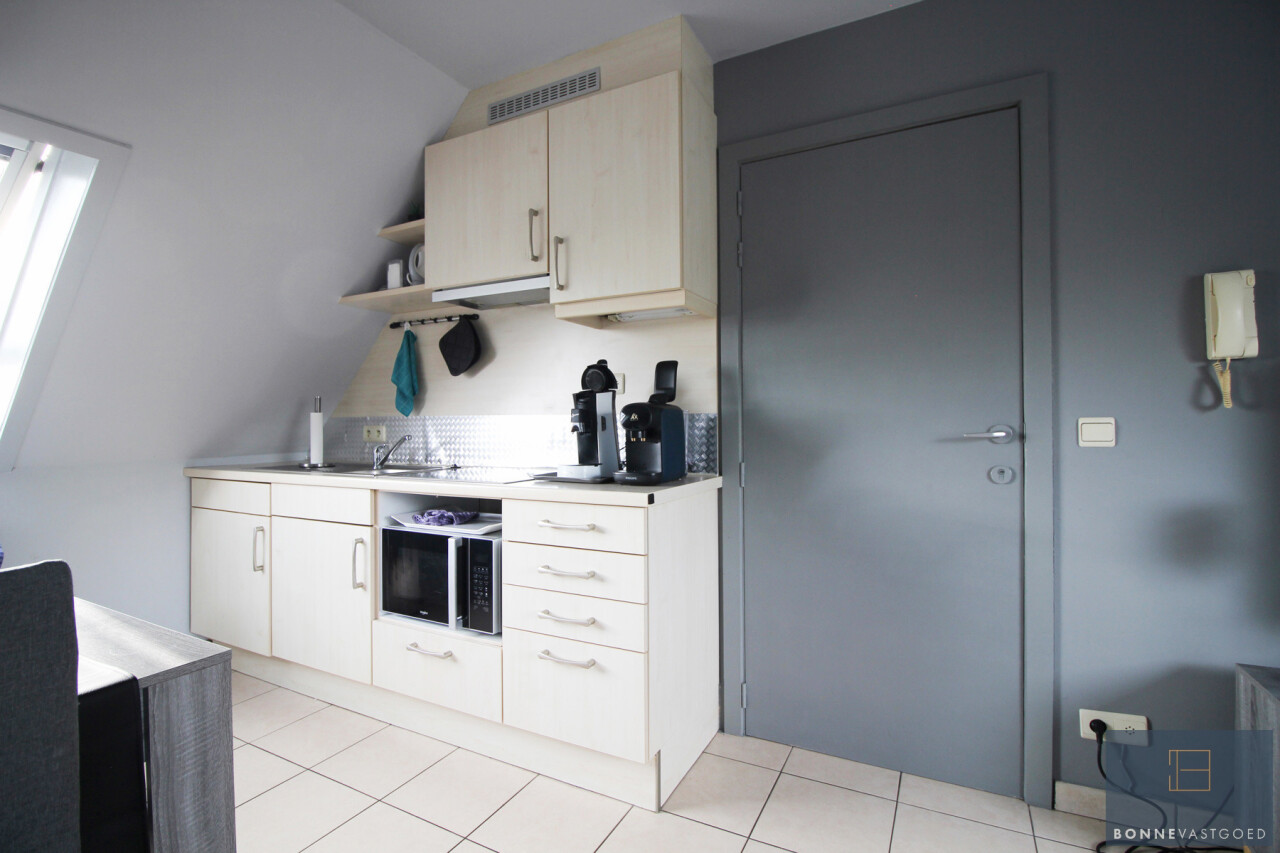 Leefruimte met kitchenette, 1 slaapkamer, badkamer met lavabo, douche en toilet en berging.