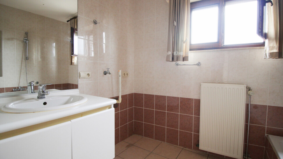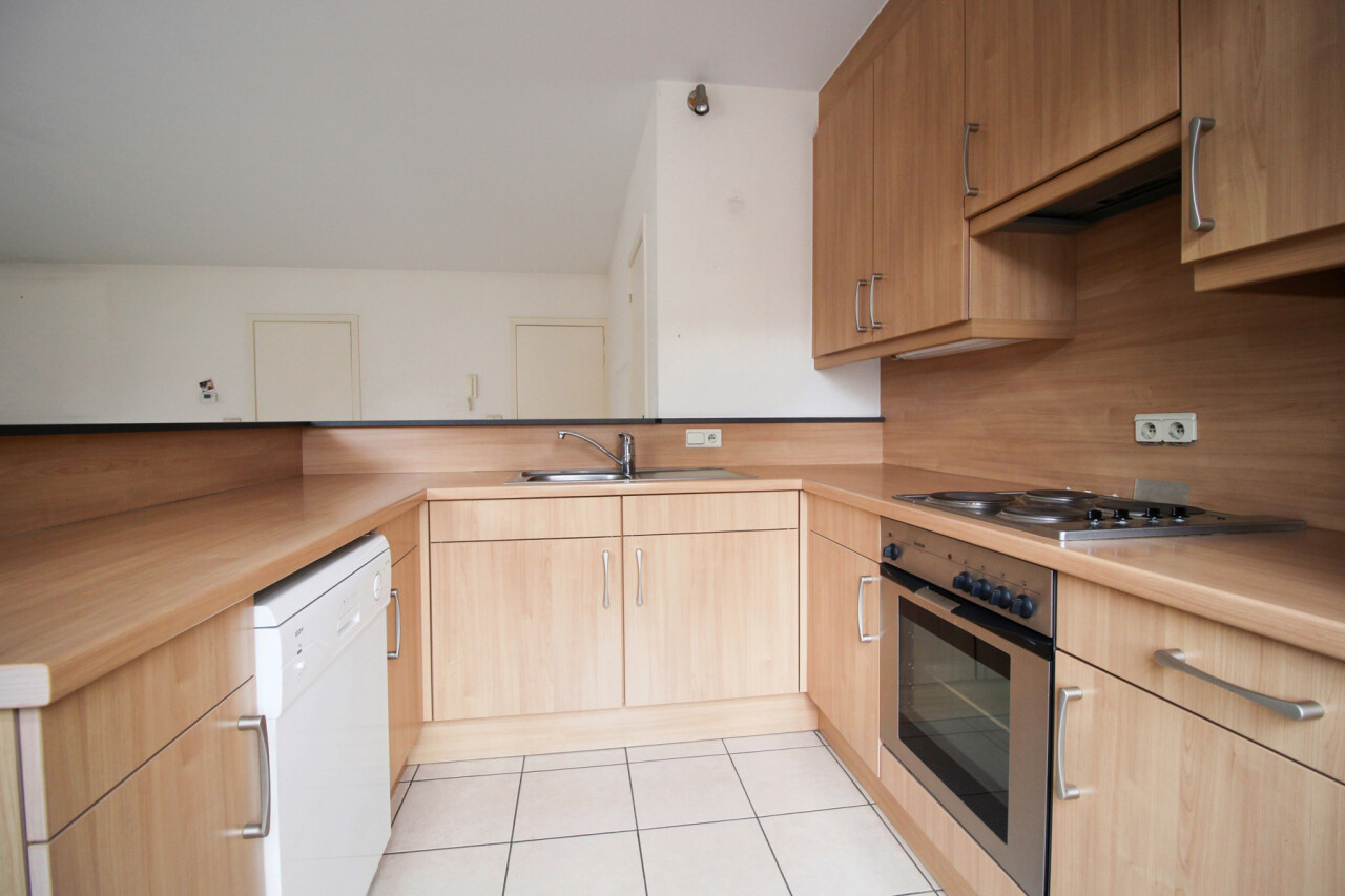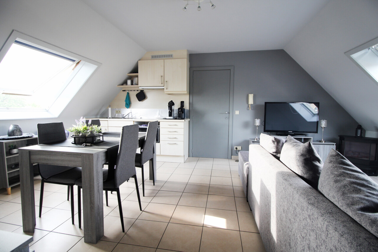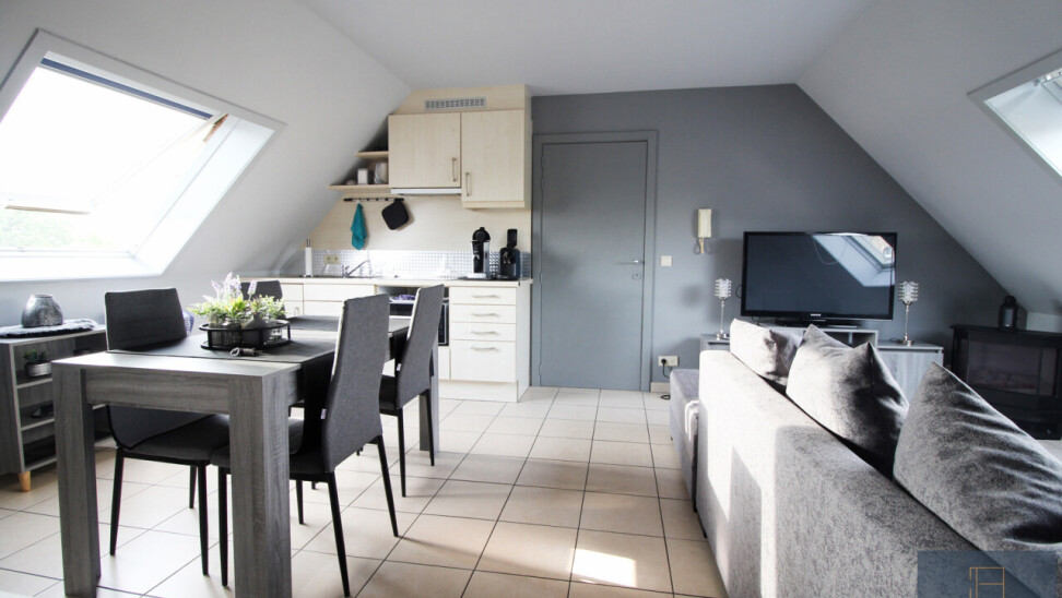 Leefruimte met kitchenette, 1 slaapkamer, badkamer met lavabo, douche en toilet en berging.