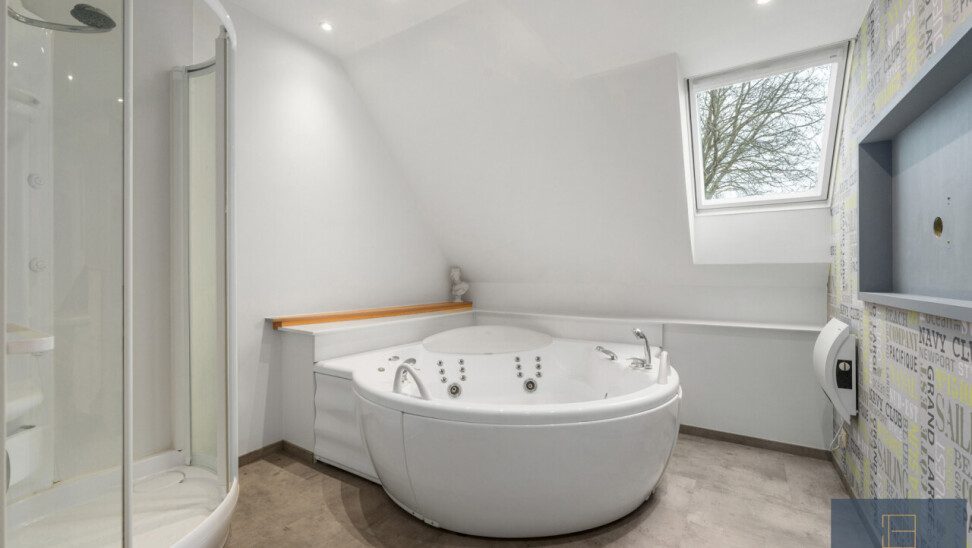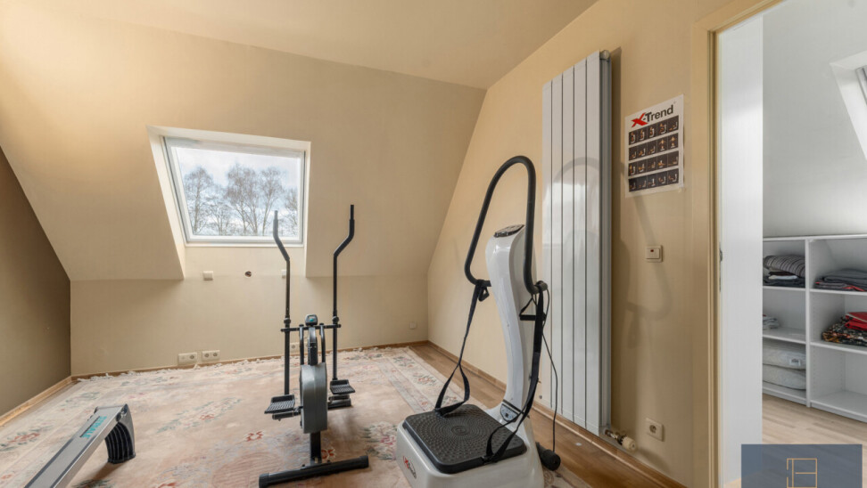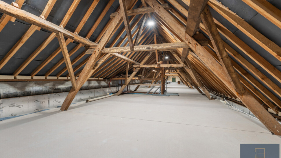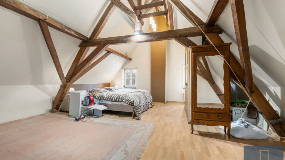 Op de bovenverdieping bevinden zich vier slaapkamers. Eén kamer springt meteen in het oog door de indrukwekkende originele gebintes, die het landelijke karakter extra benadrukken. Twee andere slaapkamers beschikken over een eigen mezzanine, ideaal als speelse slaaphoek, bureau of extra bergruimte. Verder is er op deze verdieping ook een badkamer aanwezig.