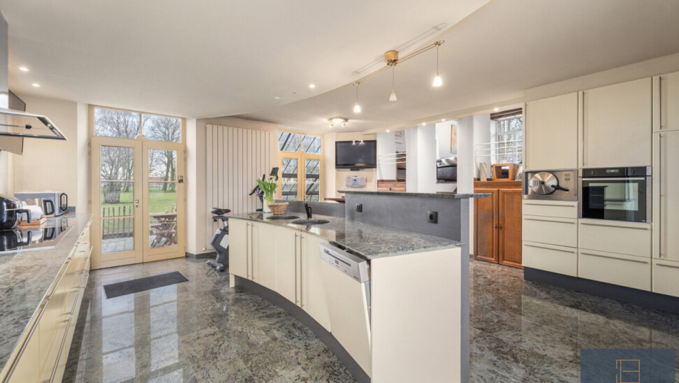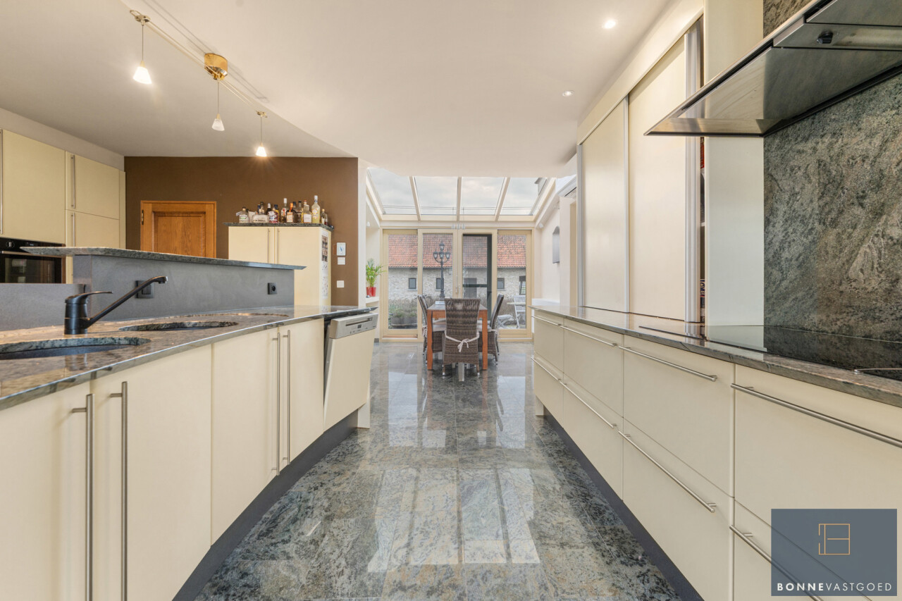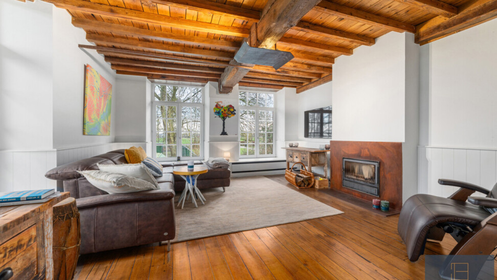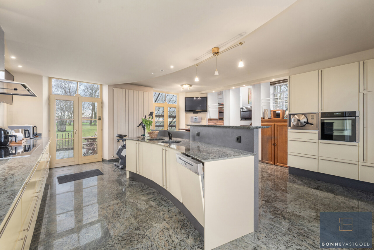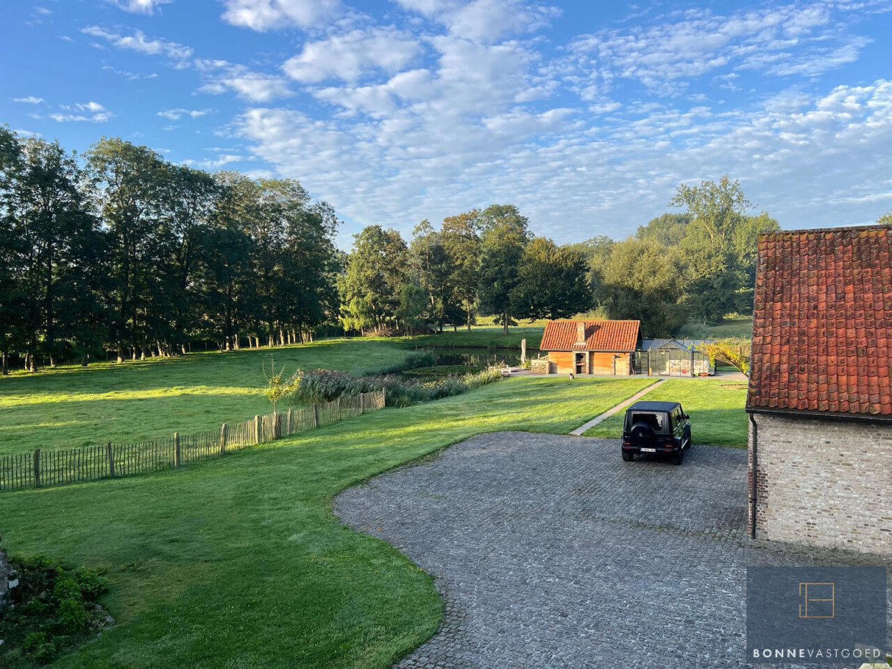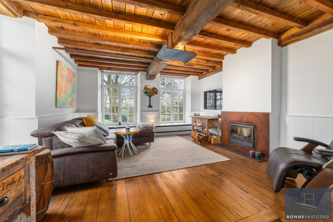 Aansluitend bevindt zich de keuken, met een prachtig uitzicht op het omliggende groen. Naast de keuken ligt de charmante voutekamer, een bijzonder aangename leefruimte waar u volledig tot rust komt terwijl u uitkijkt over de tuin en het open landschap.