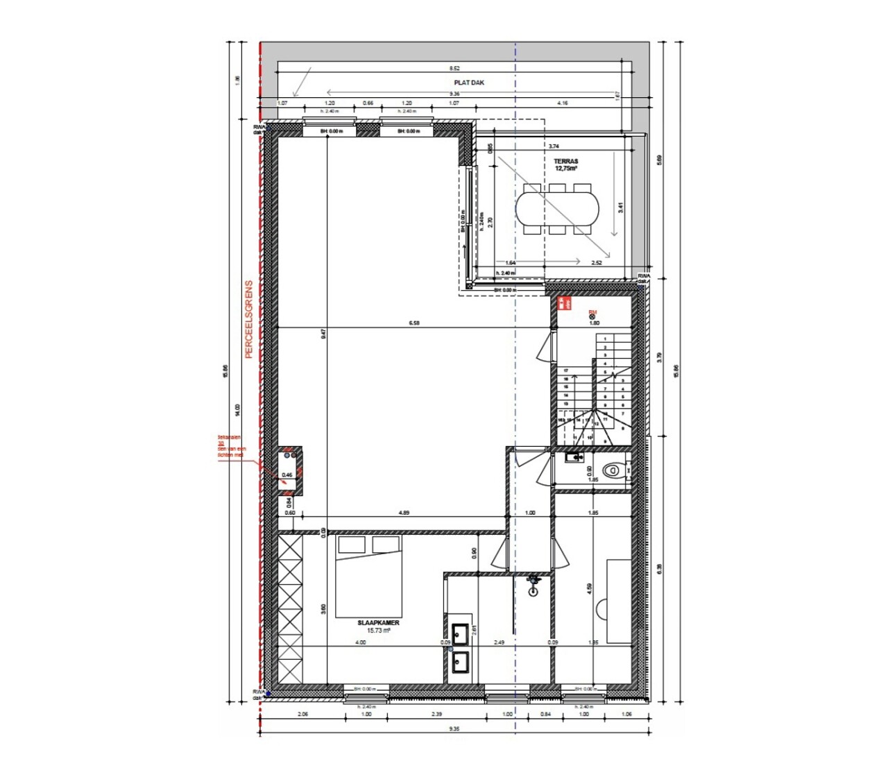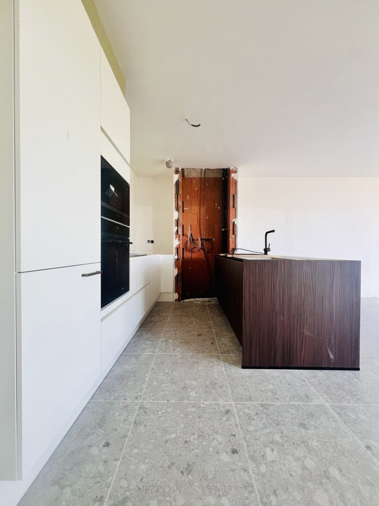 -Eerste verdieping: leefruimte met open kwaliteitskeuken (keramisch werkblad en Siemens toestellen: kookplaat, dampkap, oven, micro, vaatwas en spoelzone), slaapkamer 1 met ensuite badkamer, apart toilet, bureau/dressing/logeerkamer/… en terras (12m²).