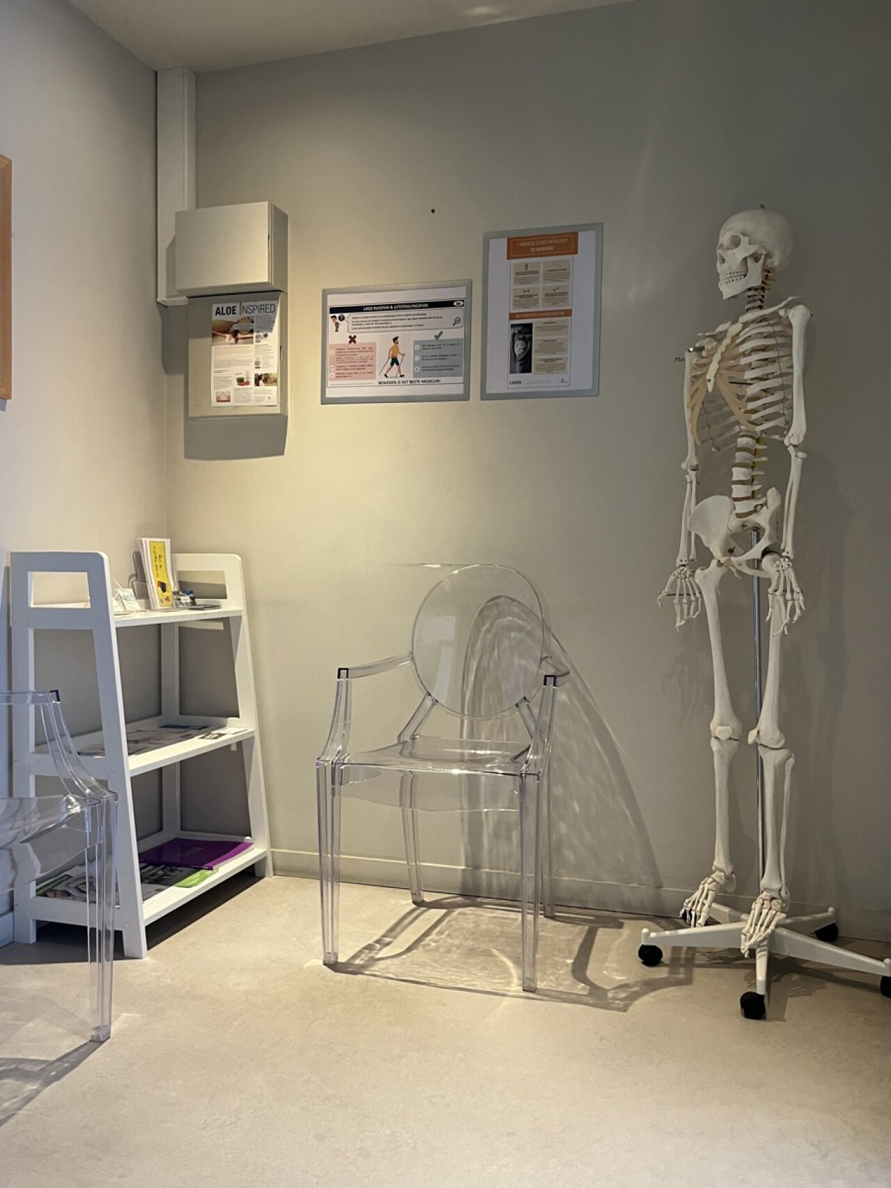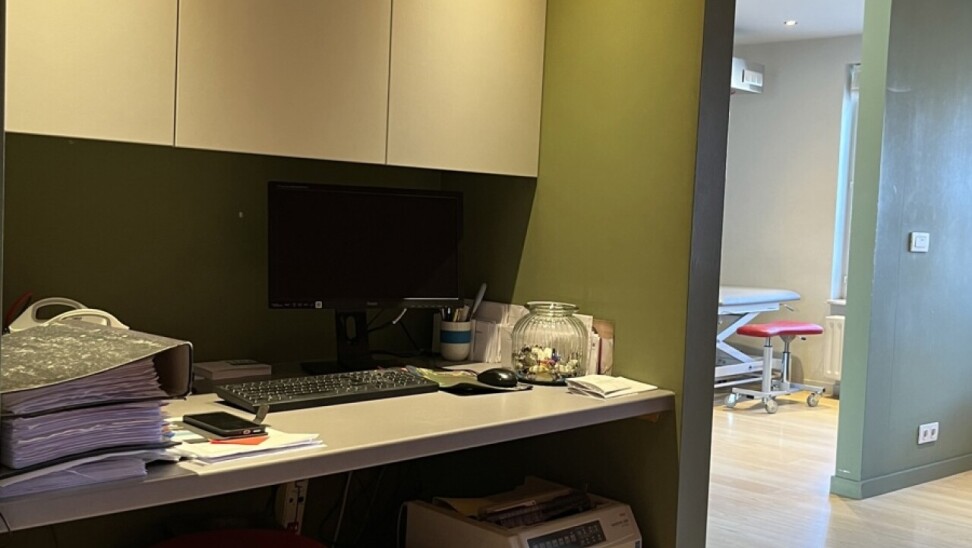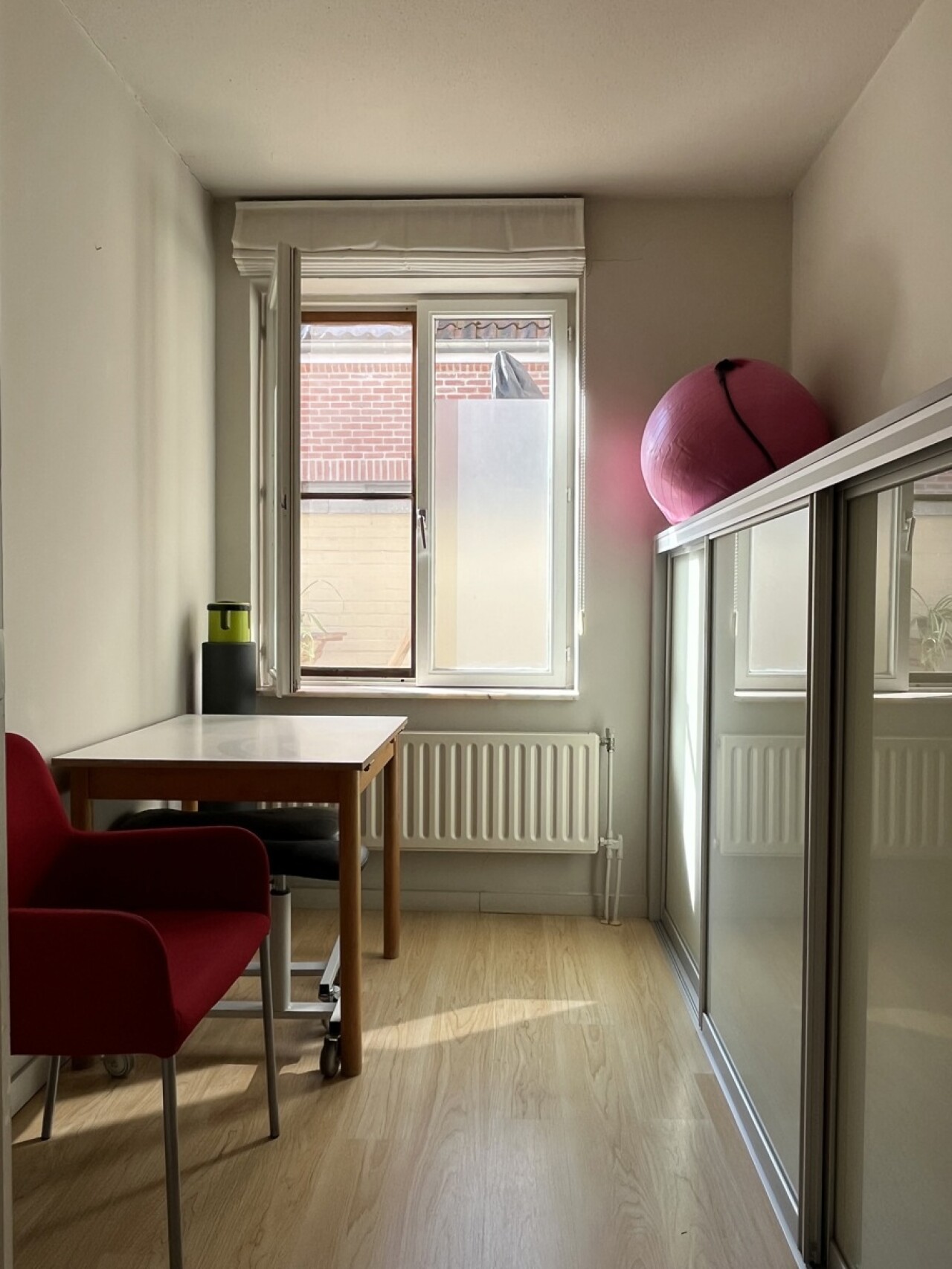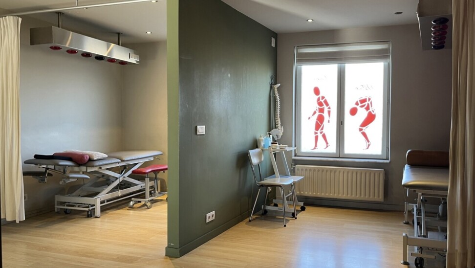 Inkom, wachtkamer, open ruimte, momenteel verdeeld in 2 behandelruimtes, bureauhoek, badkamer (ligbad en lavabomeubel)/bergplaats, aparte 3de behandelruimte, 4de behandelruimte/opslag en tot slot de personeelsruimte met kitchenette en toegang tot het private terras en de private parkeerplaats.