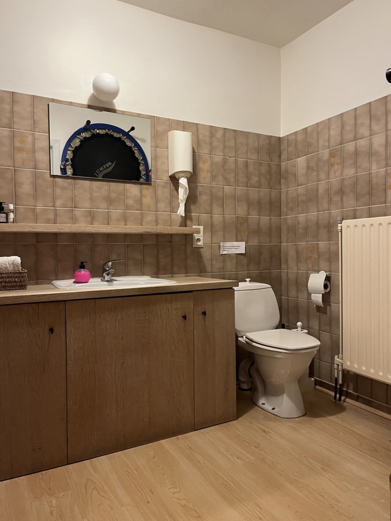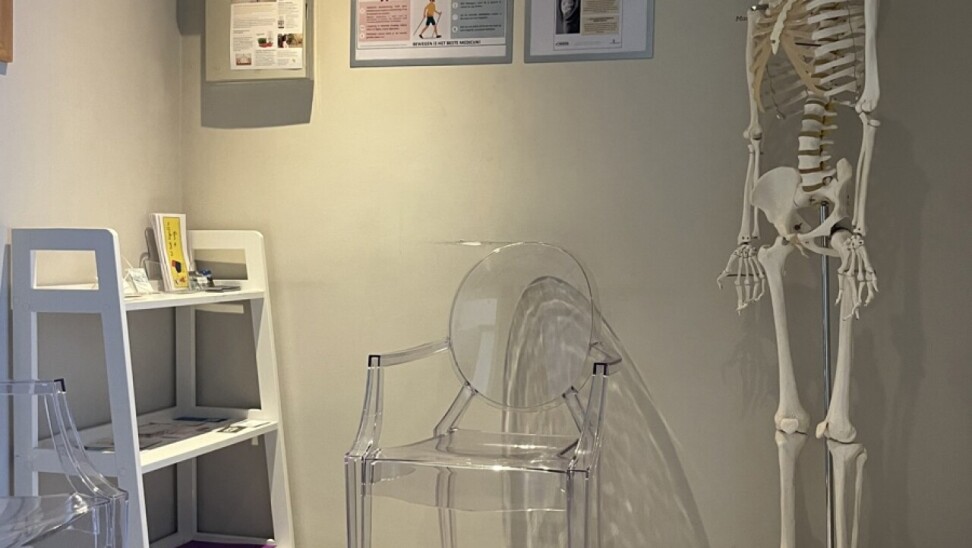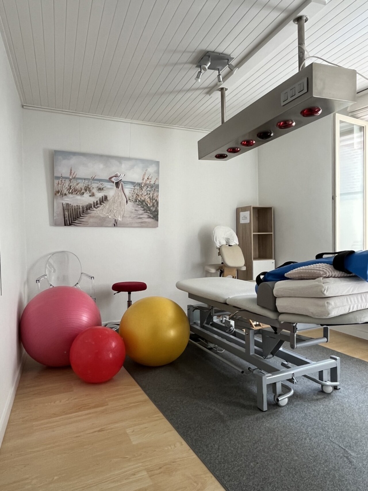 Inkom, wachtkamer, open ruimte, momenteel verdeeld in 2 behandelruimtes, bureauhoek, badkamer (ligbad en lavabomeubel)/bergplaats, aparte 3de behandelruimte, 4de behandelruimte/opslag en tot slot de personeelsruimte met kitchenette en toegang tot het private terras en de private parkeerplaats.