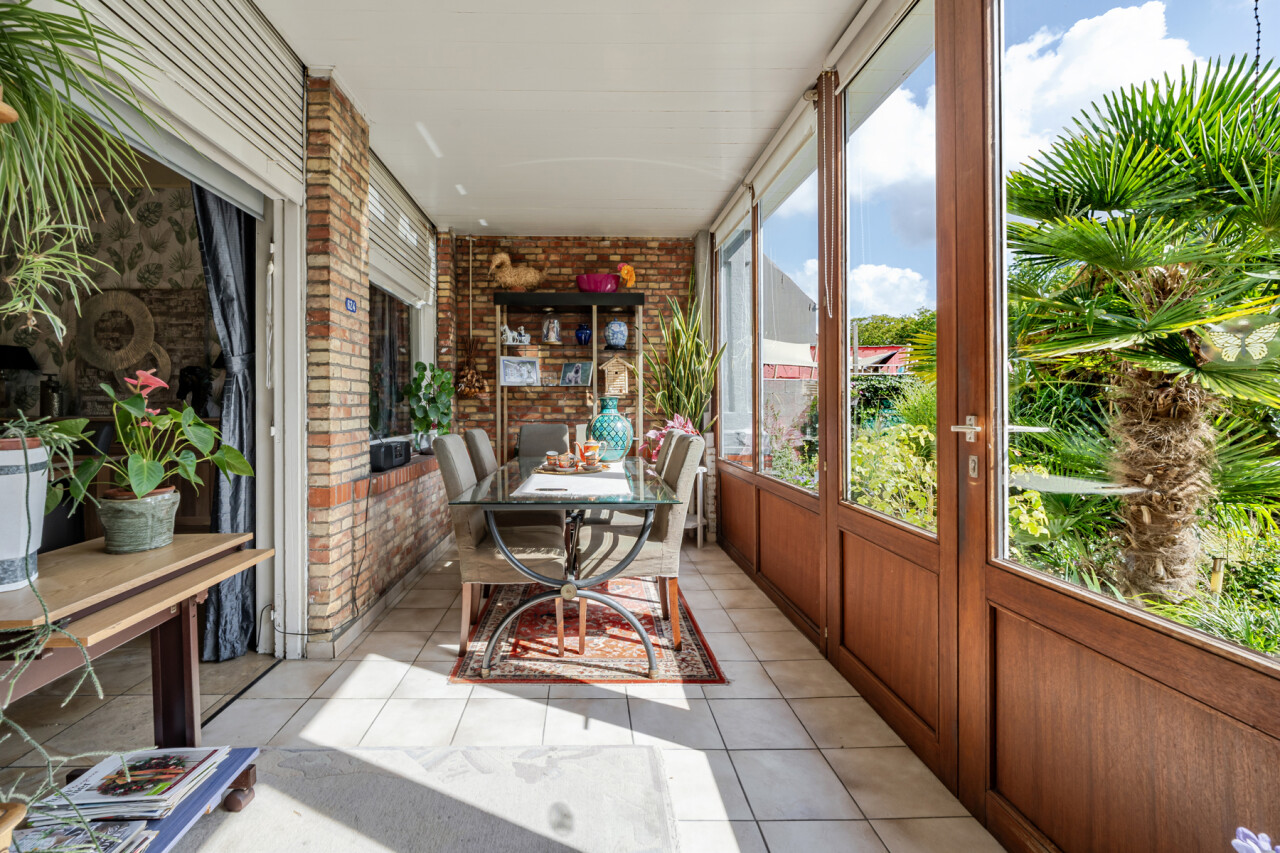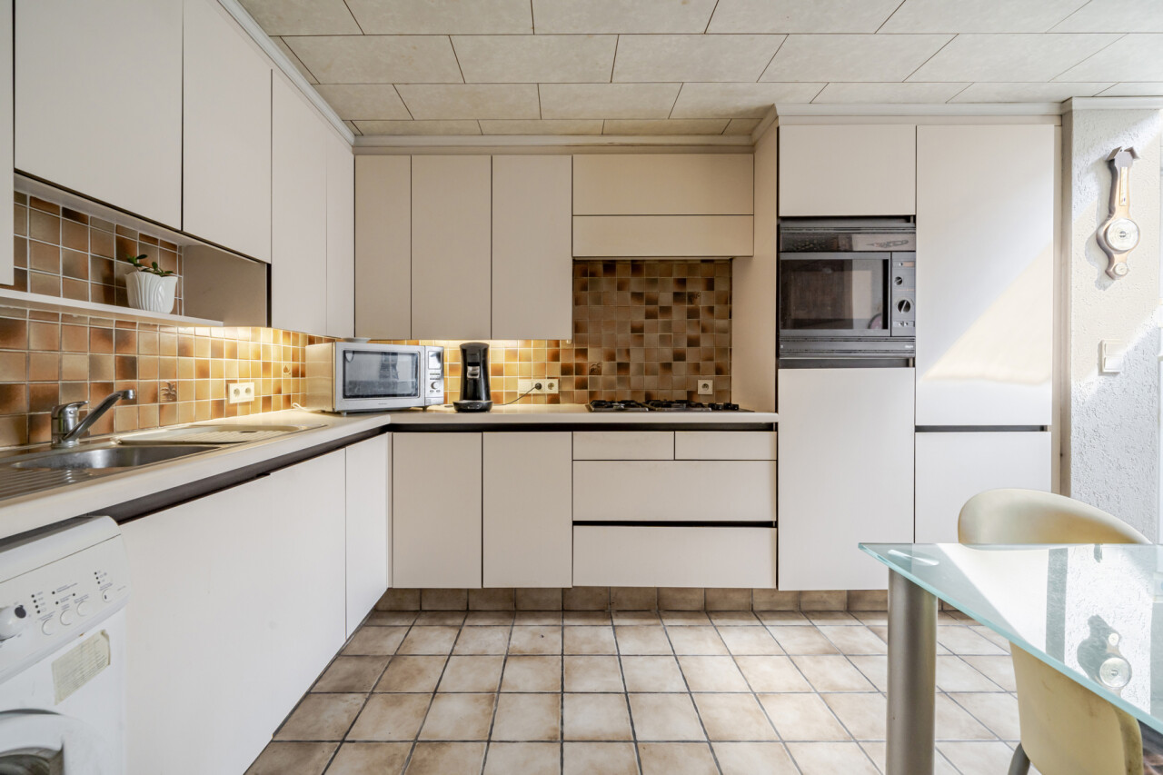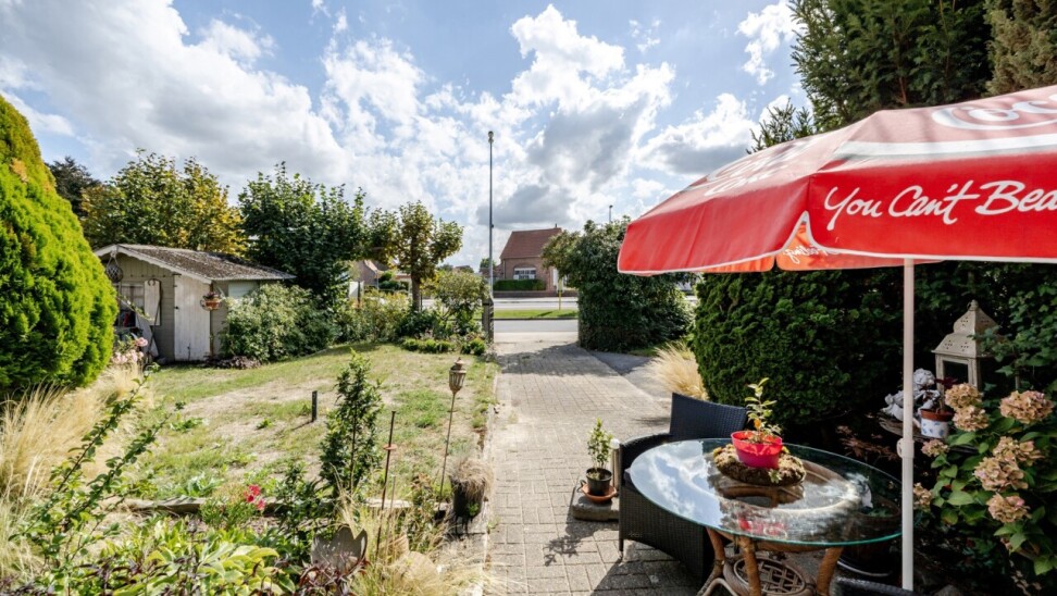 Gelijkvloers: inkom/veranda, leefruimte, uitgeruste keuken, badkamer en berging.