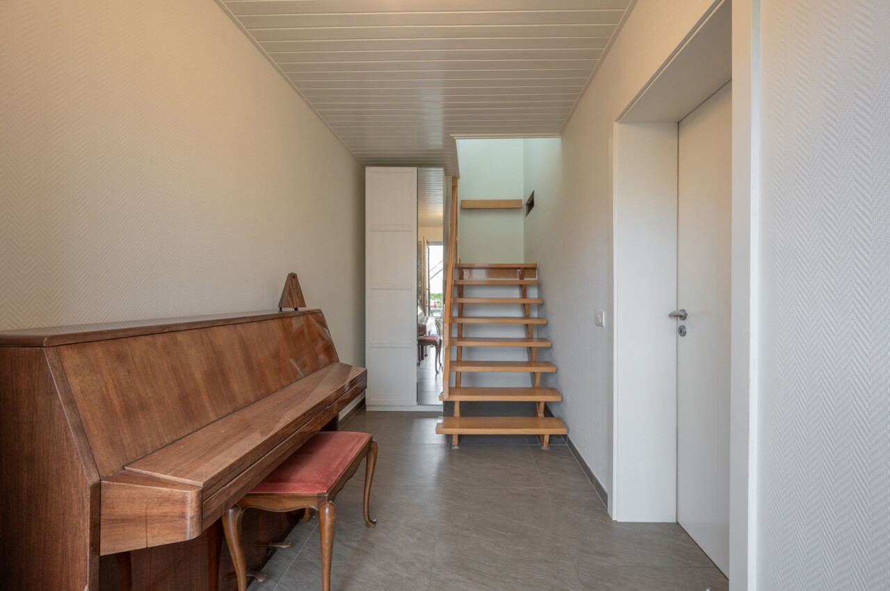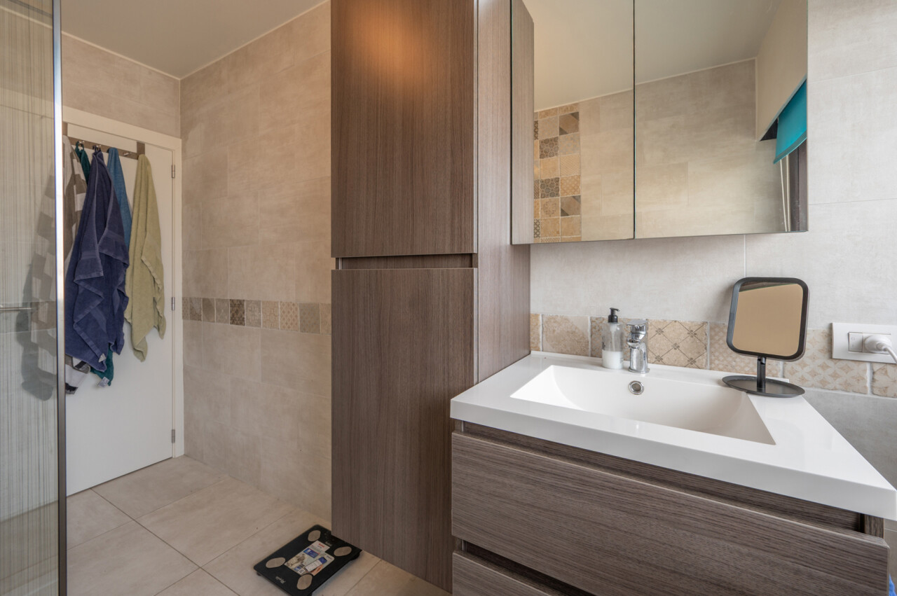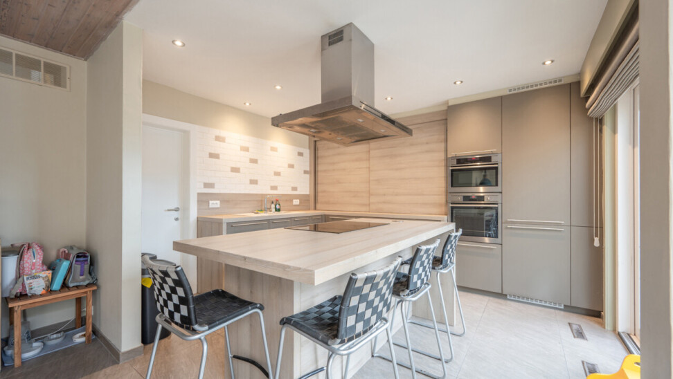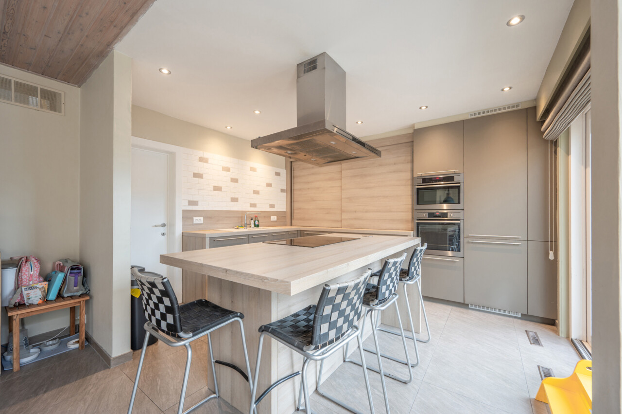 Gelijkvloers: inkom, gastentoilet, leefruimte, open keuken (Dovy- met eiland, kookplaat, dampkap, oven, microgolfoven, koelkast en spoelzone), berging (met aansluitingen wasmachine, droogkast en waterverzachter), garage met nieuwe automatische poort. Naarnaast is er het kantoor met de aparte toegangsdeur.