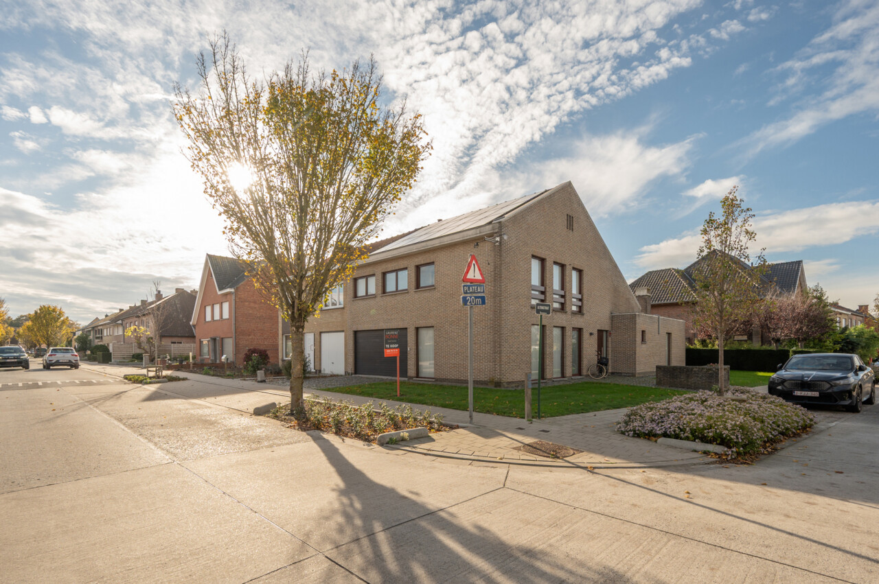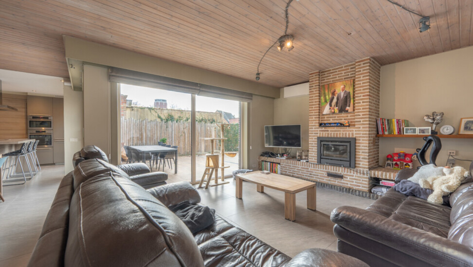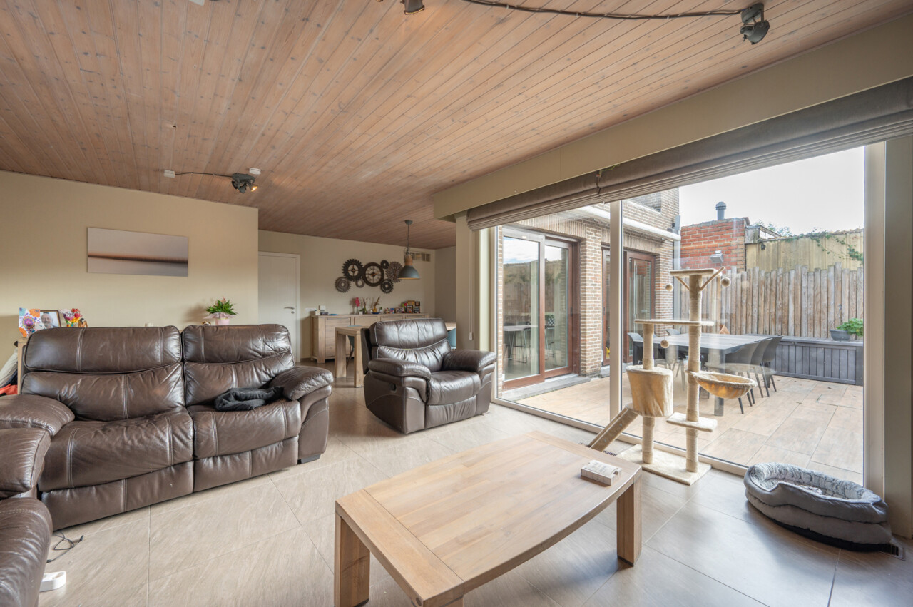Buiten: voortuin met oprit, achtertuin (volledig omheid + onderhoudsvrij), met terras en zonneluifel.