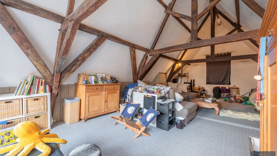 Tweede verdieping: grote polyvalente slaapkamer, gekarakteriseerd door het zichtbare balkwerk.