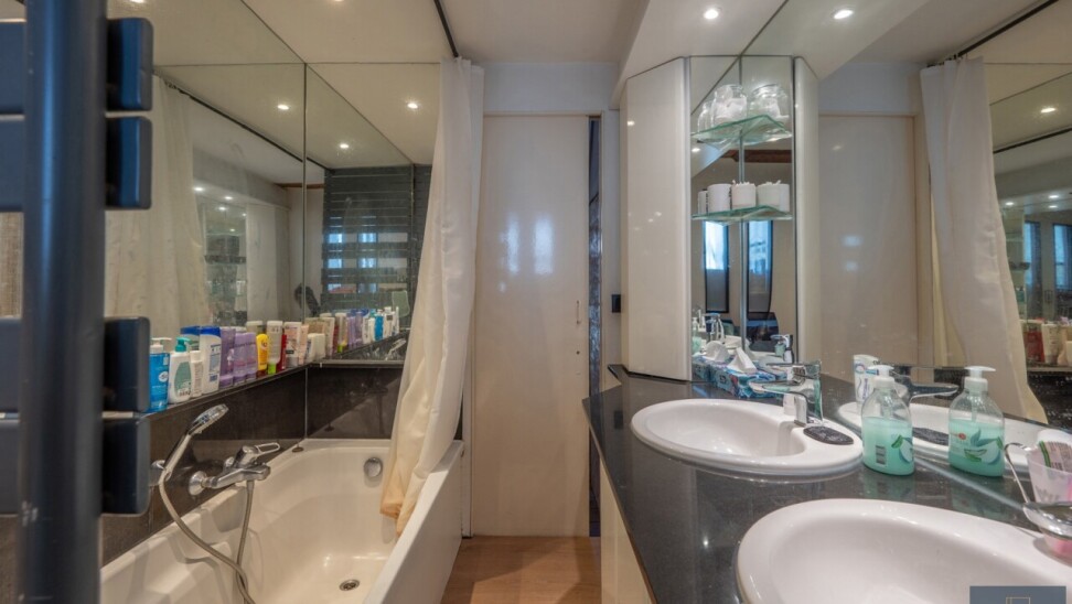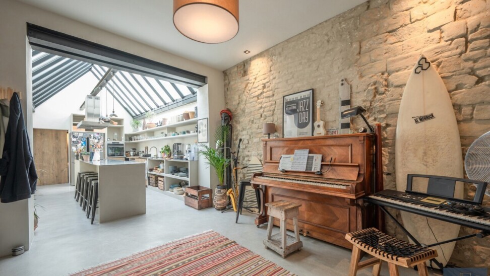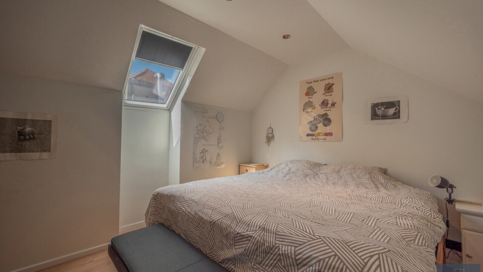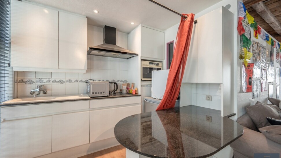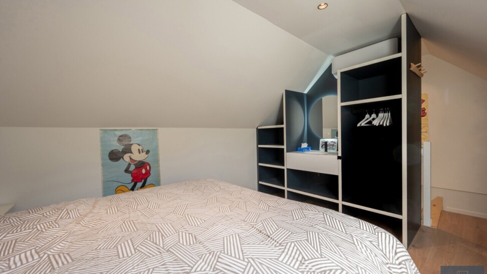 Eerste verdieping: tweede leefruimte met tweede keuken en tweede badkamer (momenteel gebruikt als studio voor een van de kinderen), slaapkamer 3 met toilet en douche.
