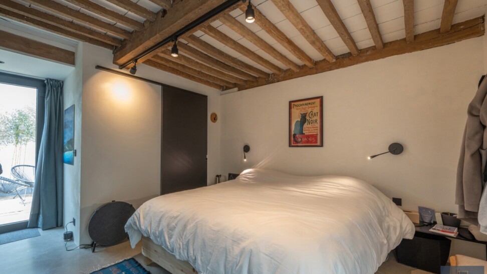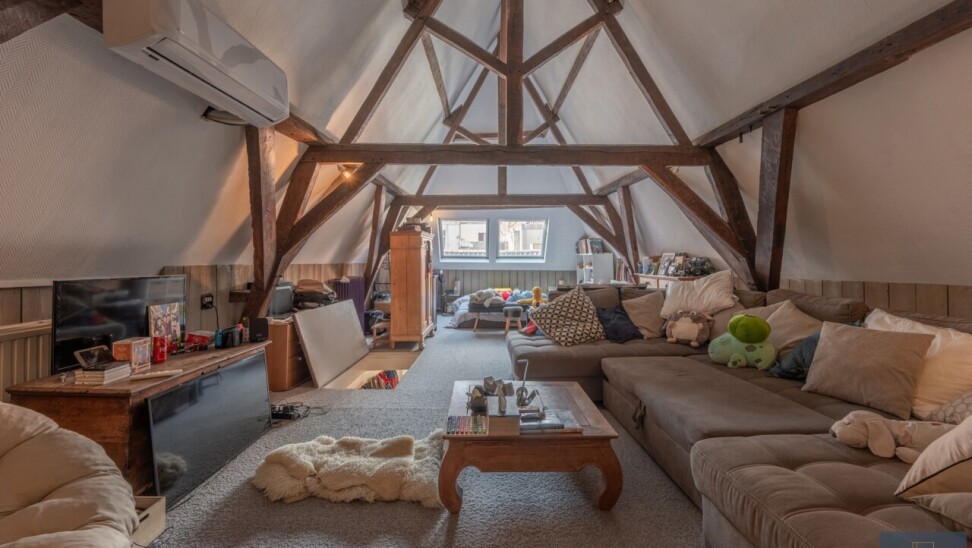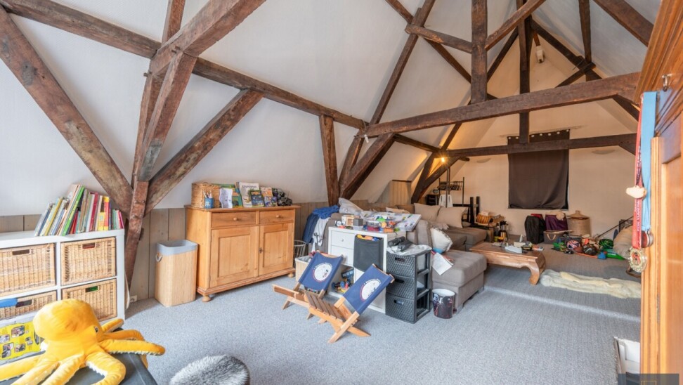 Tweede verdieping: grote polyvalente slaapkamer, gekarakteriseerd door het zichtbare balkwerk.