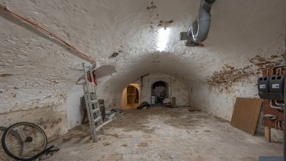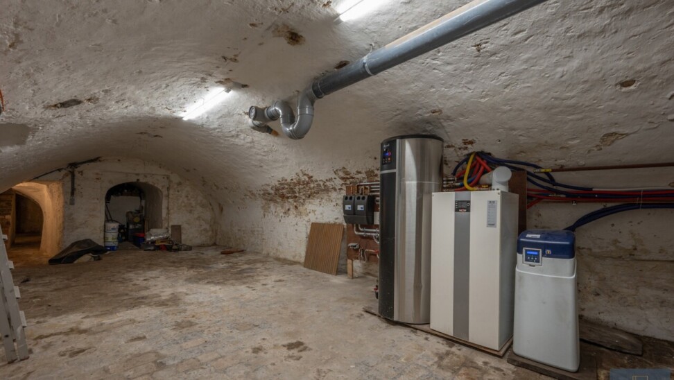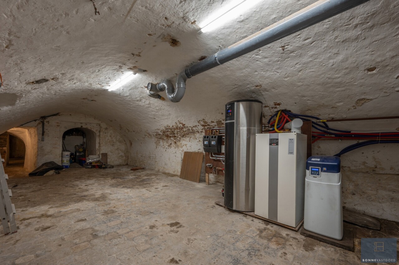 Gelijkvloers: royale inkomhal, leefruimte met open keuken, gelijkvloerse slaapkamer, dressing, badkamer en toegang tot de kelder (tongewelven - met technieken).