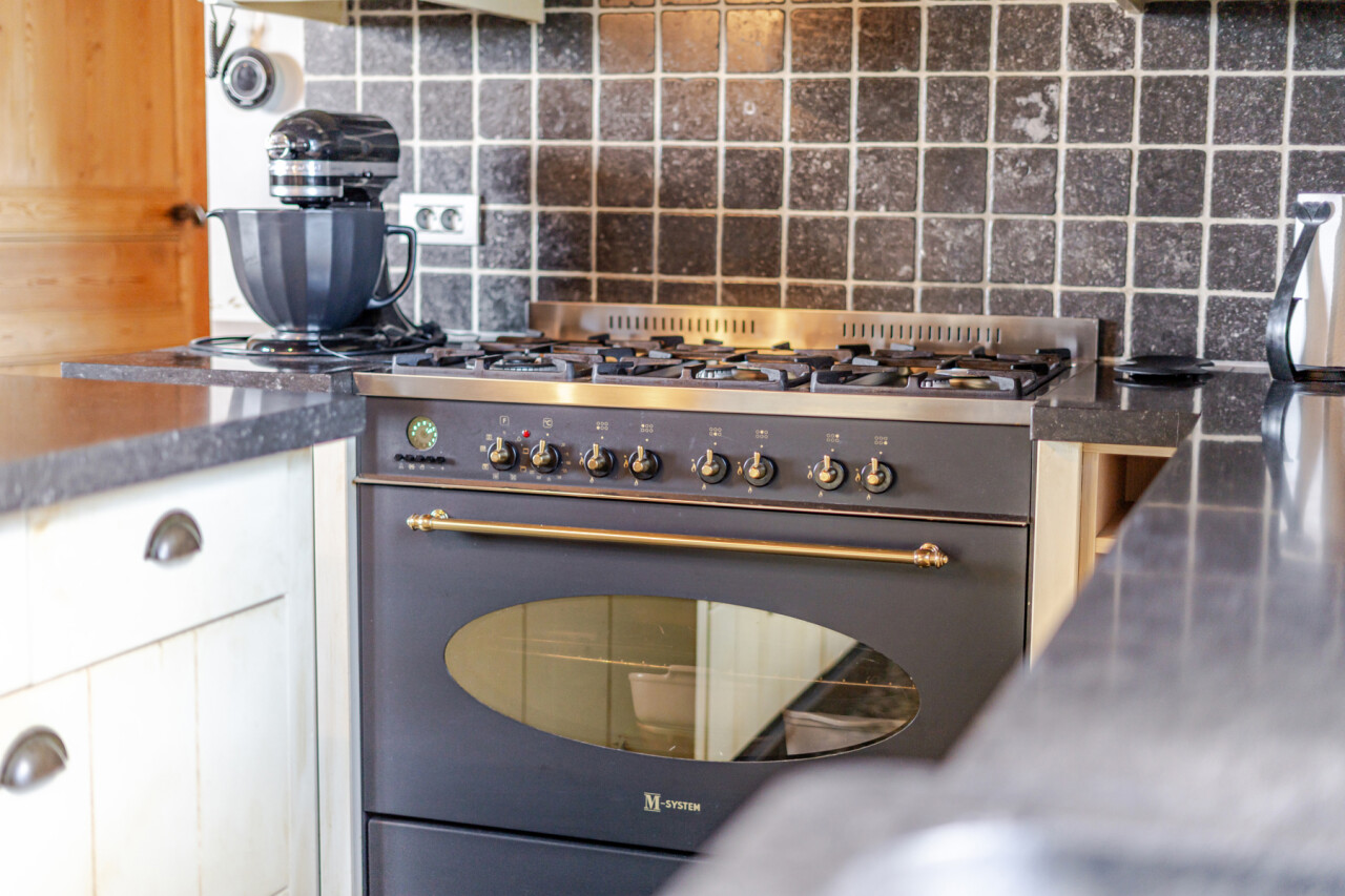 Ruime inkomhal met gastentoilet, grote leefruimte, kwaliteitskeuken met arduin werkblad en gasfornuis, voutekamer/bureau, gelijkvloerse slaapkamer en badkamer, tot slot is er de grote garage.