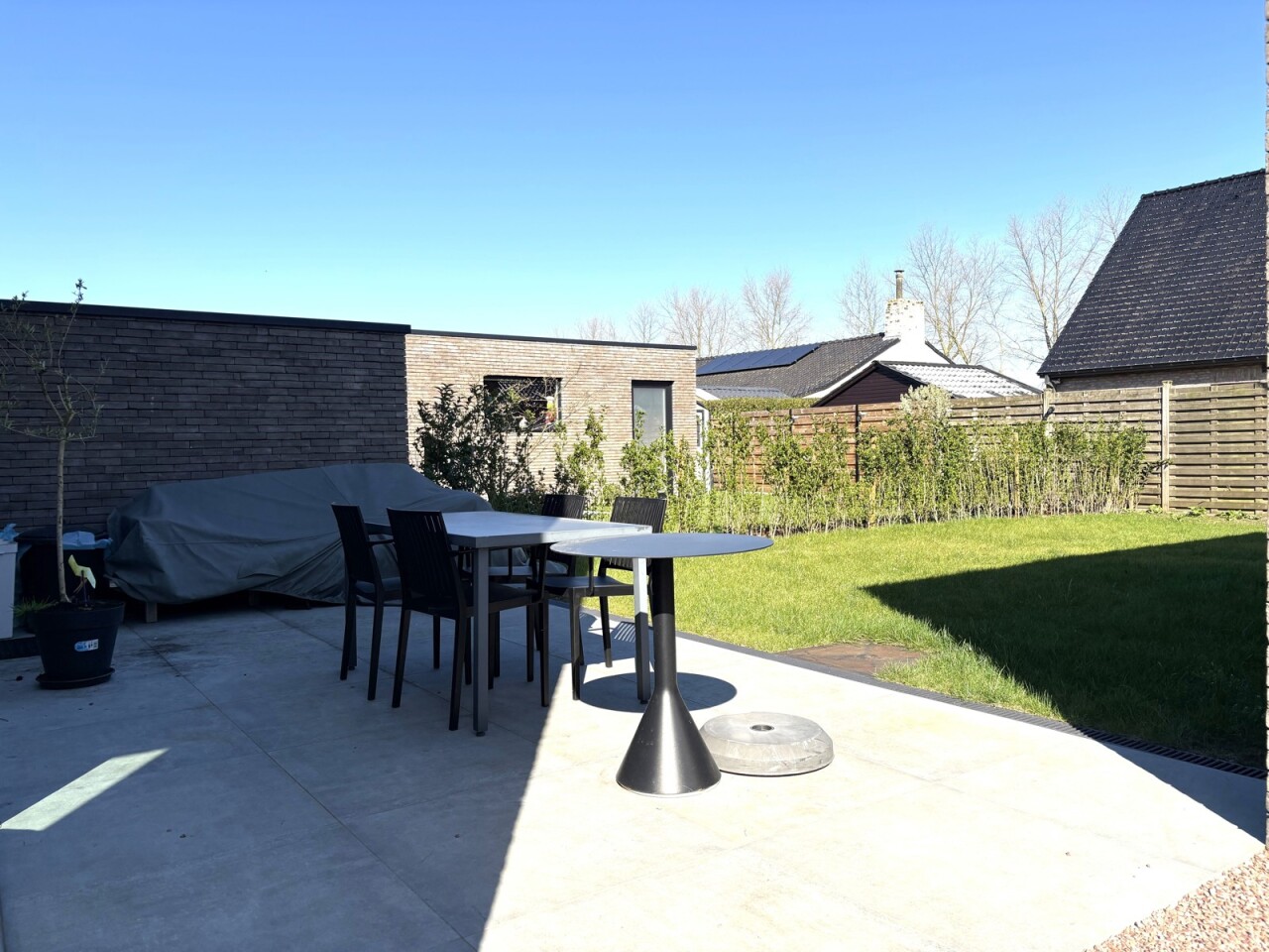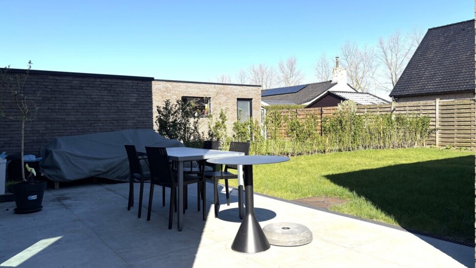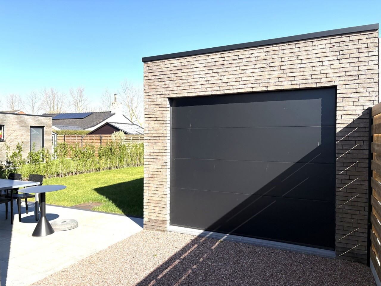 Buiten: voortuin, oprit, achtertuin met terras en afzonderlijke garage met automatische poort.