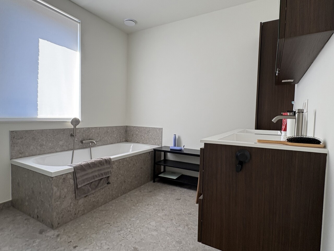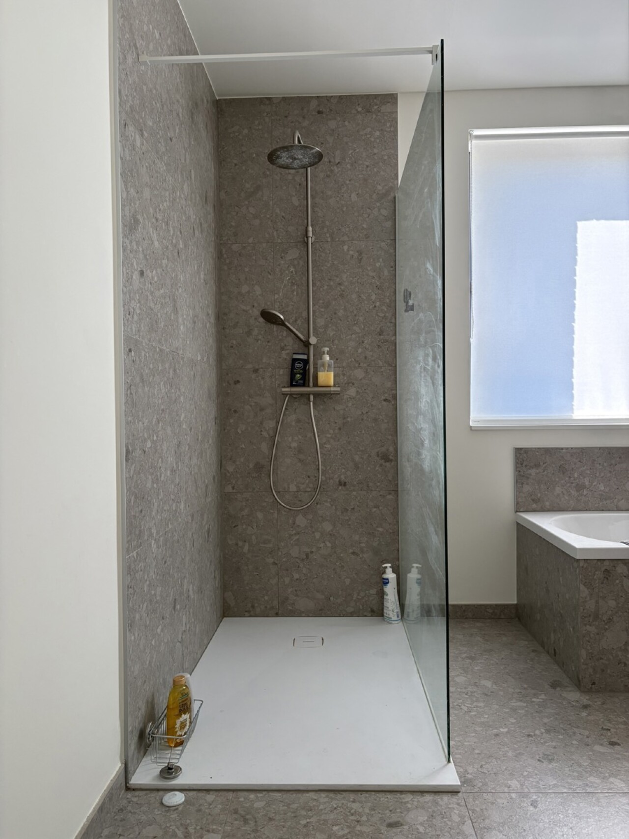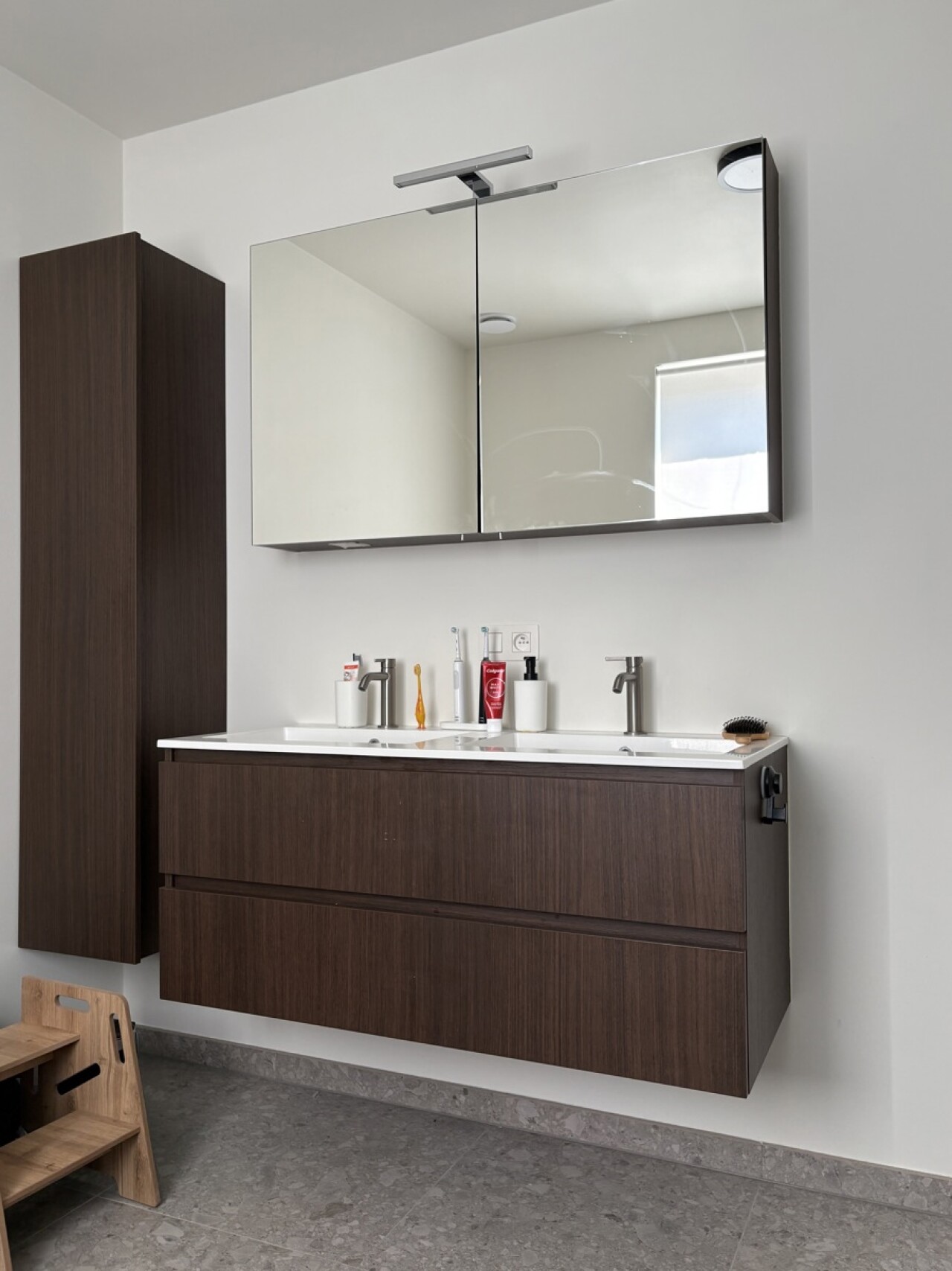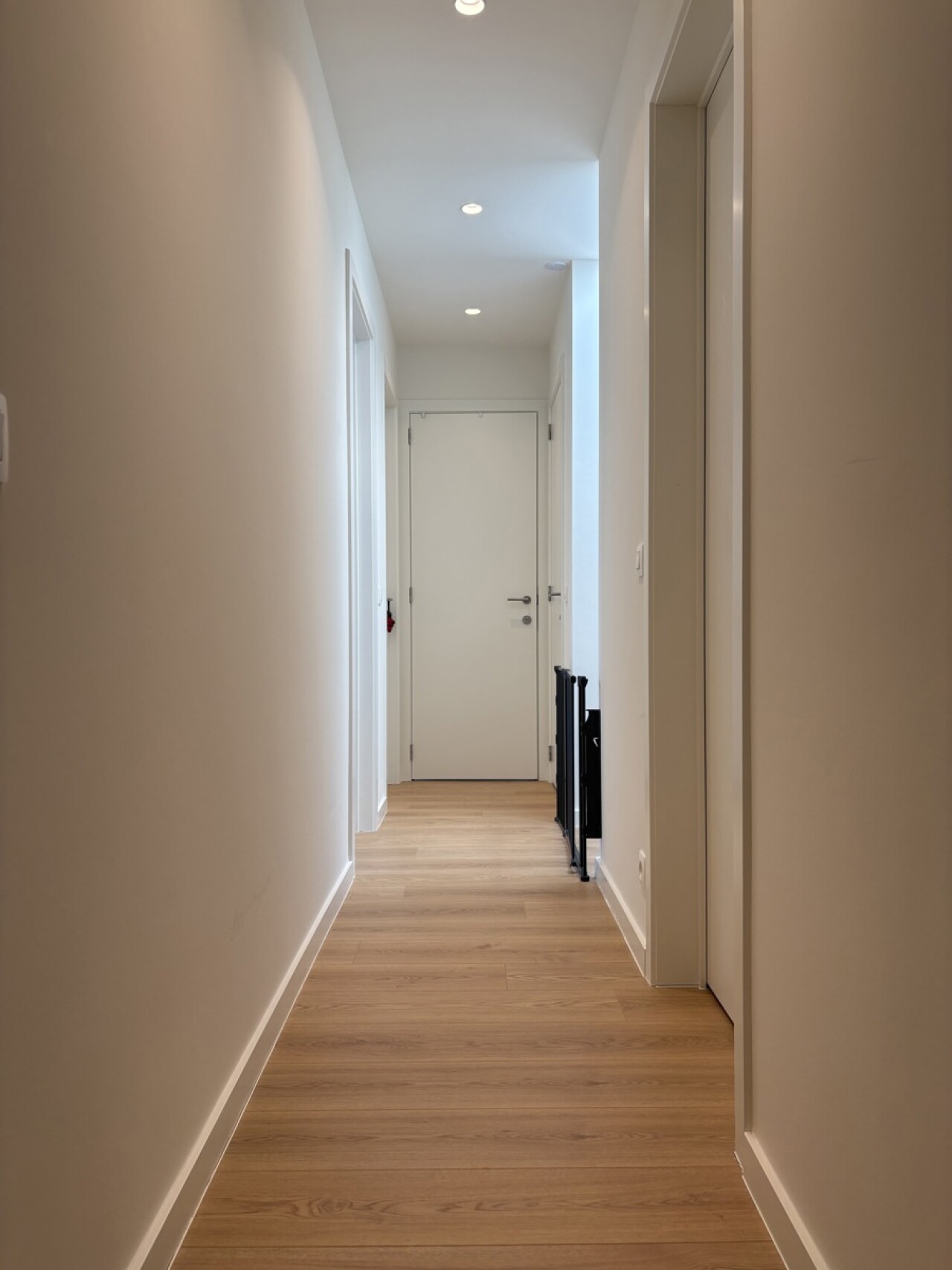 Eerste verdieping :hal, toilet, badkamer (met ligbad, douche en dubbele lavabomeubel), berging en 3 slaapkamers waarvan 1 met mogelijkheid tot dressing/bureau.