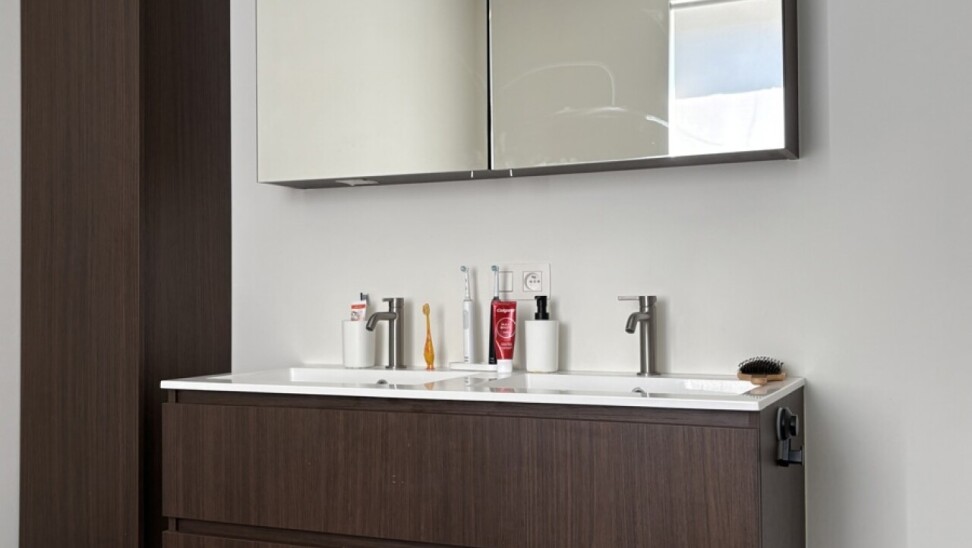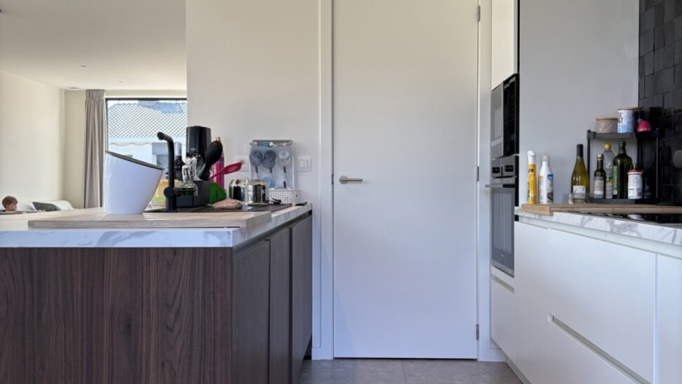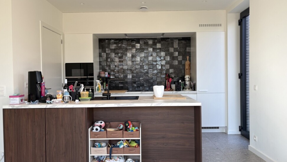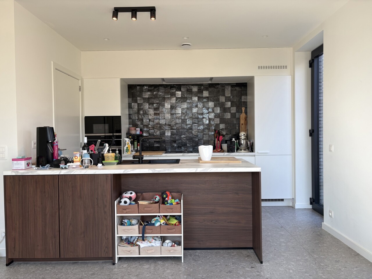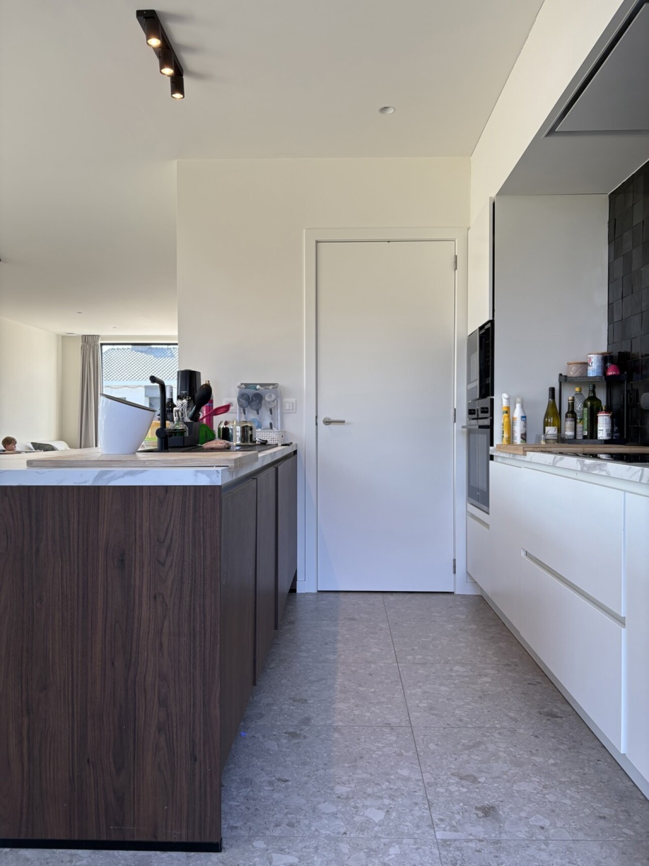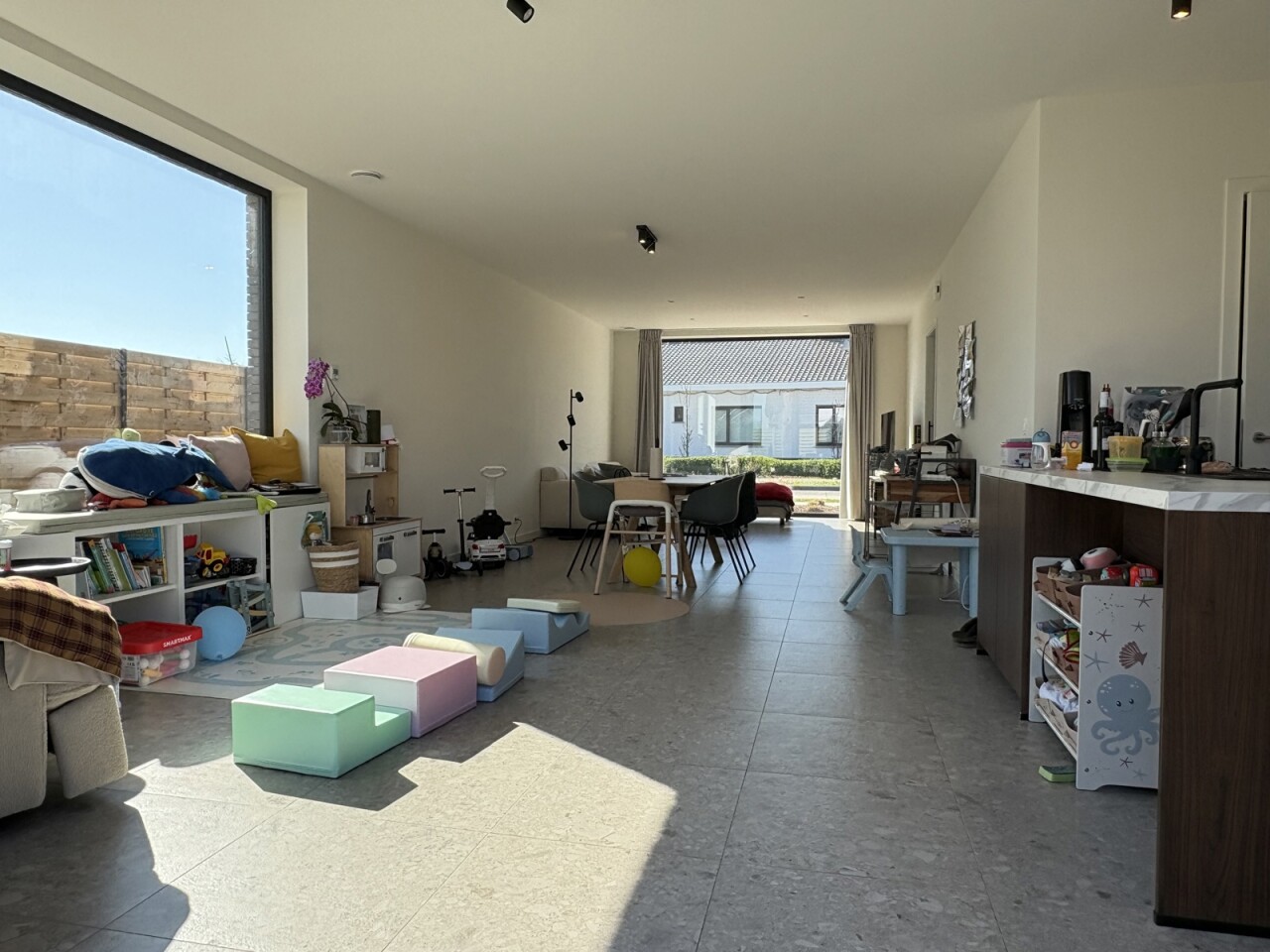 Gelijkvloers: inkomhal, gastentoilet, leefruimte met open keuken (Siemens toestellen: kookplaat, dampkap, oven, microgolfoven, koelkast, vaatwas en spoelzone) en keukenberging.