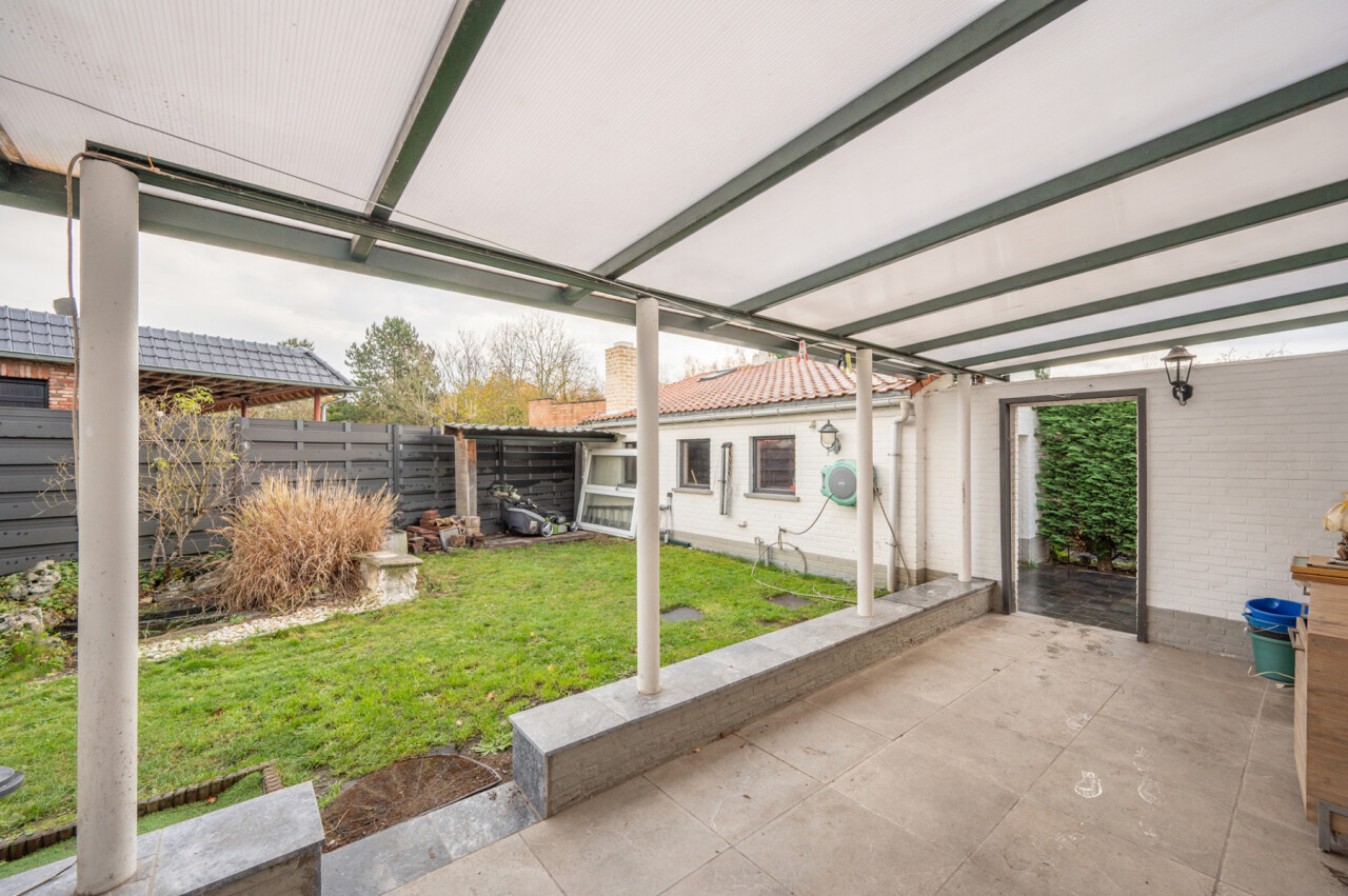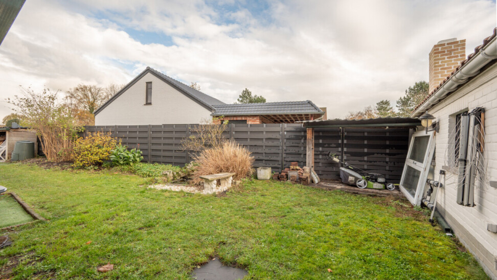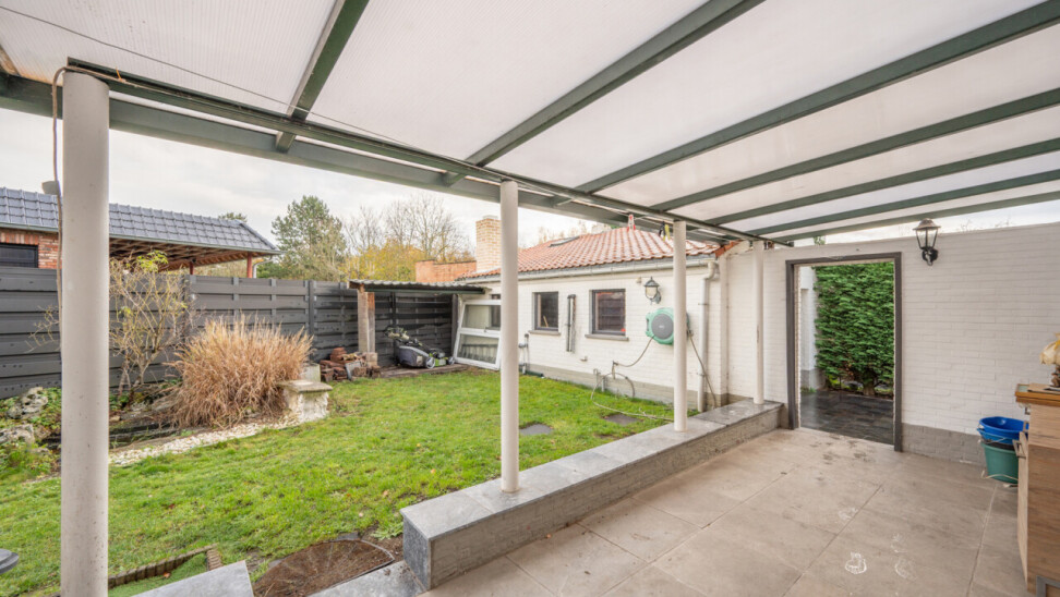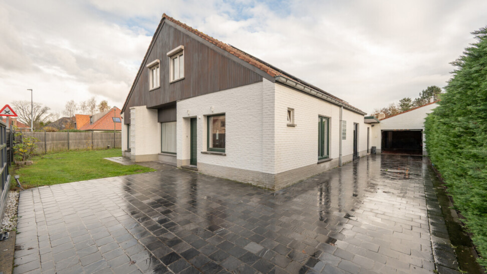 Buiten: oprit, voor-zij-achtertuin en garage met automatische poort. De oprit wordt afgesloten door een schuifpoort.
