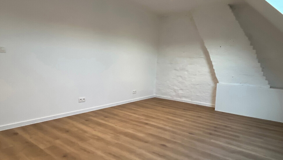 Eerste verdieping: grote slaapkamer, toilet en polyvalente kamer met vaste trap naar de tweede verdieping.
