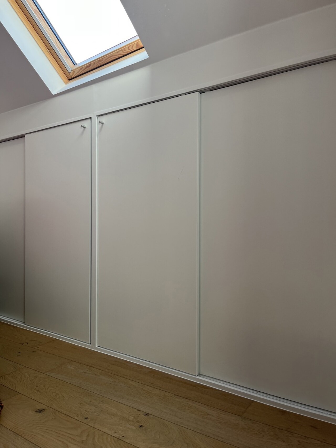 Tweede verdieping: hoofdslaapkamer met maatkasten onder het hellend dak.
