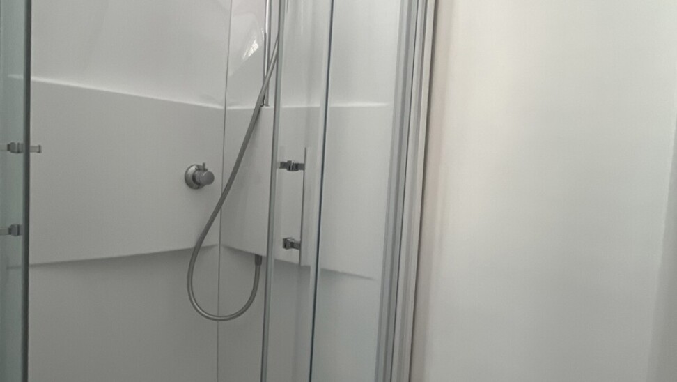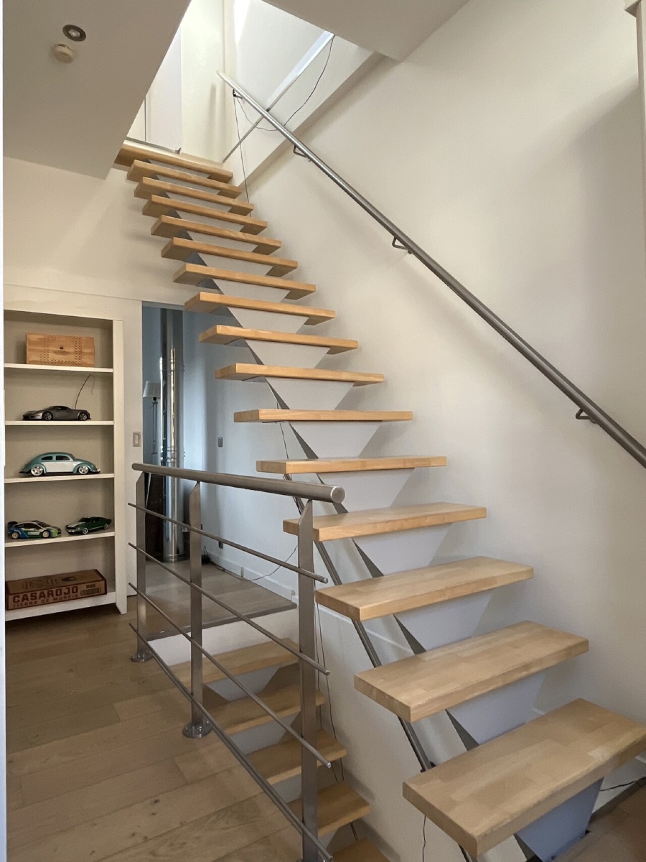 Eerste verdieping: slaapkamer, badkamer (met lavabo, toilet, douchecabine en aansluiting voor wasmachine en droogkast) + vaste trap naar de tweede verdieping.