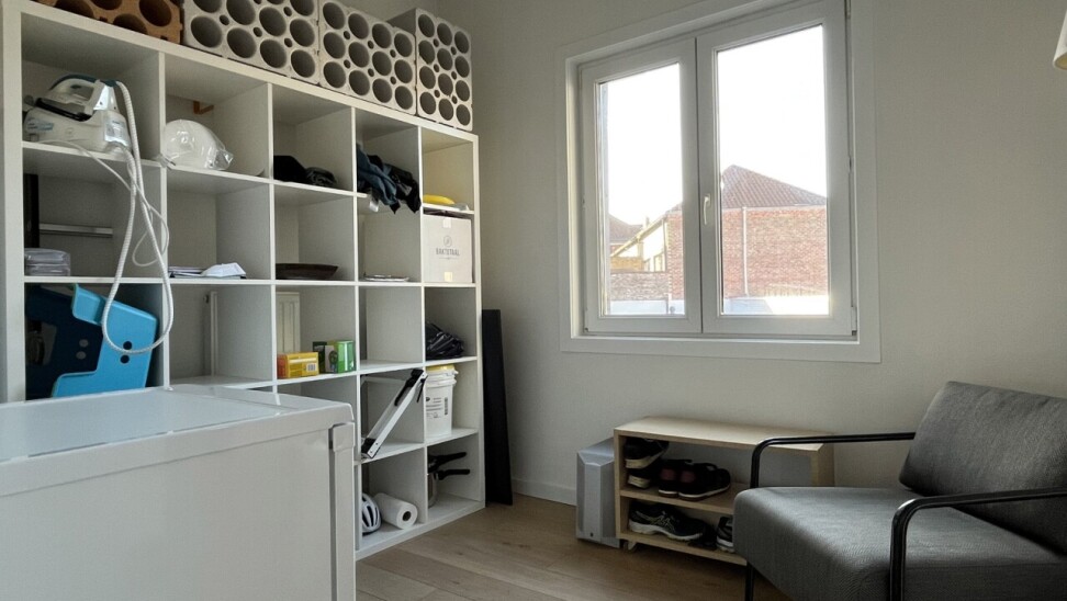 Gelijkvloers: inkom, lichtrijke leefruimte, uitgeruste keuken en toegang tot het terras met berging.