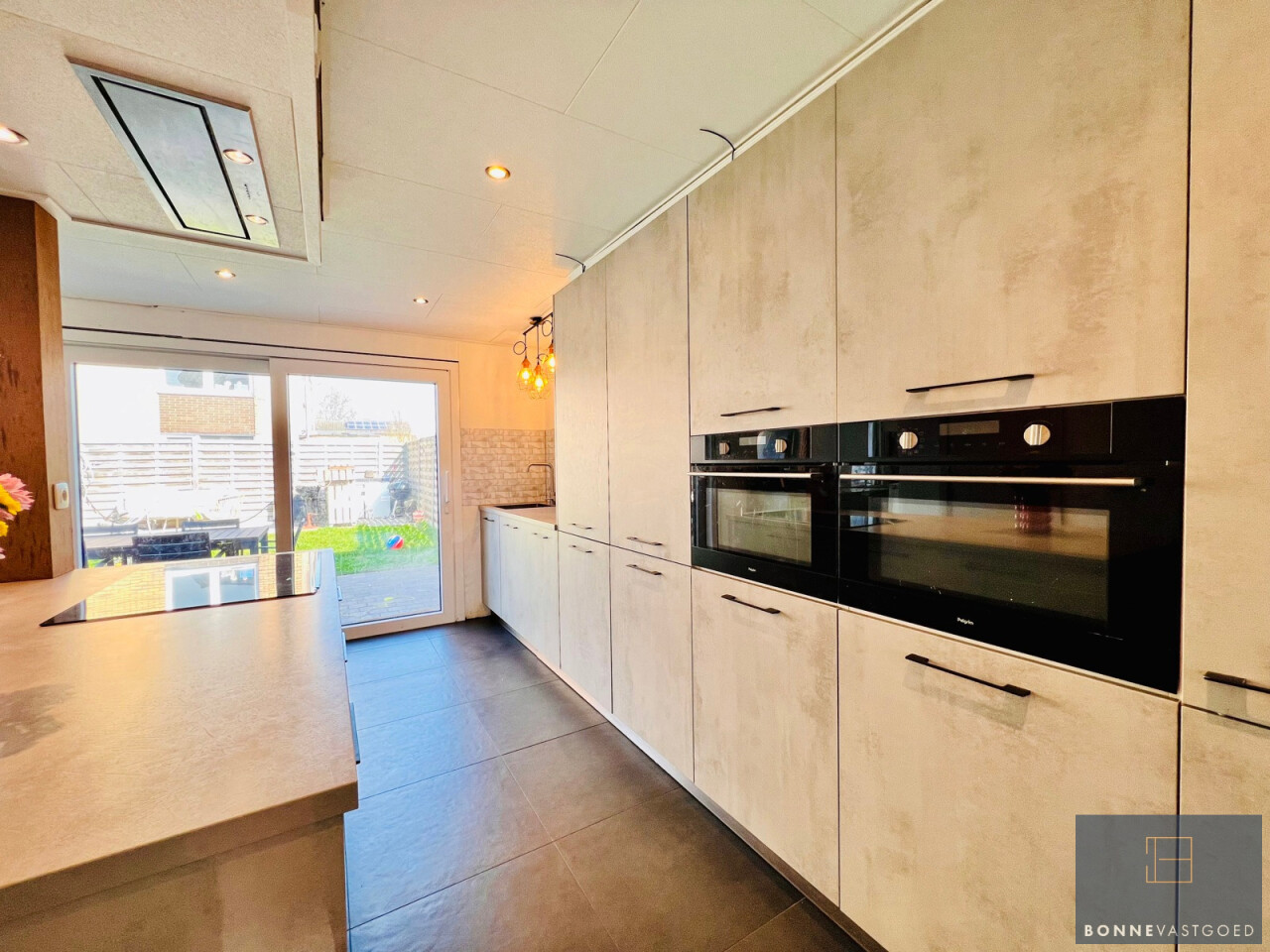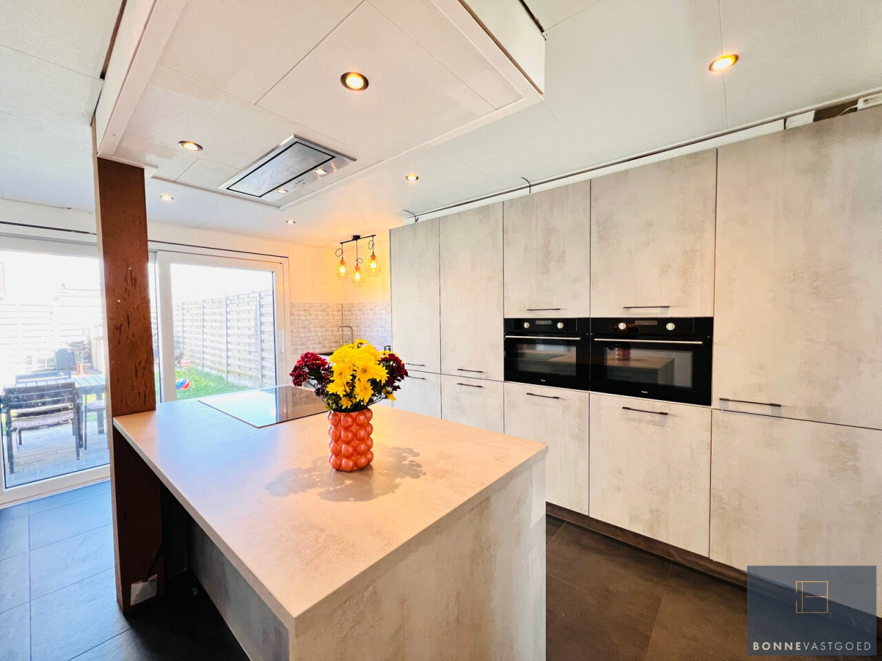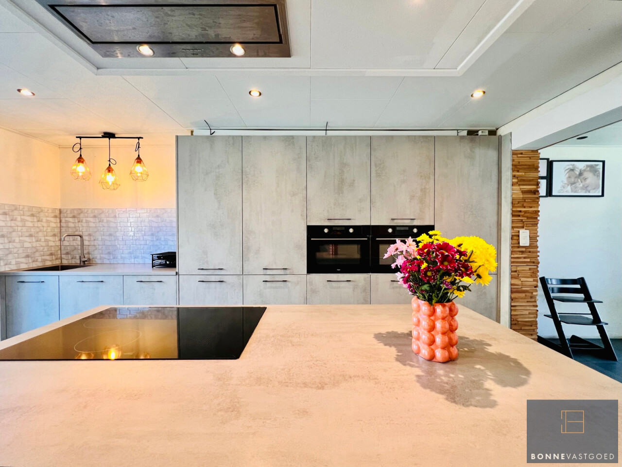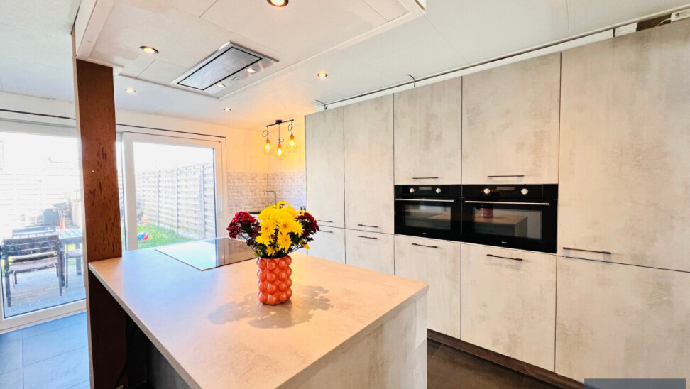 Bij het binnenkomen word je verwelkomd in een lichtrijke woonkamer met een uitnodigende, warme uitstraling. De volledig vernieuwde keuken is modern en praktisch ingericht (inductiekookplaat, 2 combi-ovens, vaatwas, dampkap, koelkast, extra veel kastruimte,…), perfect voor wie graag kookt en geniet van een hedendaags comfort.