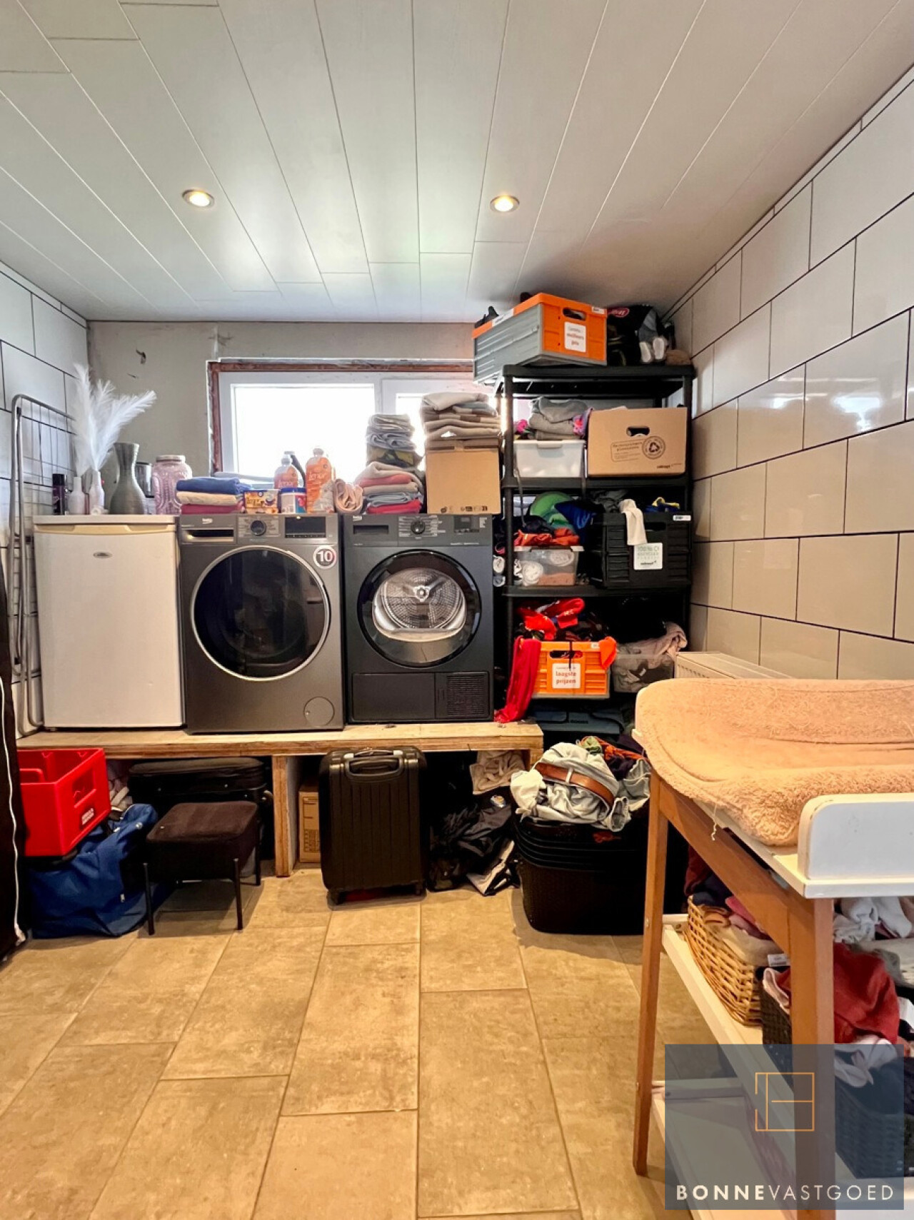 De voormalige garage werd slim omgevormd tot een praktische bergingsruimte en wasplaats, aangevuld met een extra douche en lavabo. Verder vind je op het gelijkvloers ook nog een apart toilet en extra bergingsruimte onder de trap.