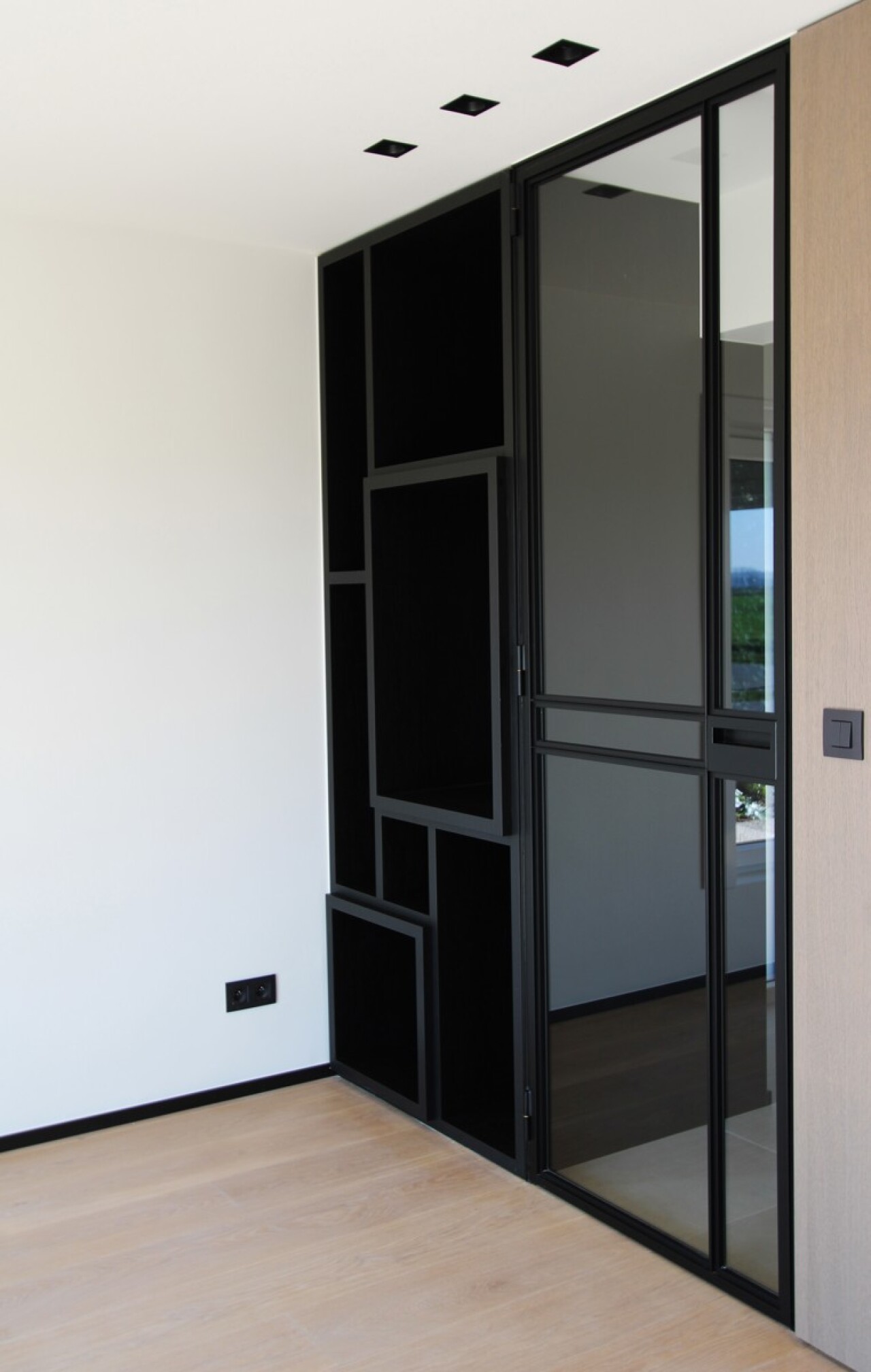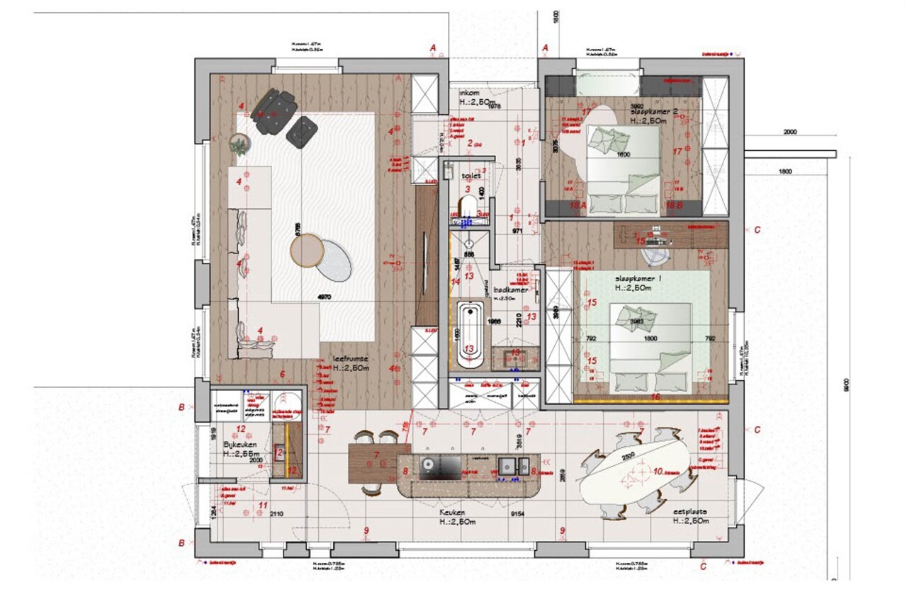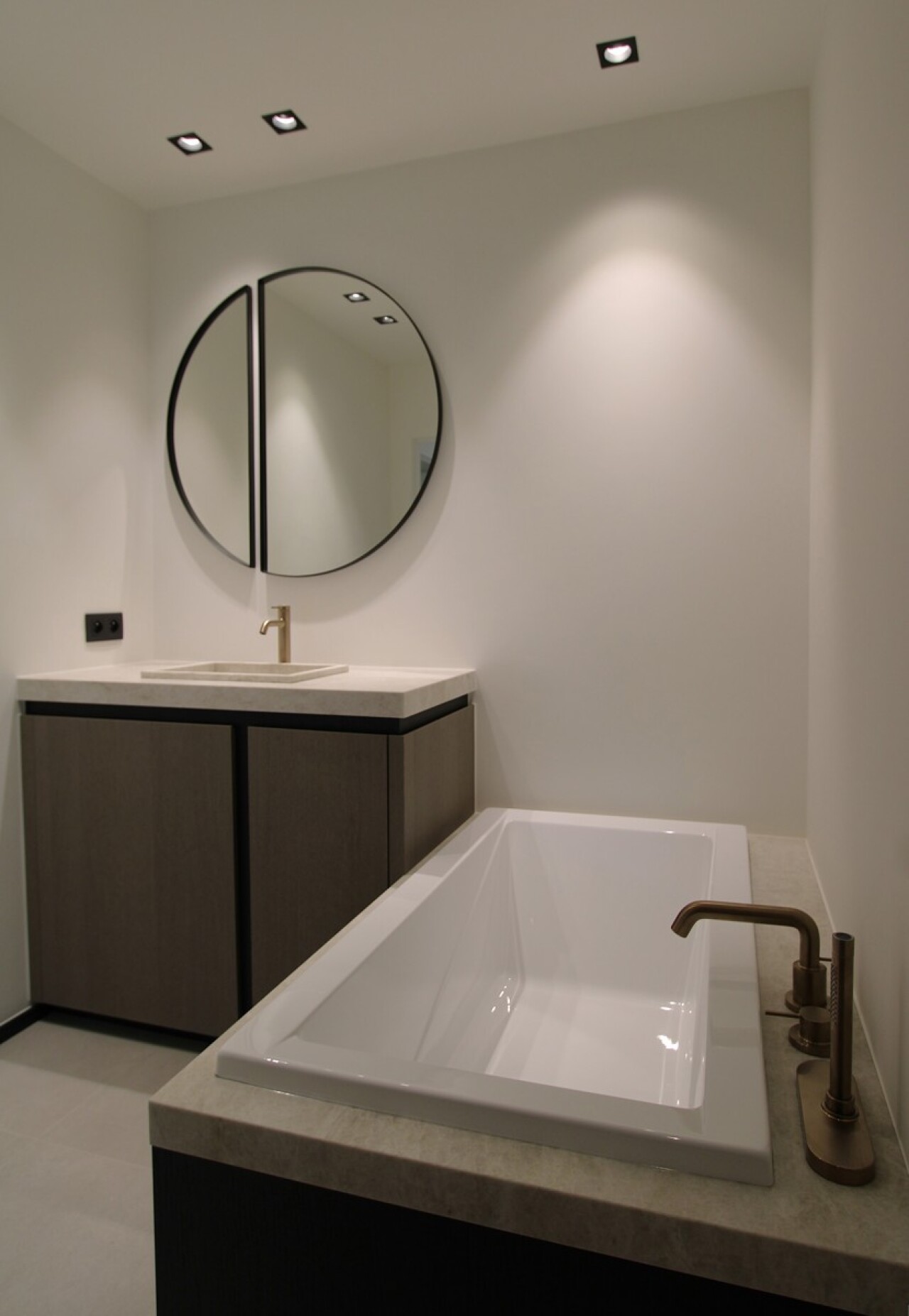 Indeling: inkom met vestiairekast op maat en gastentoilet, smeedwerkdeur naar leefruimte, lichtrijke leefruimte met maatwerkkasten en parketvloer met extra brede planken, leefkeuken met eiland, led-verlichting, marmeren werkblad en kwaliteitstoestellen (inductiekookplaat met afzuigfunctie, oven, microgolfoven, koelkast, diepvries, vaatwas en spoelzone). Bij de keuken vinden we een eetplaats met toegang tot de tuin. Anderzijds vinden we een technische berging met aansluitingen. Vervolgens zijn via de hal 2 slaapkamers met maatkasten te bereiken, waarvan 1 eveneens met bureau op maat. Tot slot is er de badkamer met inloopdouche, ligbad en lavabomeubel.