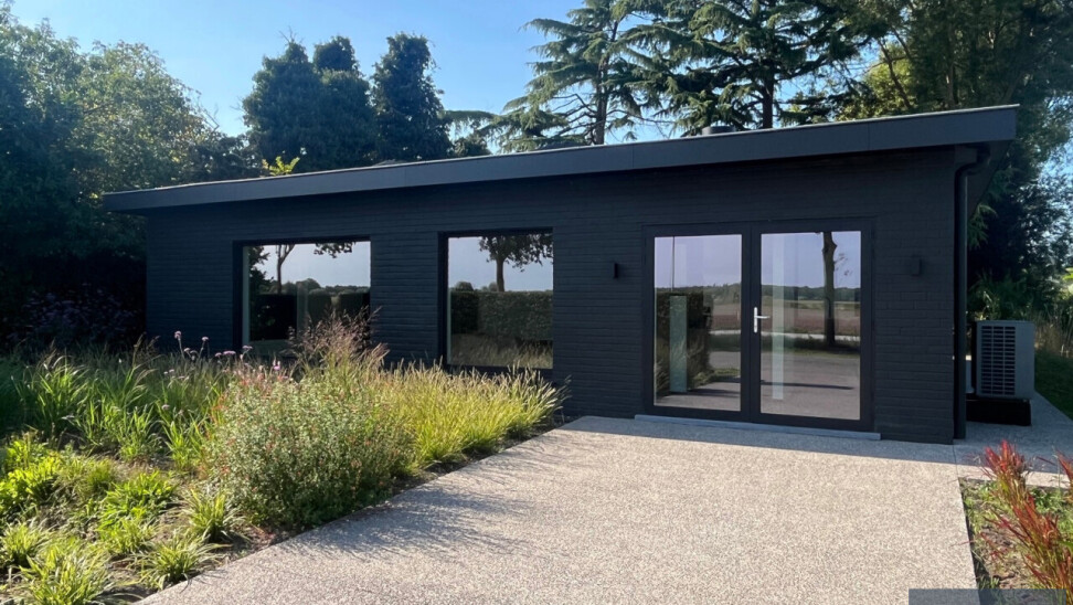 Buiten: aangelegde voortuin met oprit en achtertuin met betonplaat voor tuinhuis.