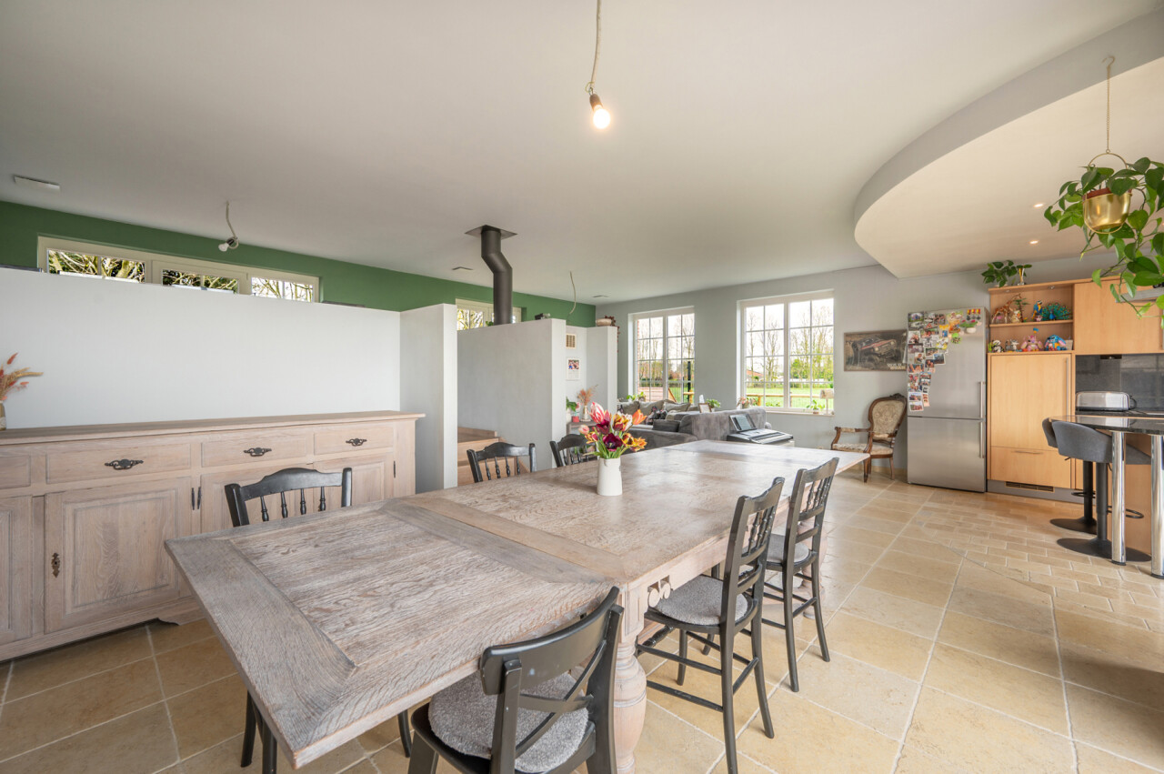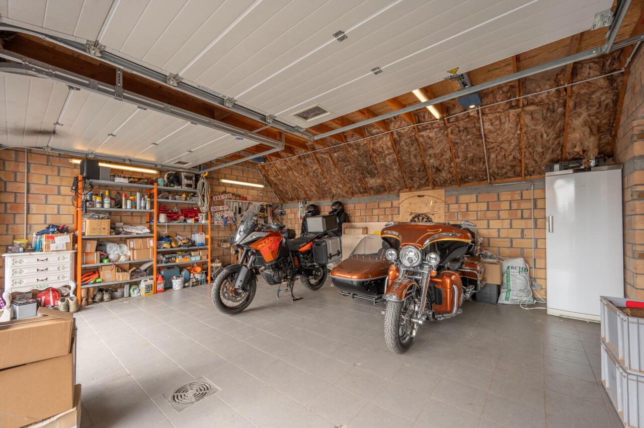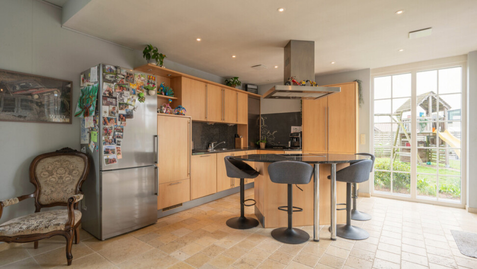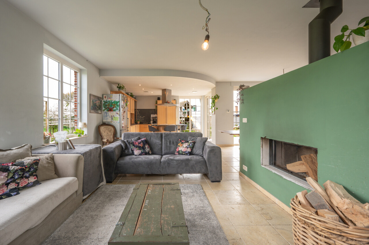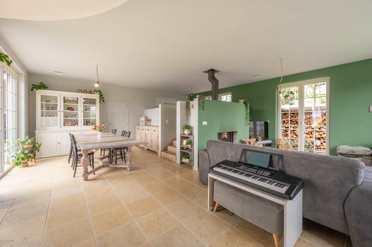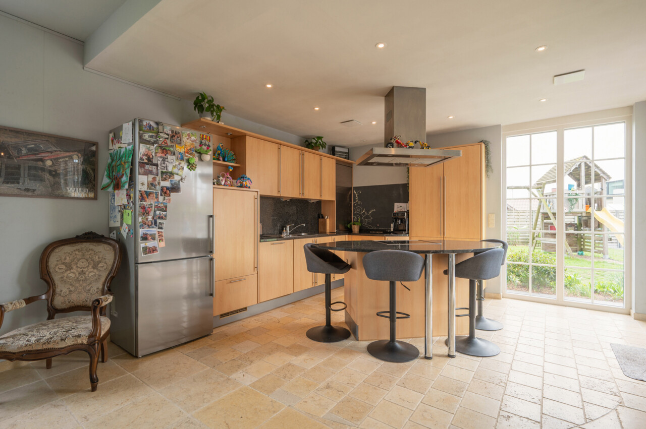 -Gelijkvloers: inkom met gastentoilet, lichtrijke en zongerichte leefruimte met zithoek (houthaard) en eetplaats, uitgeruste open keuken met eiland, toegang tot de kelder en bureau op de voute boven de kelder, berging, hal en dubbele garage met zolder boven.