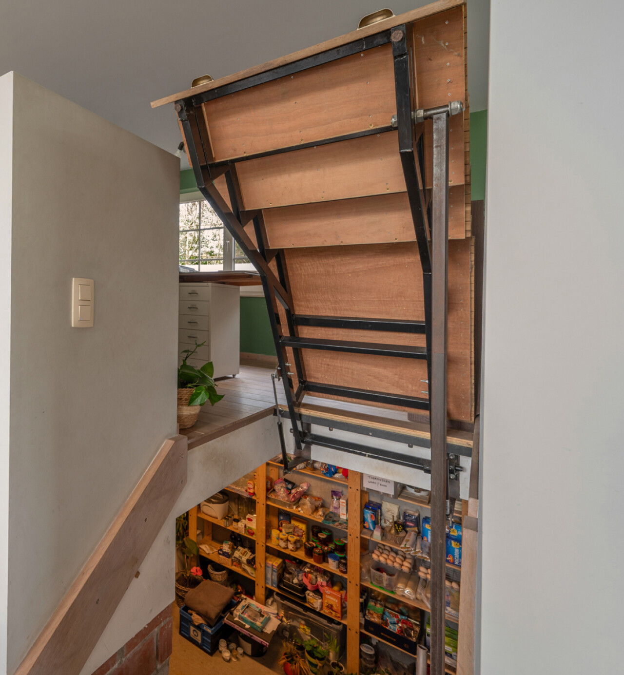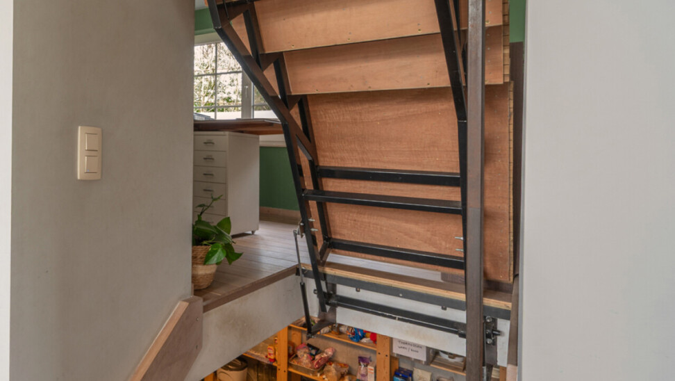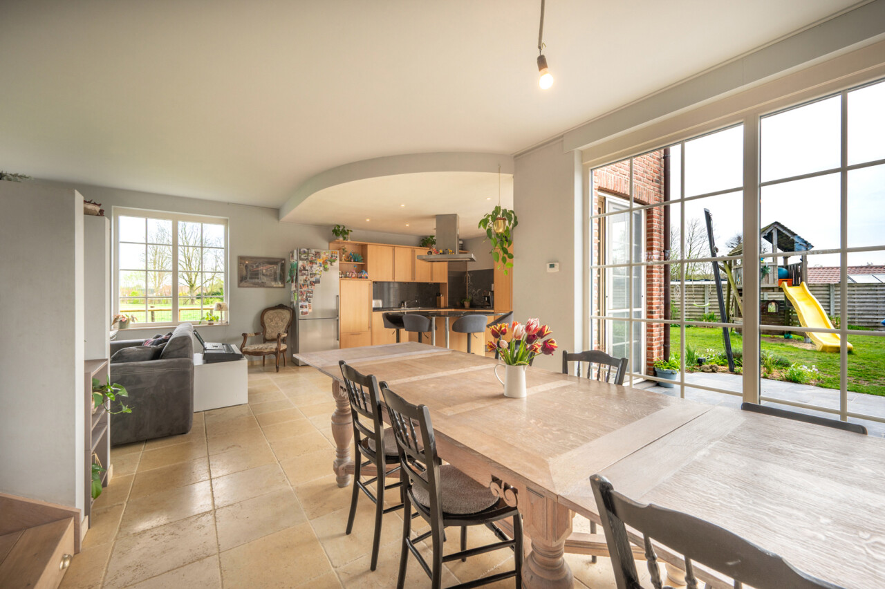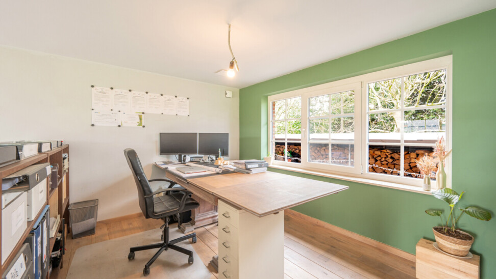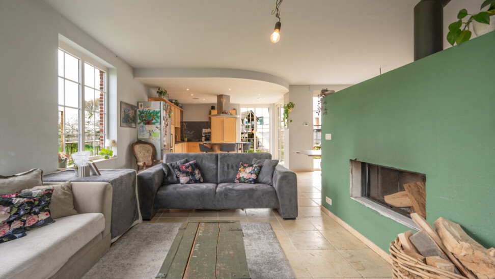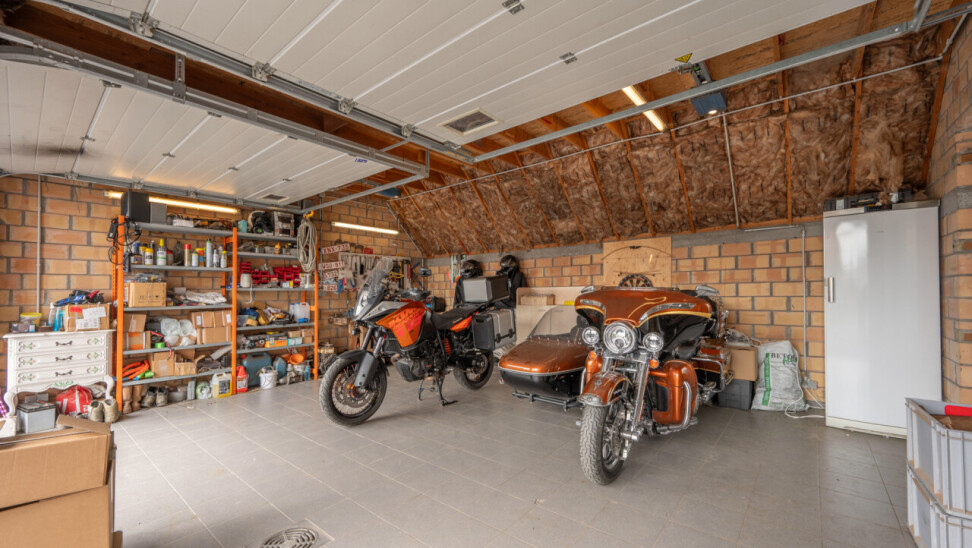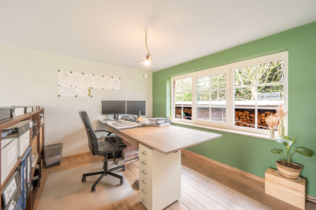 -Gelijkvloers: inkom met gastentoilet, lichtrijke en zongerichte leefruimte met zithoek (houthaard) en eetplaats, uitgeruste open keuken met eiland, toegang tot de kelder en bureau op de voute boven de kelder, berging, hal en dubbele garage met zolder boven.