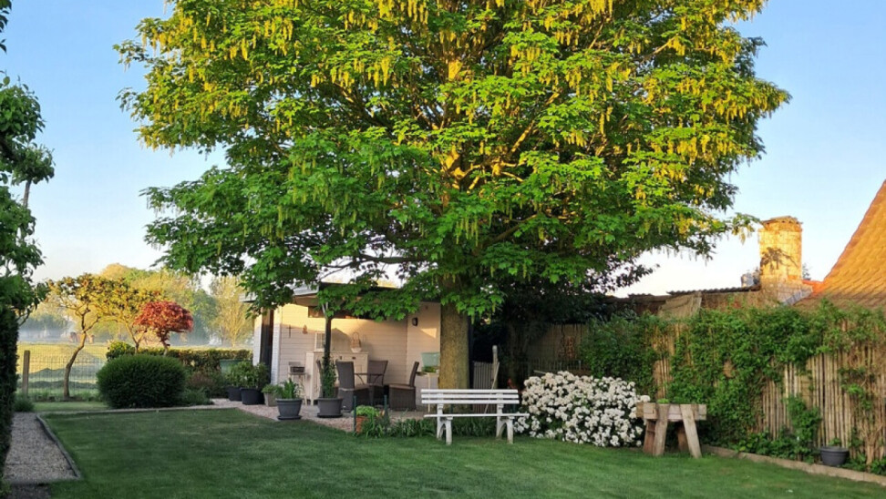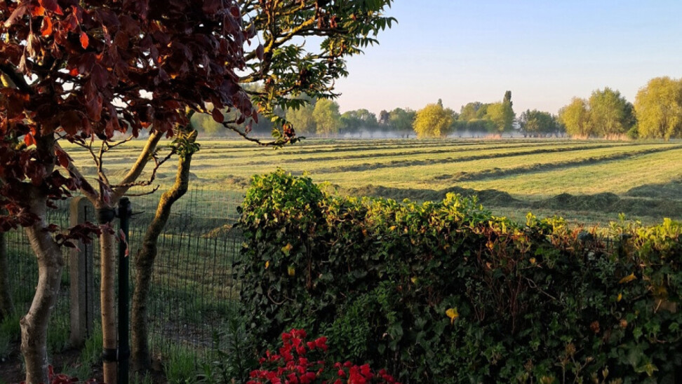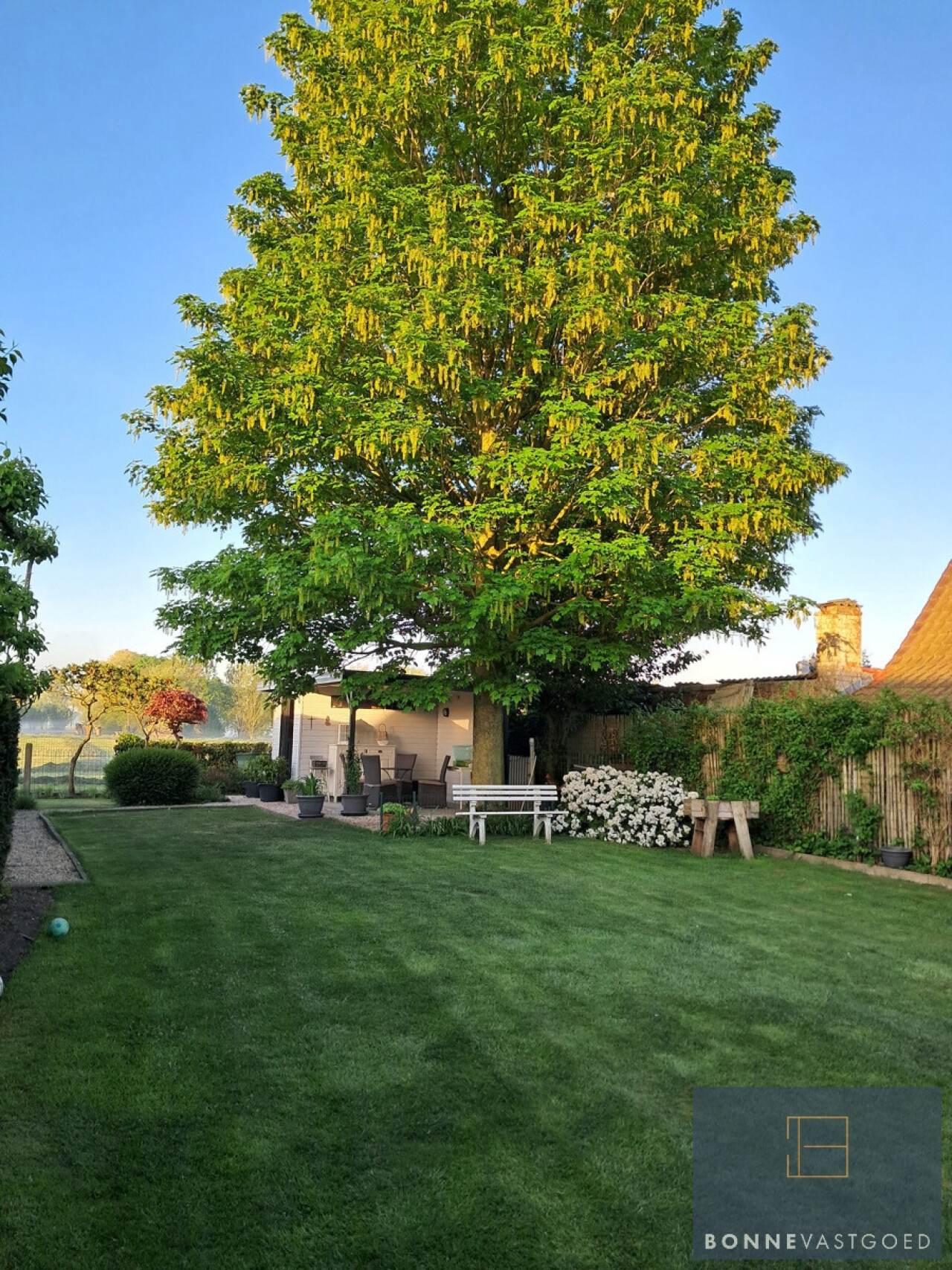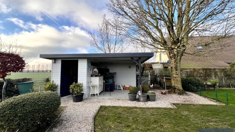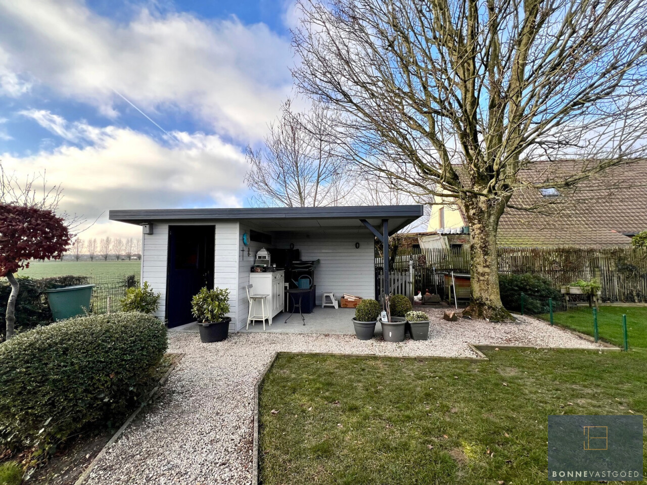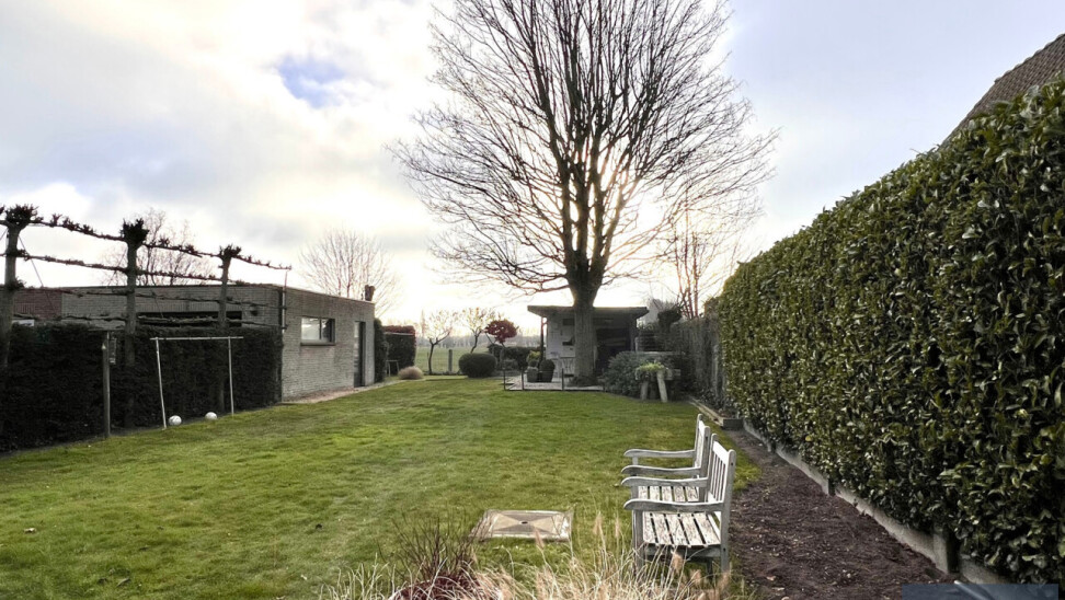 Buitenaanleg: ruime oprit met plaats voor meerdere wagens - garage - volledig omheinde en aangelegde tuin met verschillende terrassen waardoor het overal genieten is - open zicht op velden - vijver