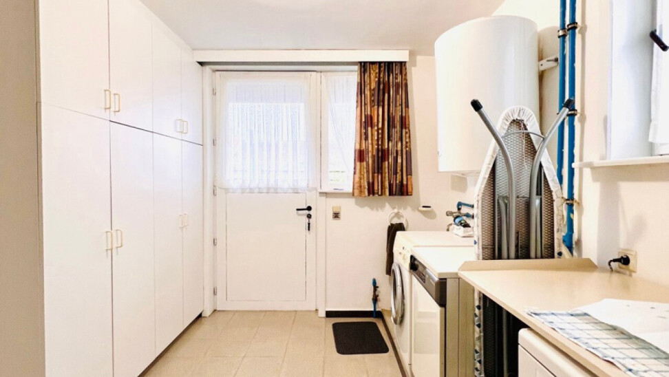 Gelijkvloers: open inkomhal met veel natuurlijke lichtinval - gastentoilet - woonkamer met zithoek en eetplaats, hier is het in alle gezelligheid genieten aan de houtkachel - veranda die zorgt voor het echte binnen-buiten gevoel - ruime keuken voorzien van alle toestellen, voldoende werkruimte en eetplaats - praktische wasplaats/berging - koele berging