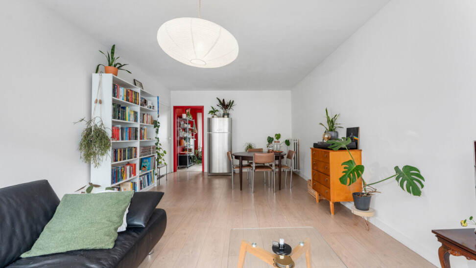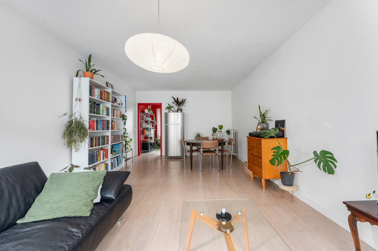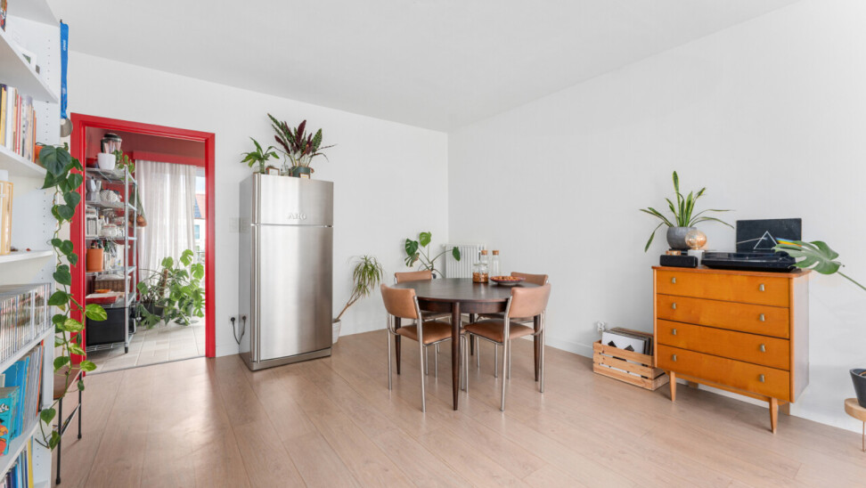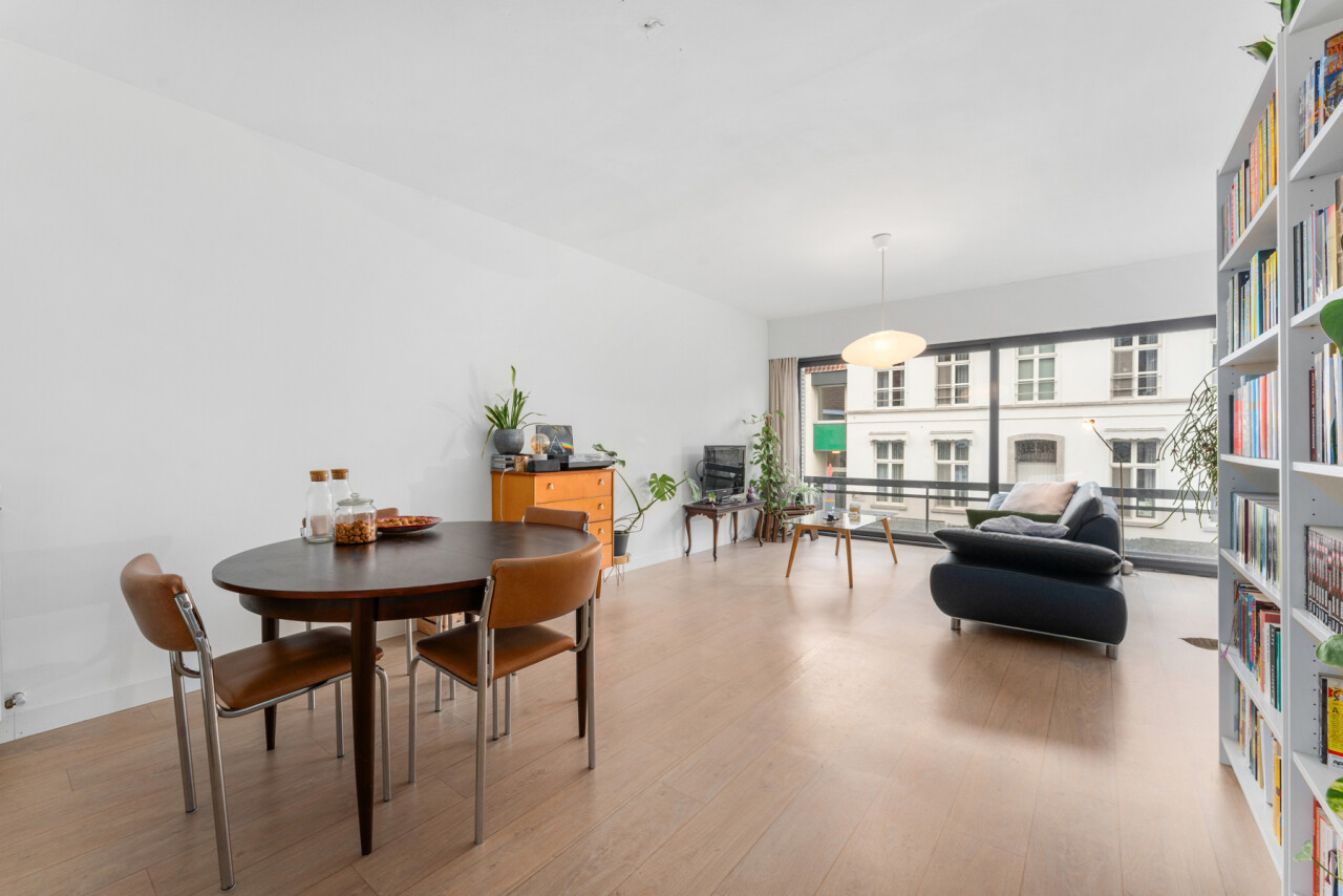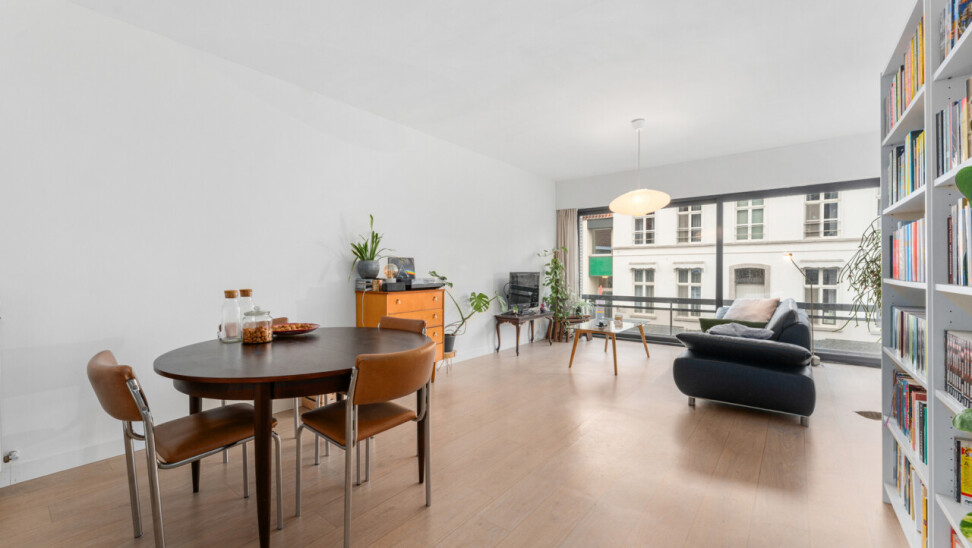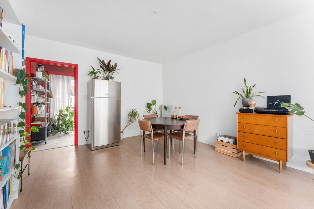 Eerste verdieping: leefruimte met zithoek en eetplaats, keuken en toegang tot het terras.