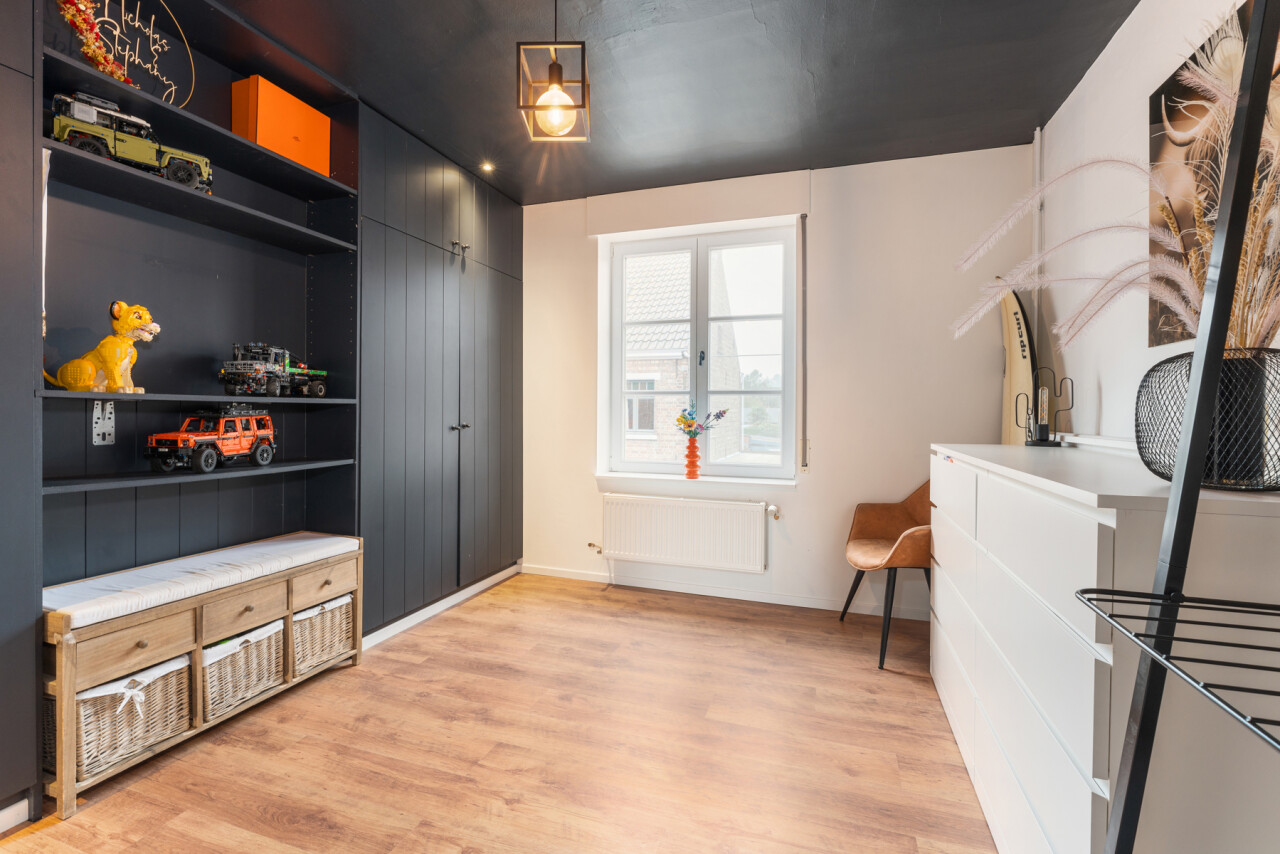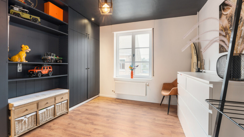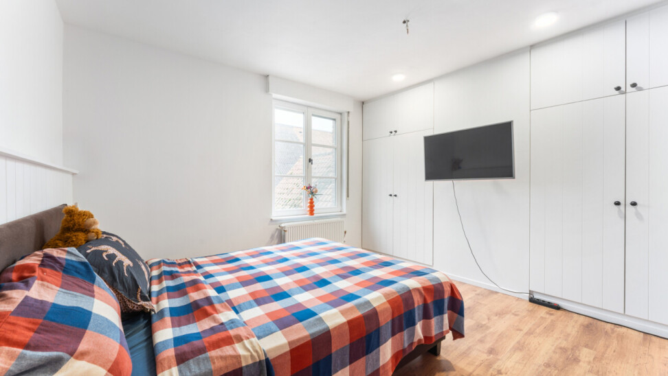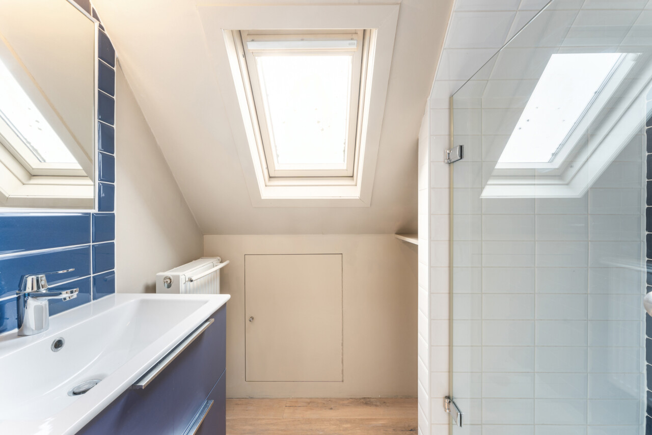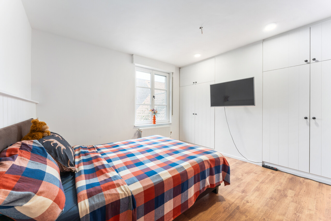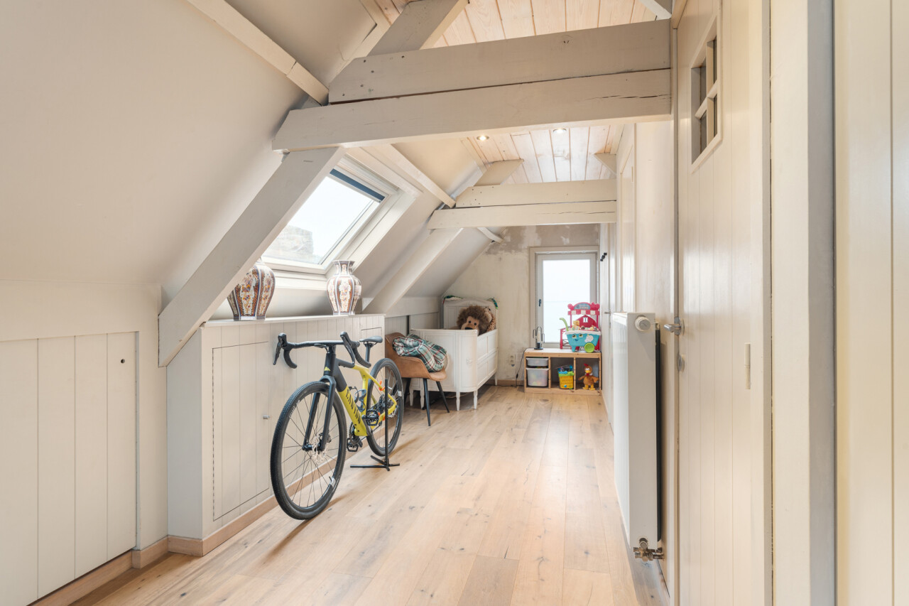 -tweede verdieping: grote slaapkamer met maatkasten onder het hellend dak, aparte douchekamer en apart toilet.