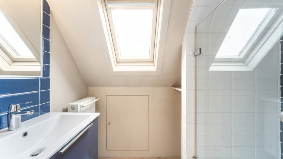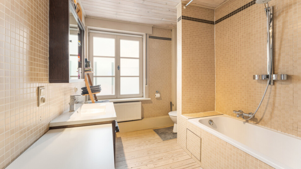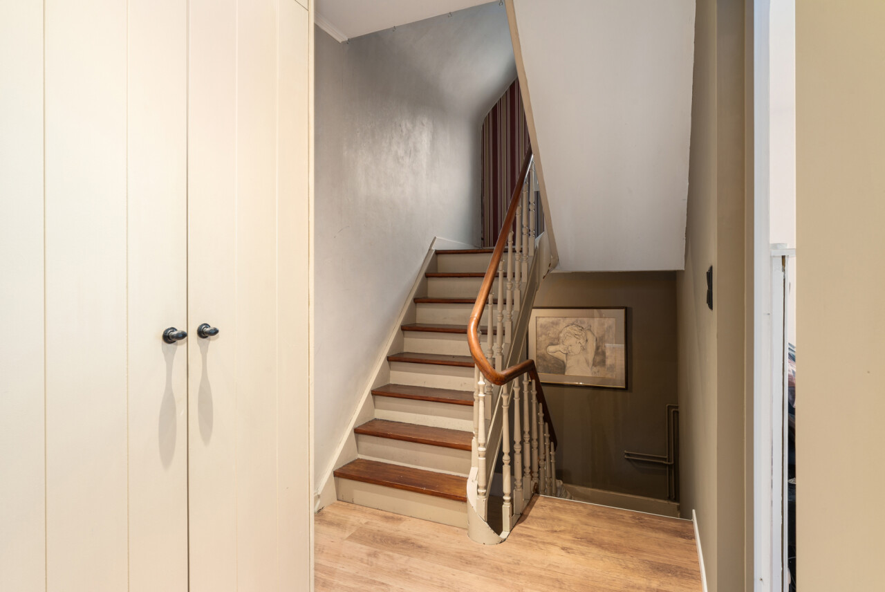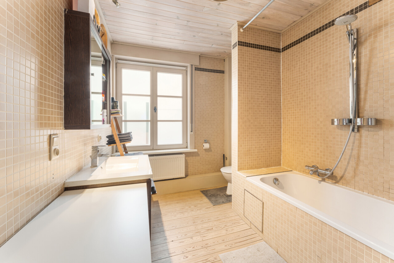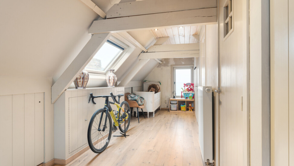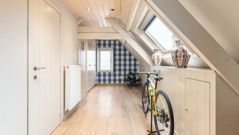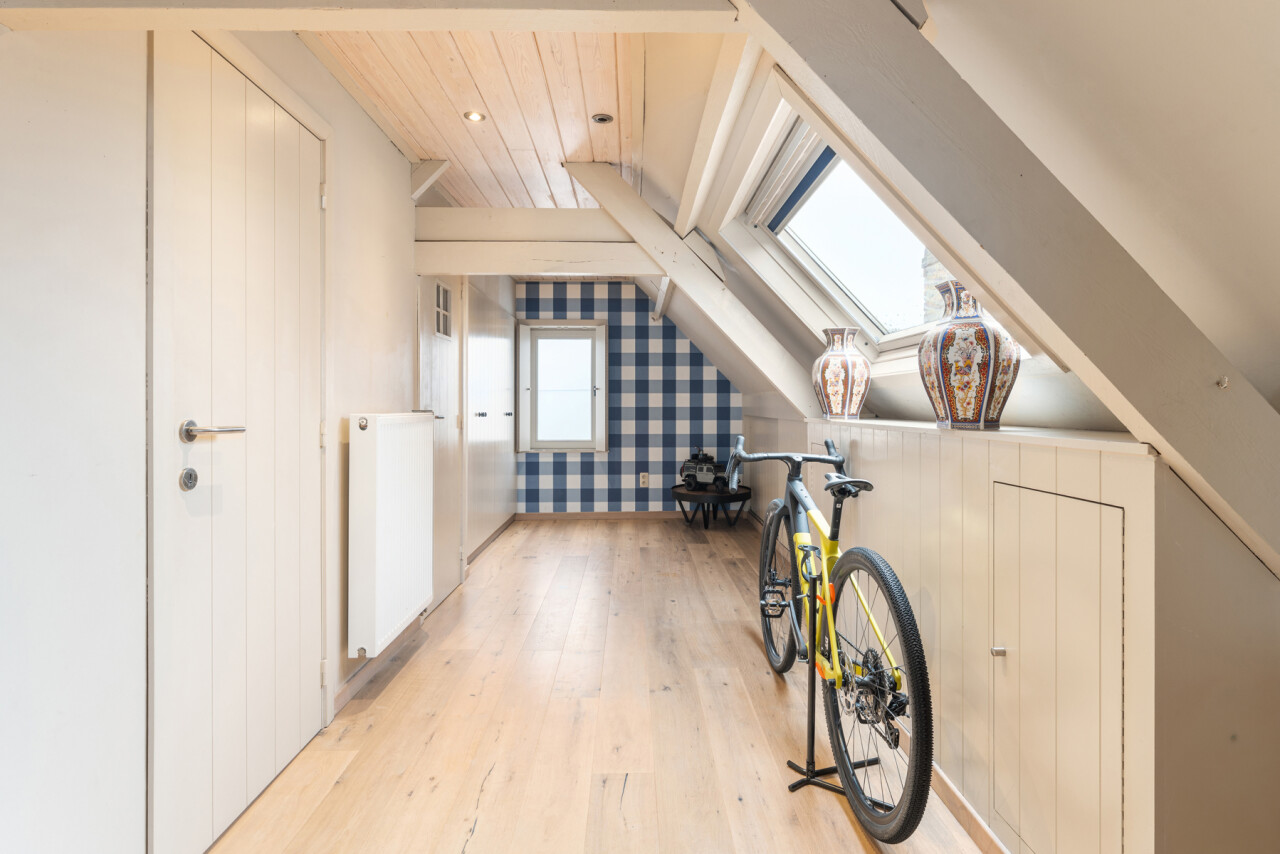 -tweede verdieping: grote slaapkamer met maatkasten onder het hellend dak, aparte douchekamer en apart toilet.