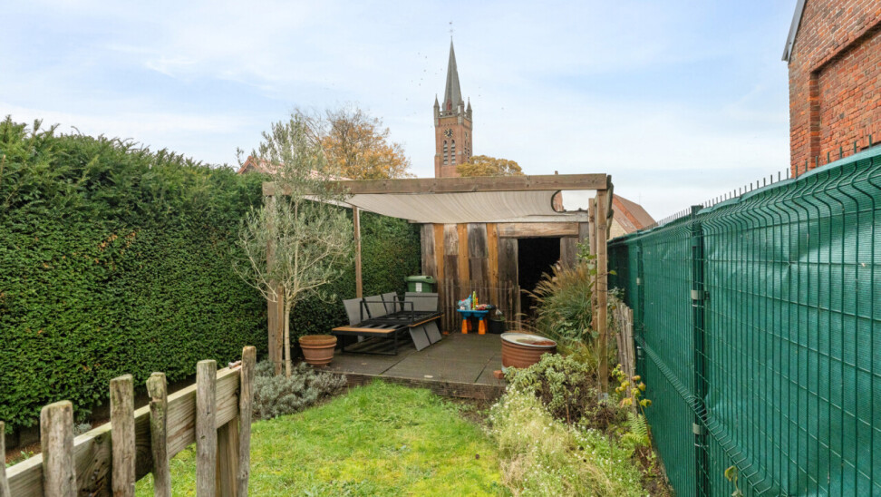 Buiten: tuin met terras, buitenberging, overdekt terras en nieuwe afsluiting.