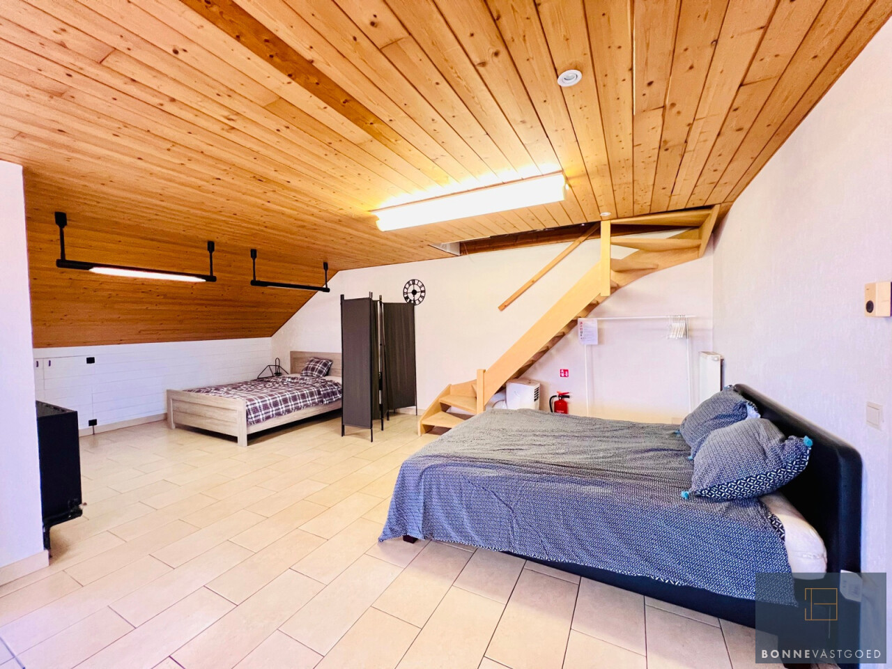 Het verdiep bestaat uit een grote polyvalente ruimte die perfect in de delen is tot meerdere slaapkamers waardoor de woning dienst kan doen voor een groot gezin. Kan eveneens ingedeeld worden tot woonkamer met slaapkamers en keuken – badkamer met douche, lavabo en toilet met afzonderlijke boiler – mogelijkheid tot dakterras