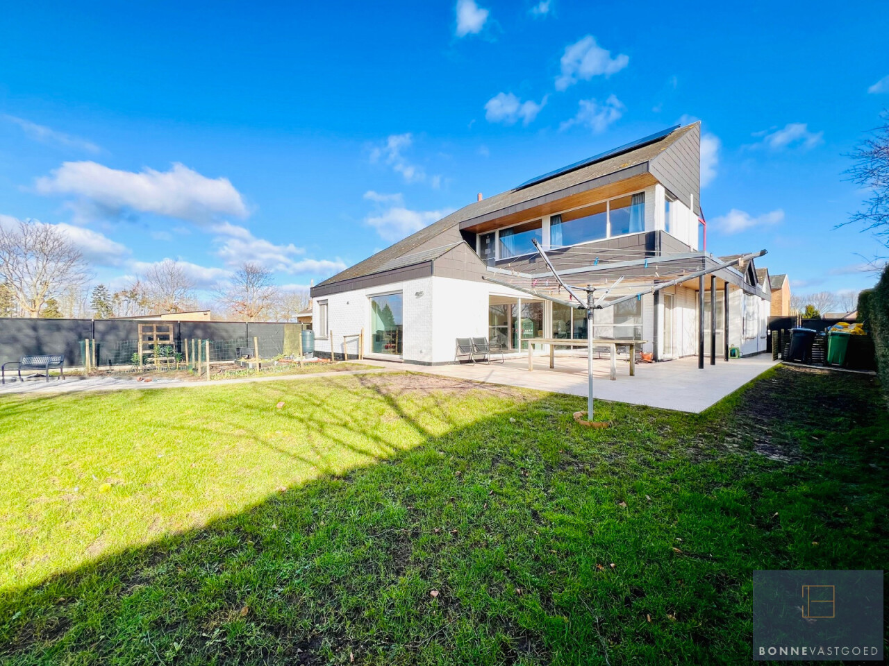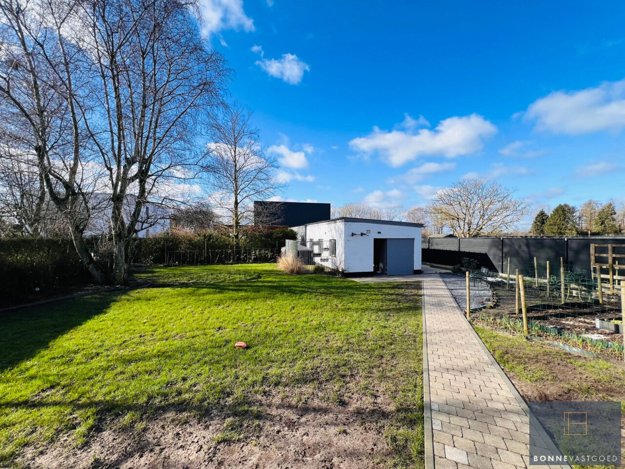 Buiten: ruime oprit met plaats voor meerdere wagens – laadpaal – aangelegde, volledig omheinde tuin met drainage systeem – nieuw aangelegd terras - moestuin – garage/bijgebouw met meerdere mogelijkheden