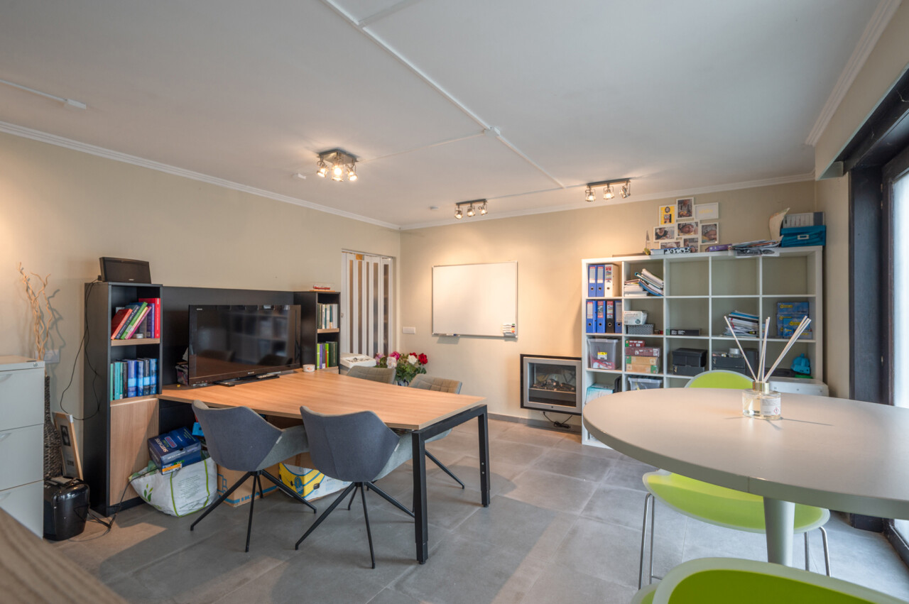Gelijkvloers: inkom, gastentoilet, leefruimte, open keuken (Dovy- met eiland, kookplaat, dampkap, oven, microgolfoven, koelkast en spoelzone), berging (met aansluitingen wasmachine, droogkast en waterverzachter), garage met nieuwe automatische poort. Naarnaast is er het kantoor met de aparte toegangsdeur.