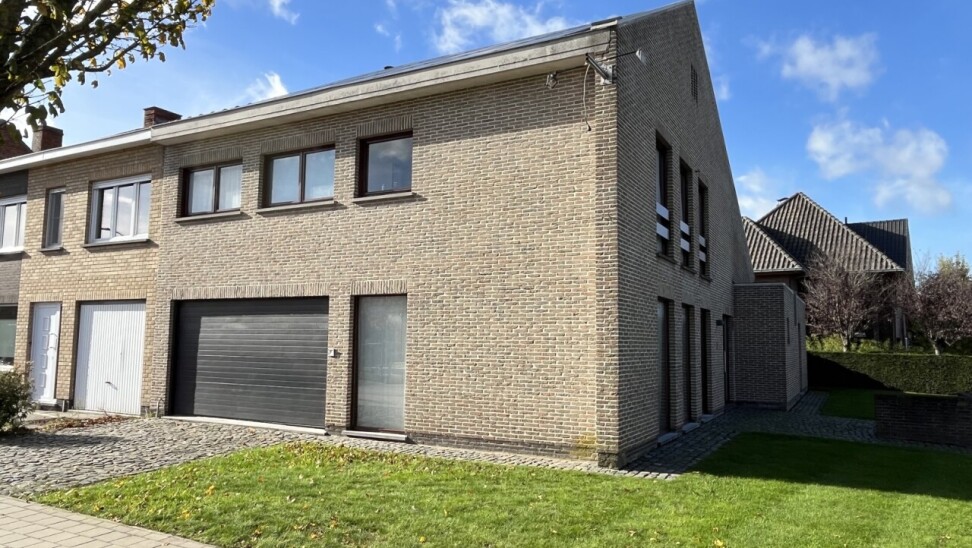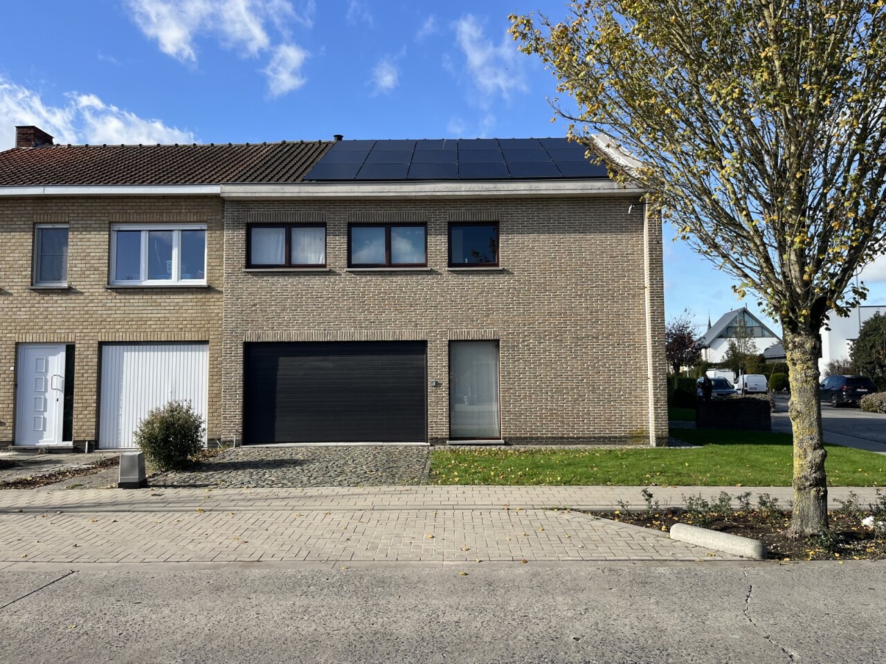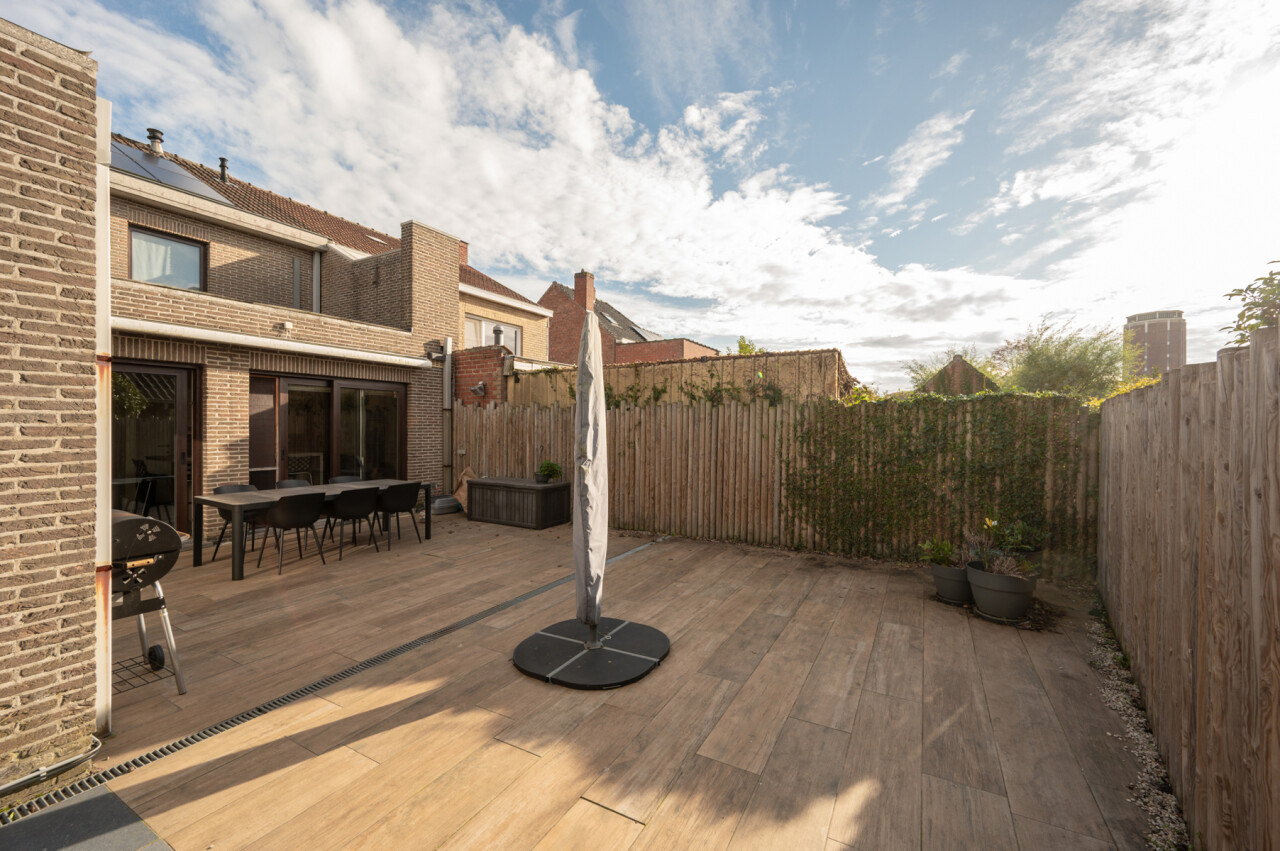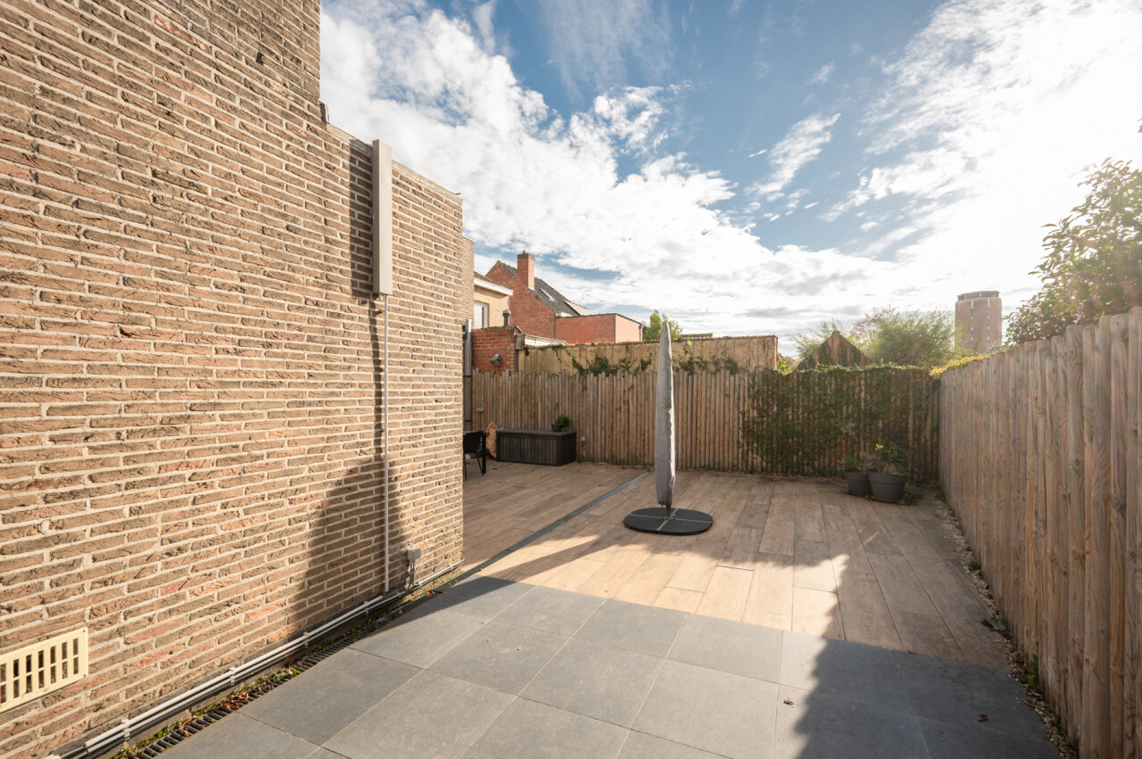 Buiten: voortuin met oprit, achtertuin (volledig omheid + onderhoudsvrij), met terras en zonneluifel.
