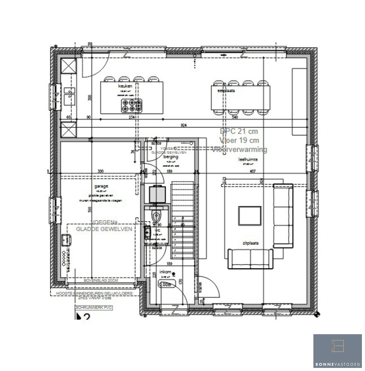 Gelijkvloers: inkom, gastentoilet, leefruimte met open keuken en garage.