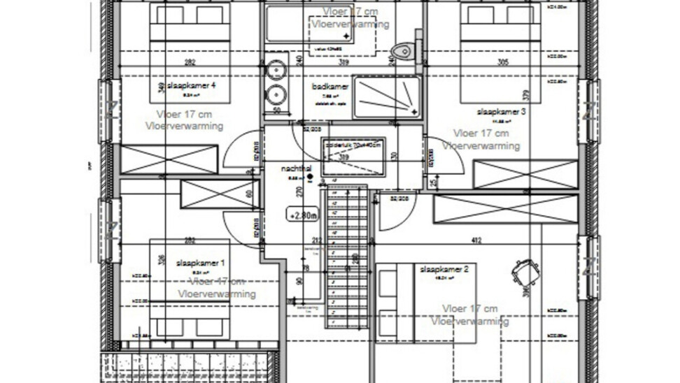 Eerste verdieping: 3 slaapkamers, toilet en badkamer (met ligbad, douche en lavabomeubel).