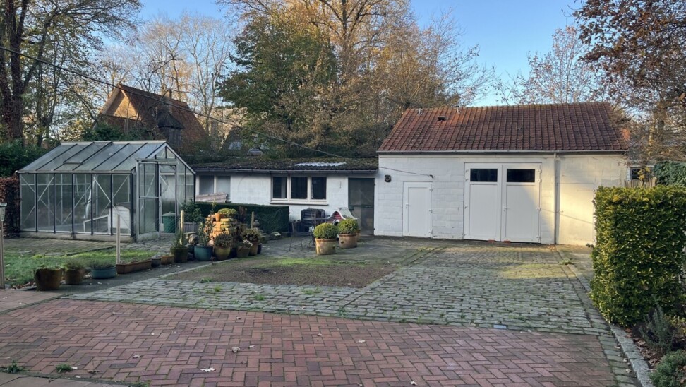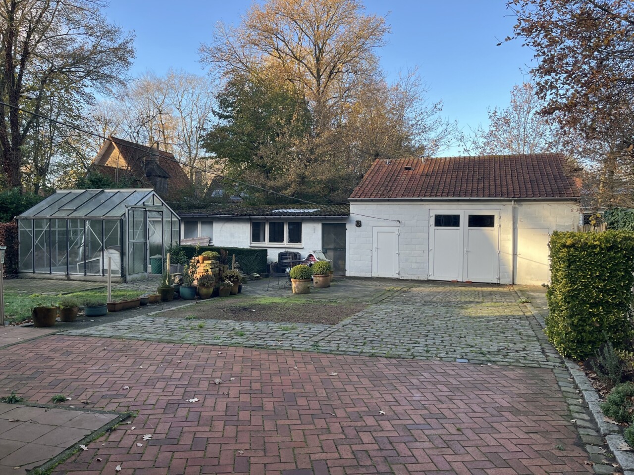 Buiten: oprit, voortuin, zijtuin, achtertuin met terras en bijgebouw/garage.