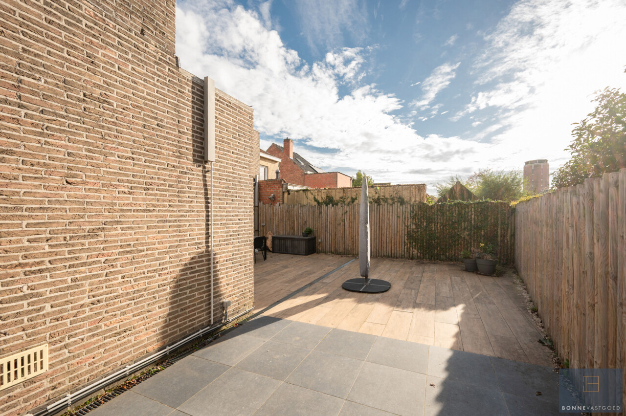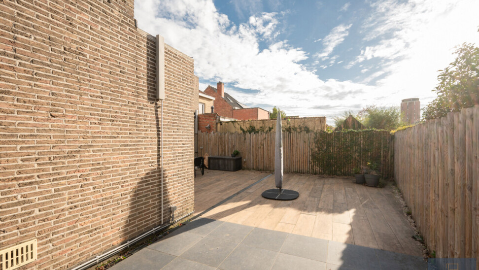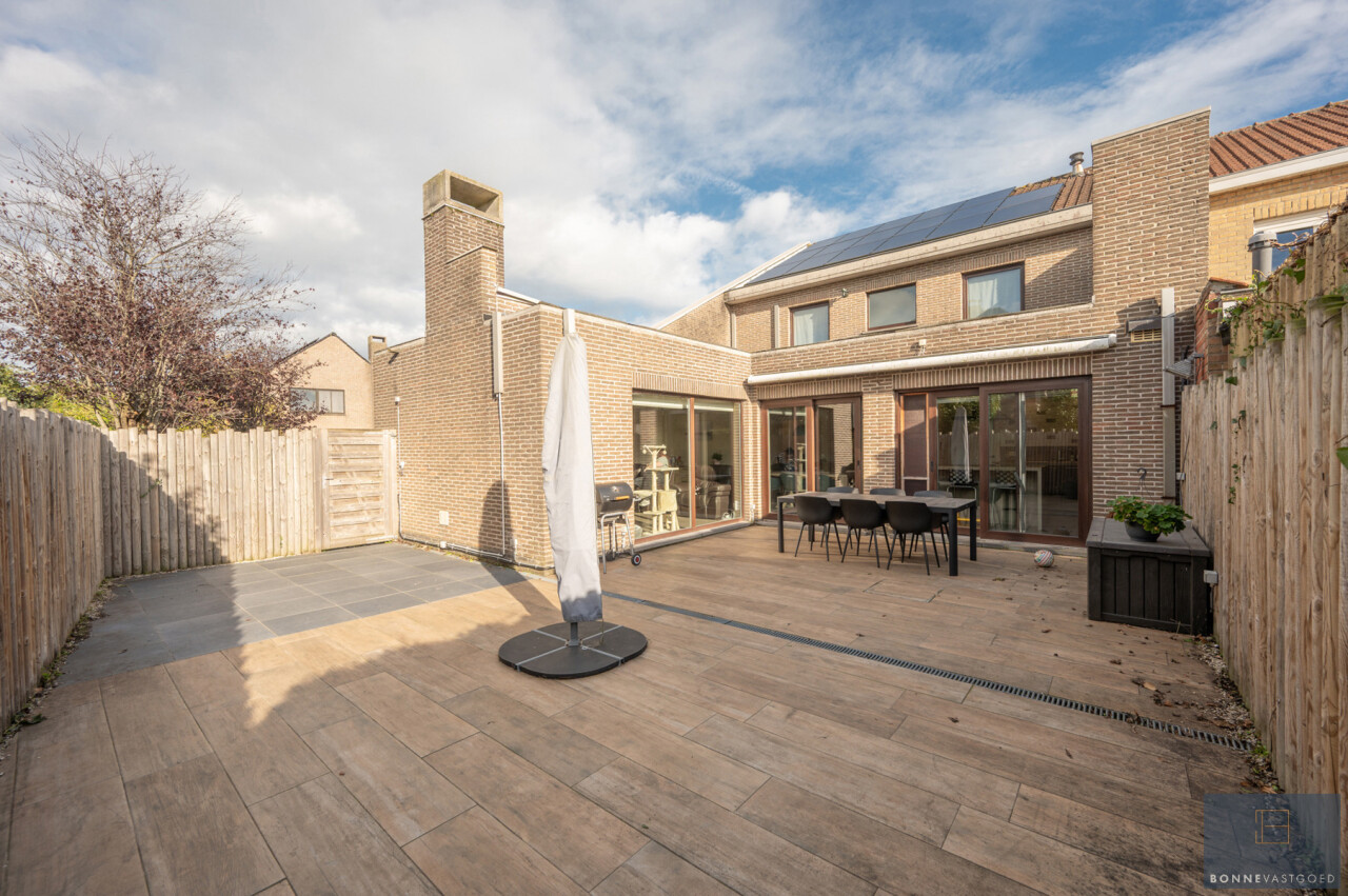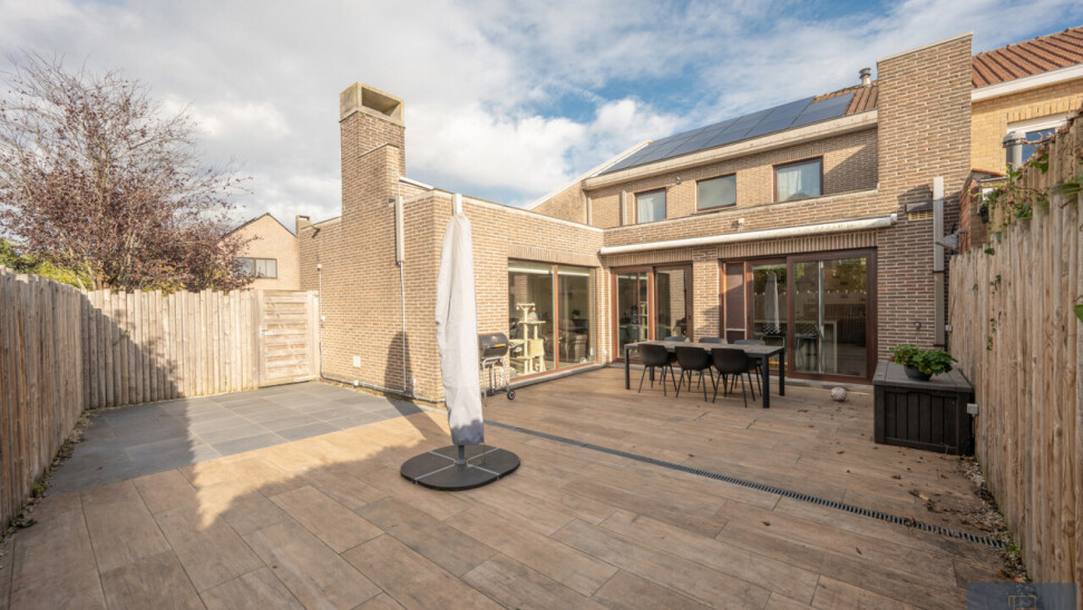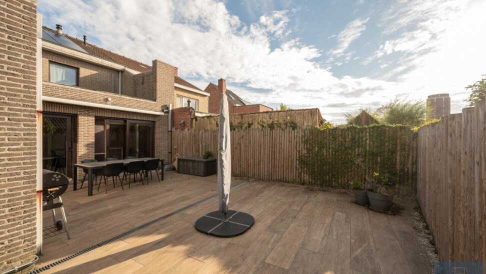 Buiten: voortuin met oprit, achtertuin (volledig omheid + onderhoudsvrij), met terras en zonneluifel.